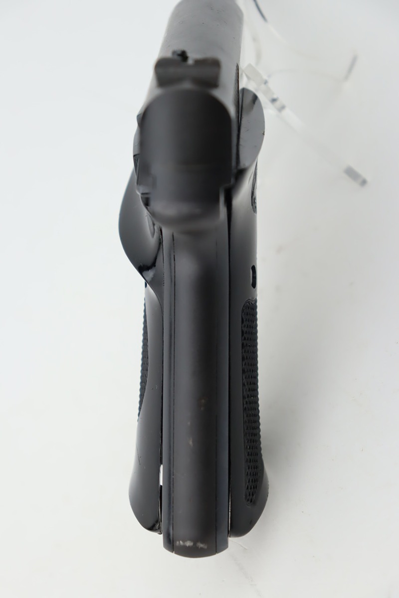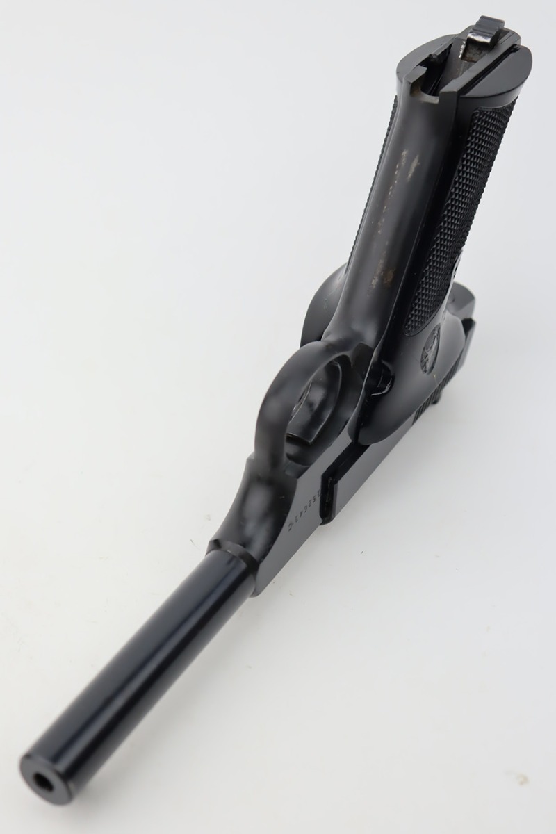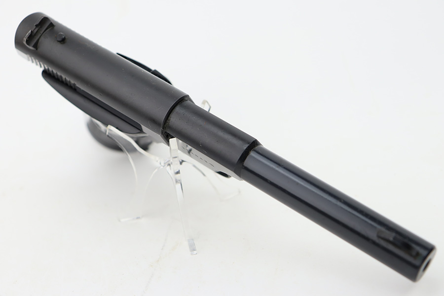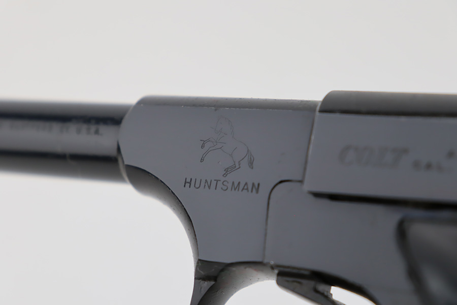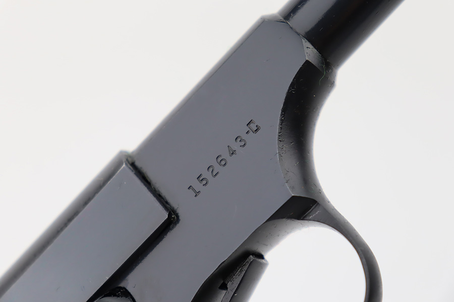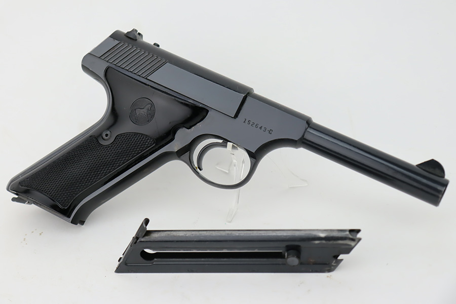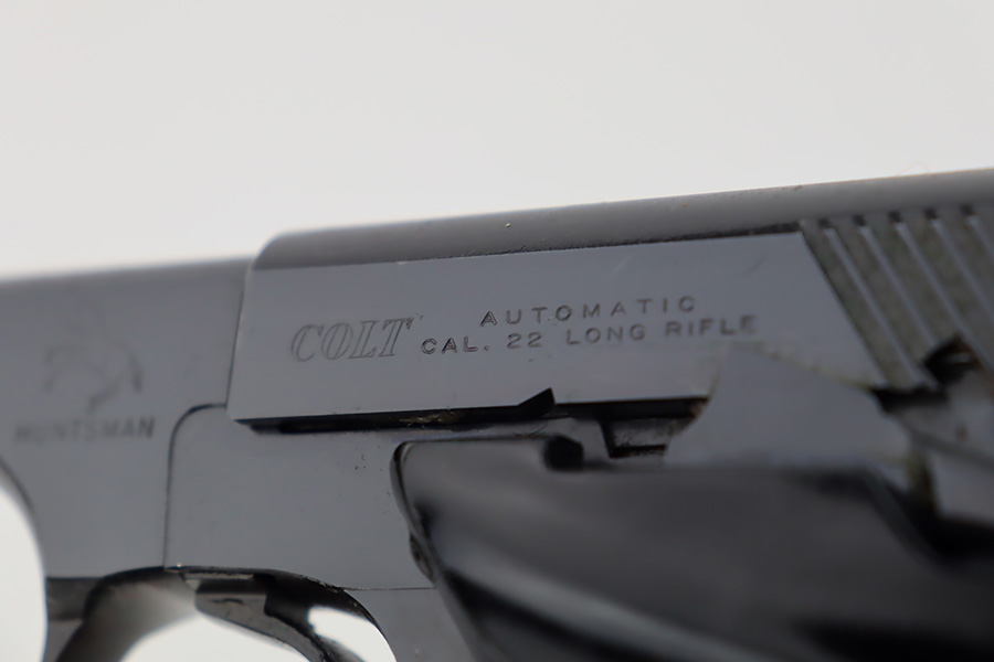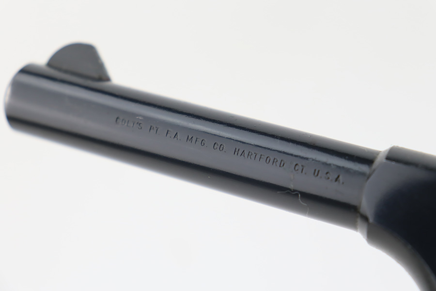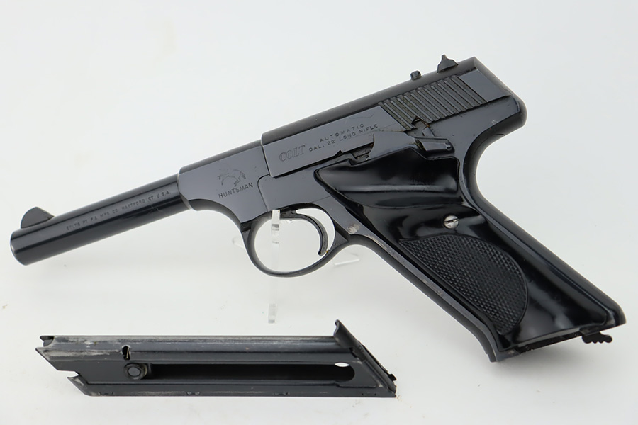 10/18/23 – This is an excellent Colt Huntsman, manufactured n 1960 and chambered in .22 LR. It has retained about 96% of its original finish with just a few small spots of discoloration on both sides of the frame and on the front strap. Fitted with excellent black bakelite grips and comes with one proper magazine. Mint bore.
