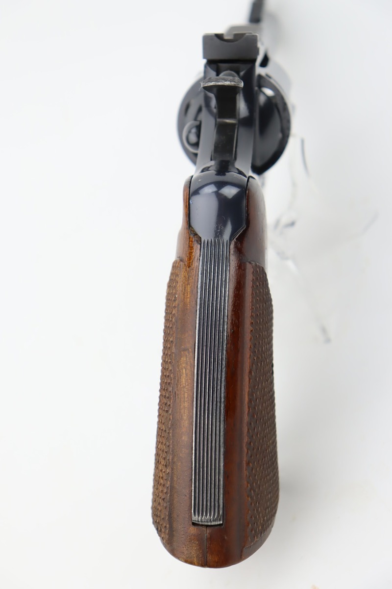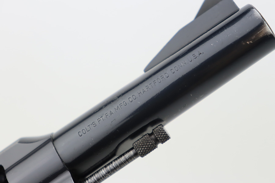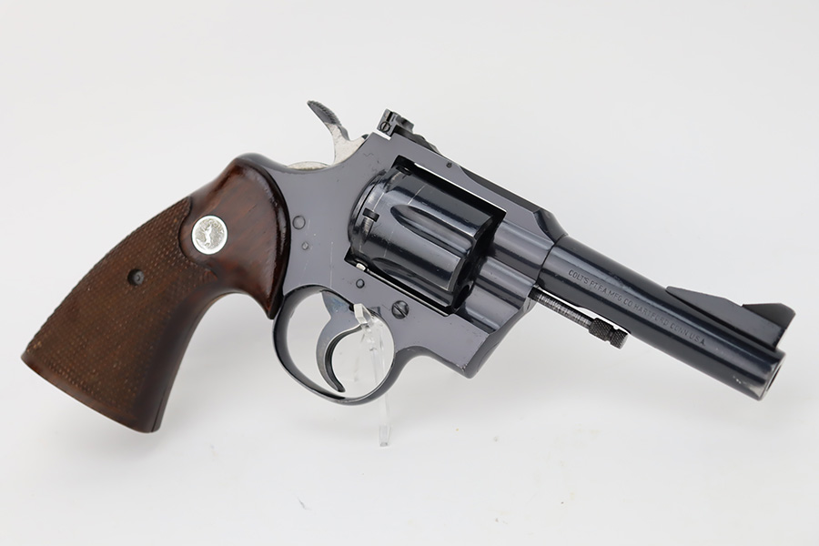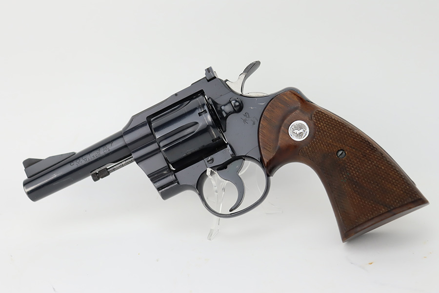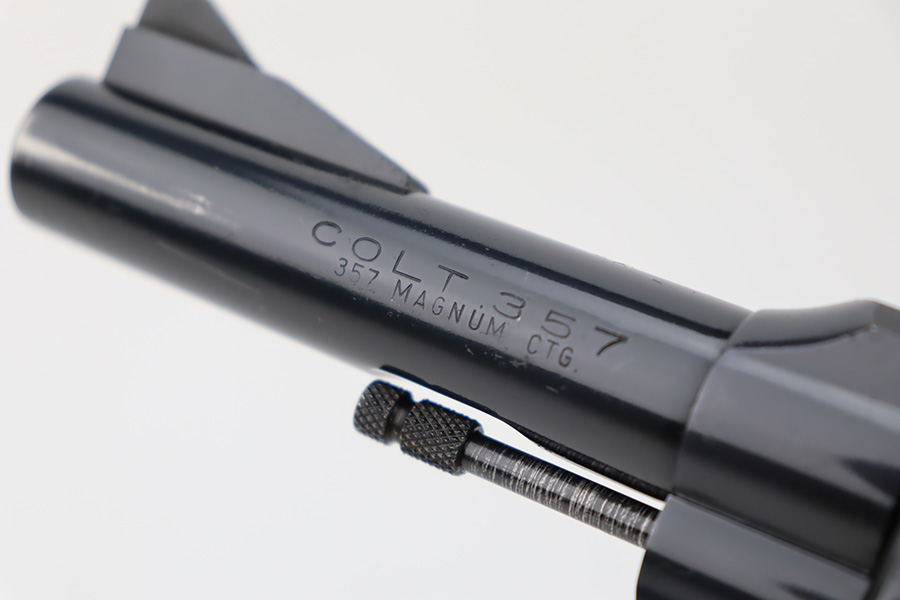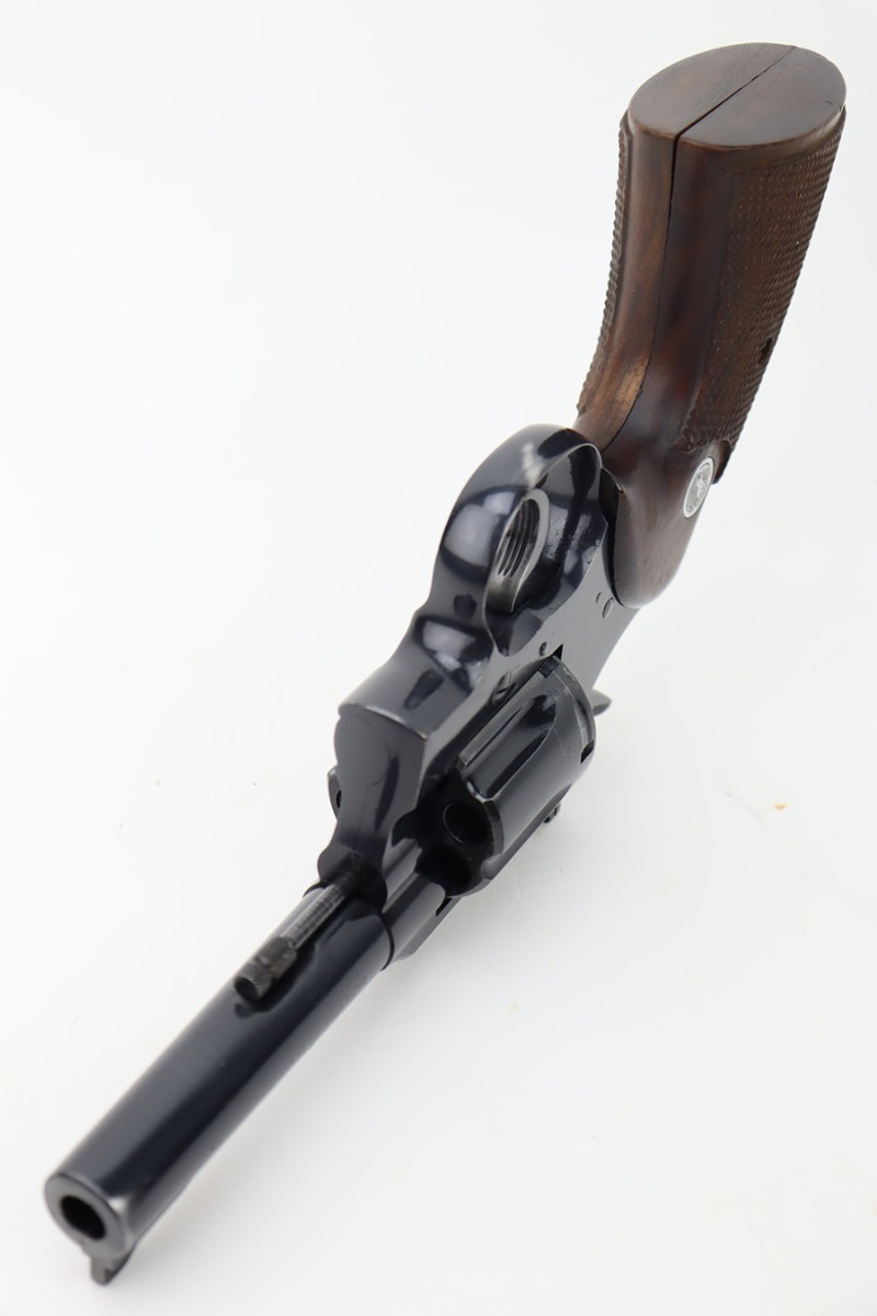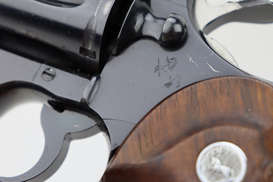 10/9/23 – This is an excellent Colt 357 Revolver, manufactured in 1961 and chambered in .357 Magnum. All matching. The high polish finish rates about 97-98% with minor muzzle wear and a couple of spots of light pin-pricking on the cylinder. A few very light surface scratches here and there. Fitted with excellent checkered Walnut grips. Mint bore.