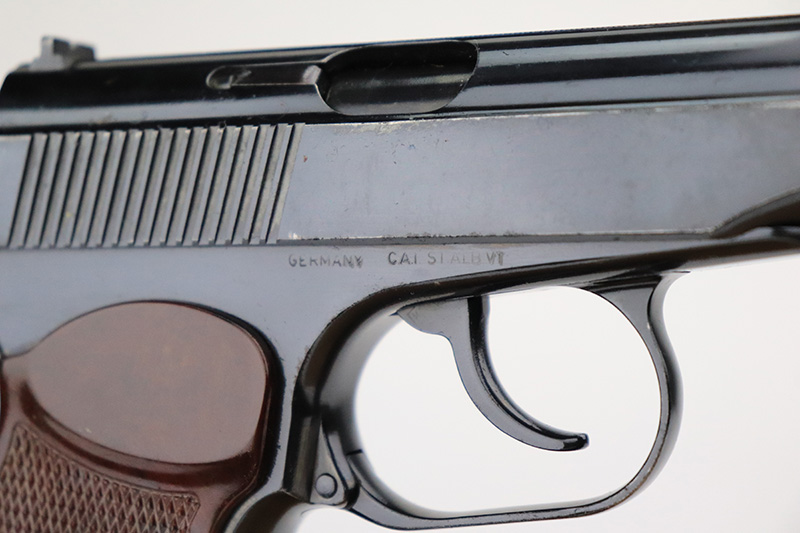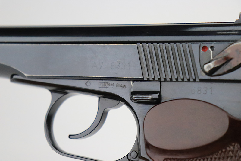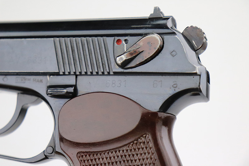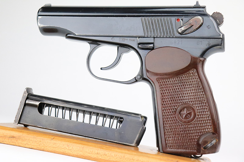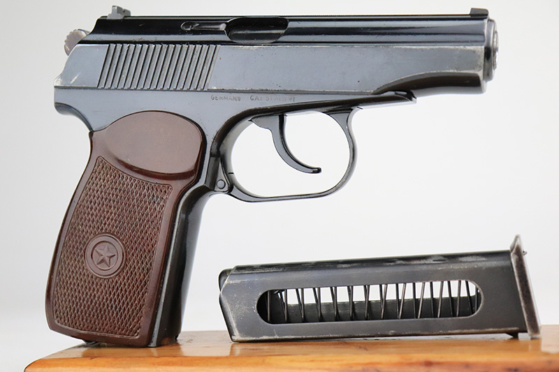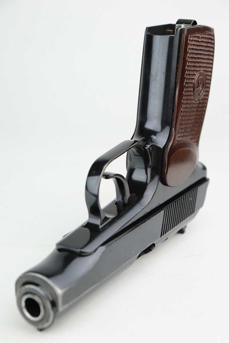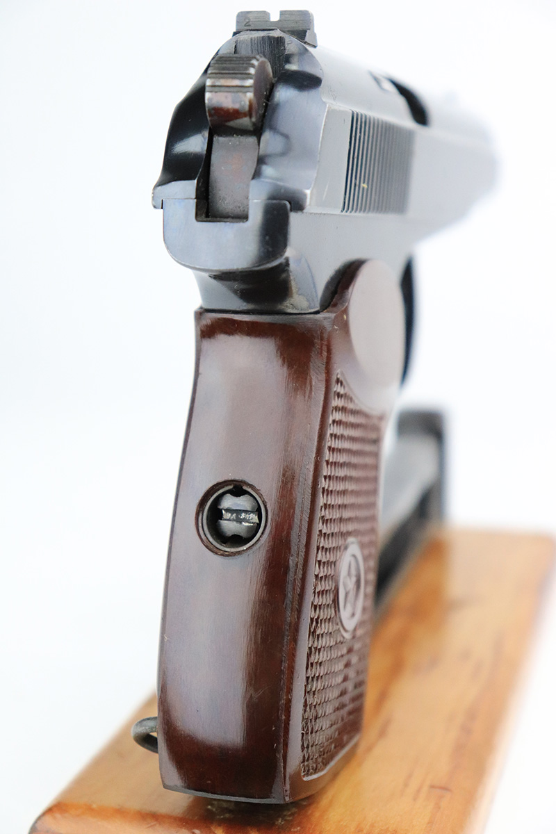 10/7/24 – This is an excellent example of a Makarov made in East Germany in 1961. It is all matching but has an import mark on the right side of the frame. It has retained about 97% of its high polish finish. There is minor muzzle wear and very light wear on some of the high edges of the slide. Very minor pin-pricking and a couple of small spots of wear on the front strap. Comes with an excellent reddish plastic grip and one proper magazine (not numbered). Minty bore.
