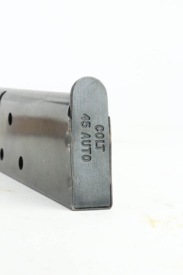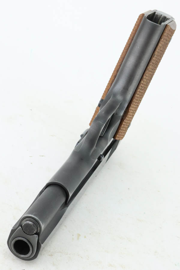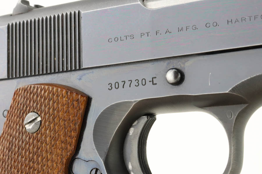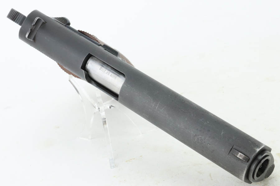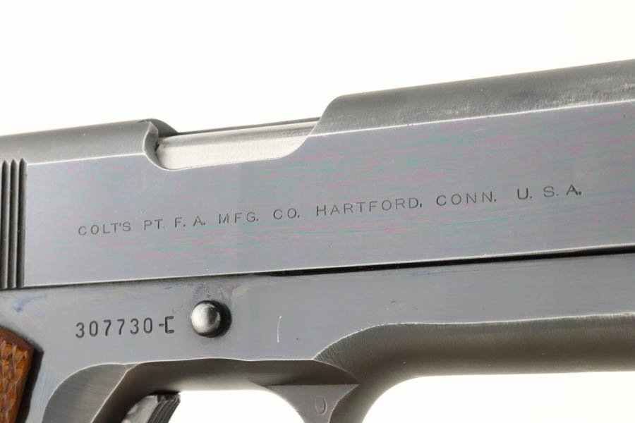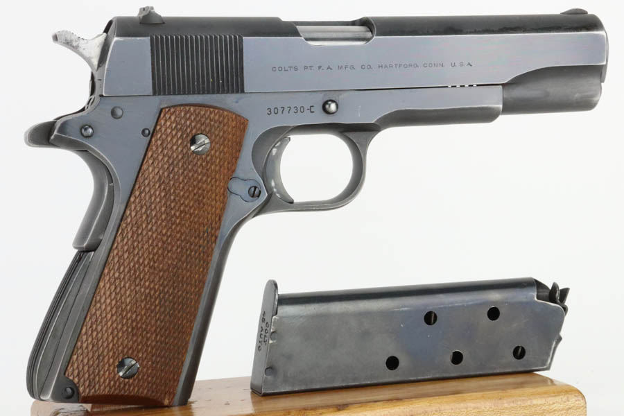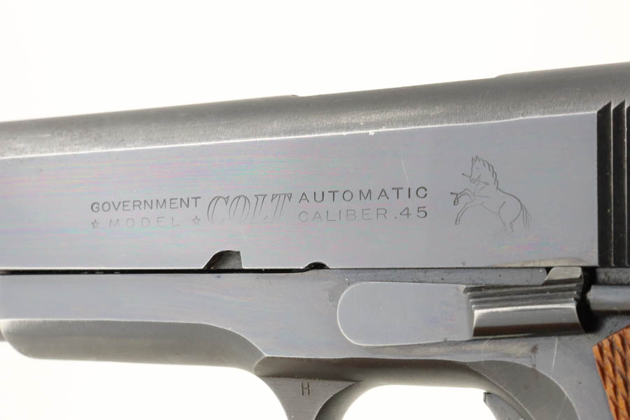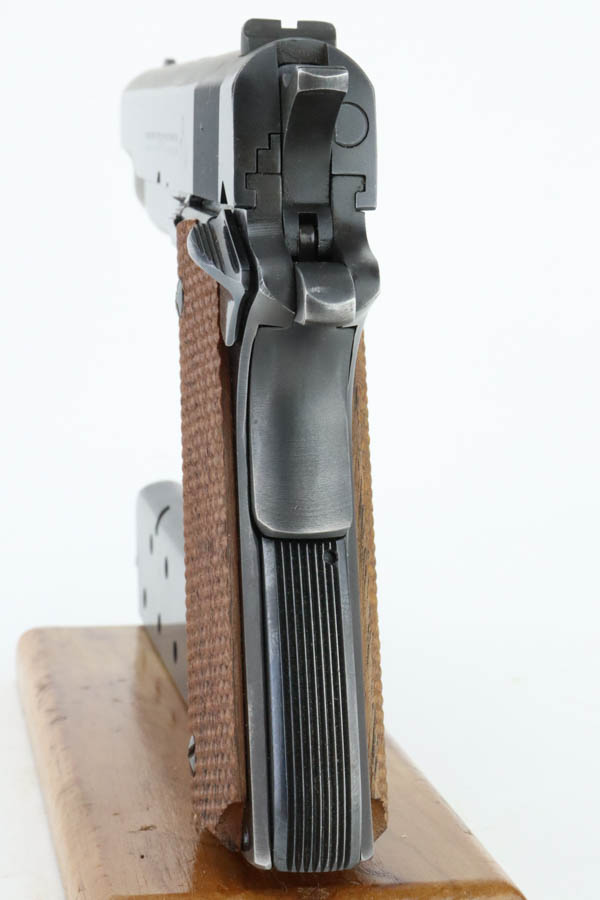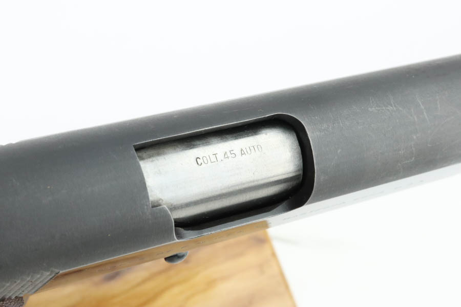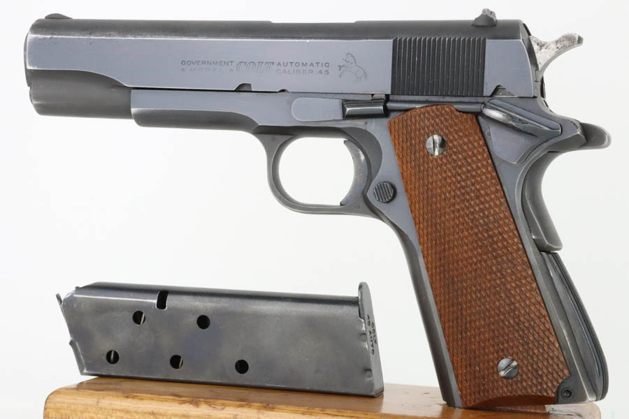 7/12/24 – This is an excellent example of a Colt Government Model, manufactured in 1966 and chambered in .45 ACP. Its original finish rates about 95-96% with general high edge wear, very minor thinning on the grip straps, some minor surface scuffs here and there, and an area of light freckling on the top of the slide. Fitted with excellent wood grips and comes with one proper magazine. Mint bore.
