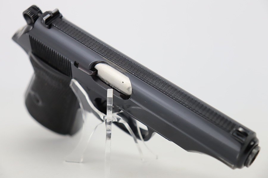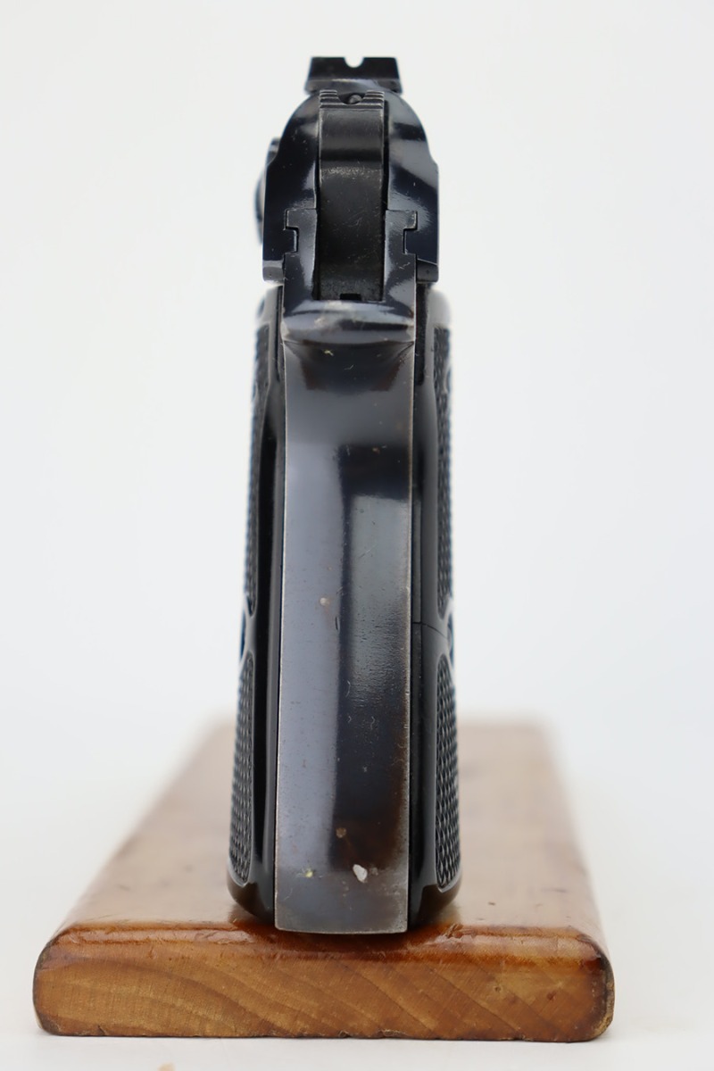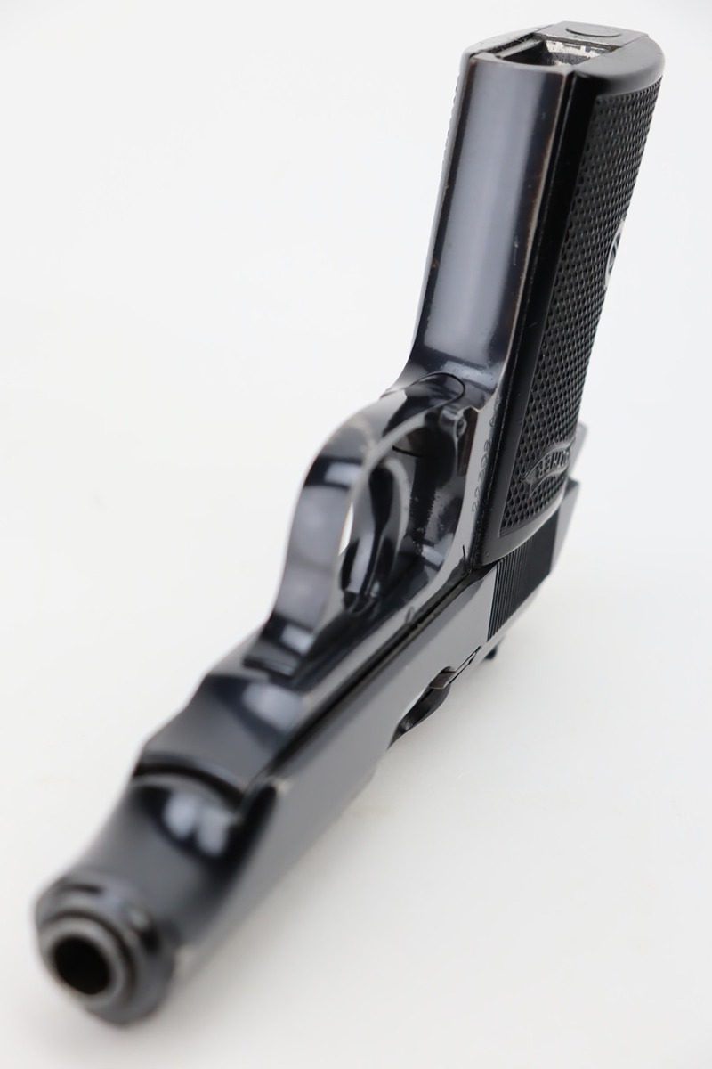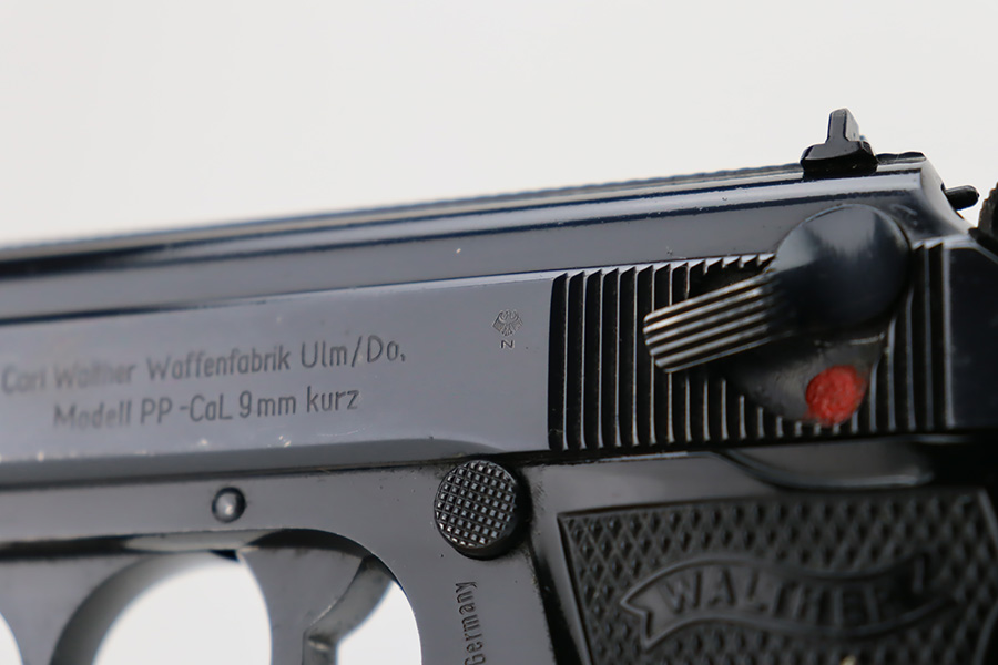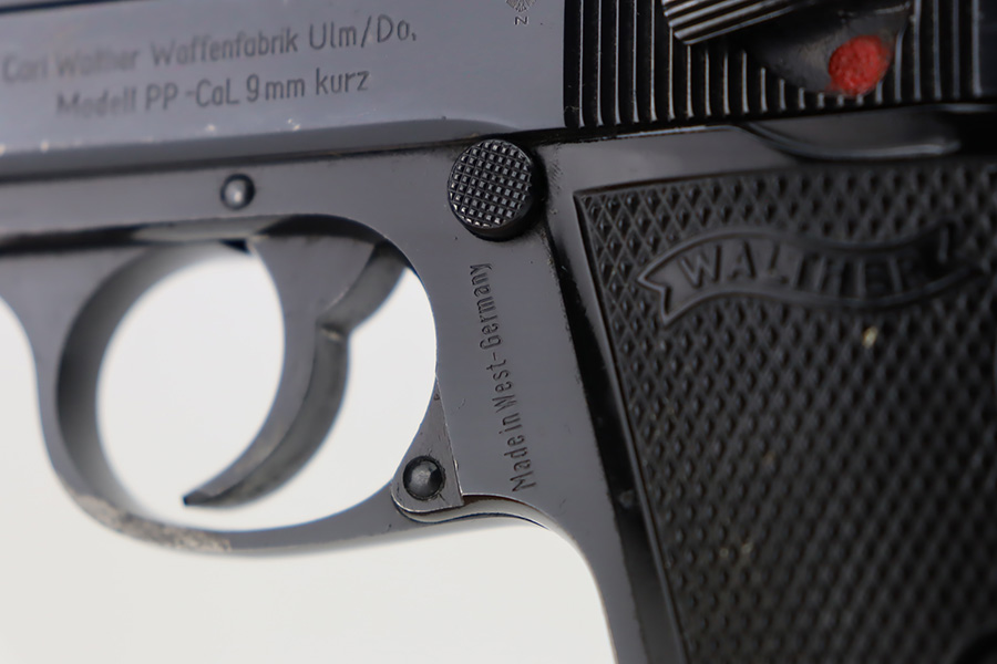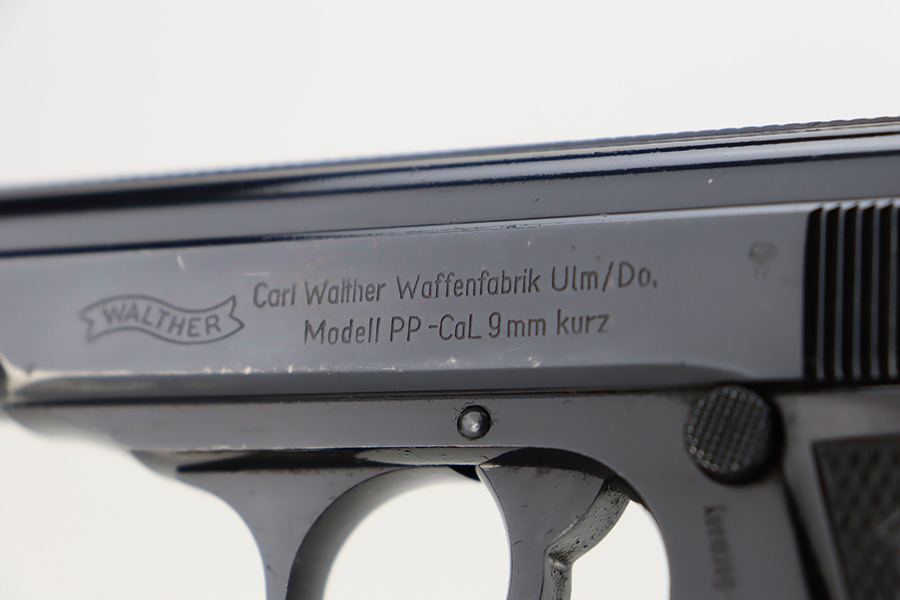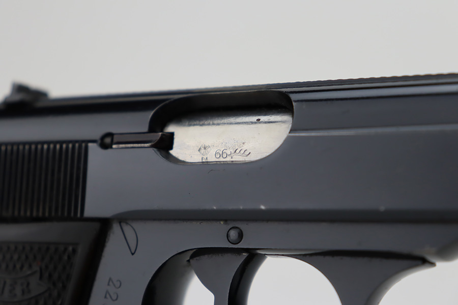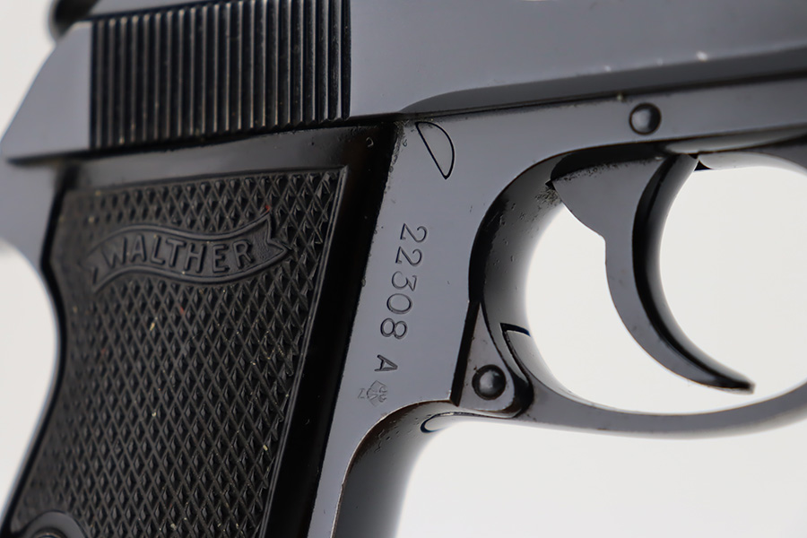10/19/23 – This is an excellent example of a Walther PP, manufactured in 1966 and chambered in 9mm kurz. All matching with no import marks. The original high polish bluing rates about 96-97% with minor high edge wear, some very light spotty wear on the back strap, and some tiny scratches and handling marks here and there. Fitted with excellent black plastic grips and comes with a finger extension magazine. Most of the bore is shiny with strong rifling, but there is some minor frosting around the muzzle end.