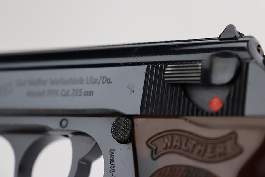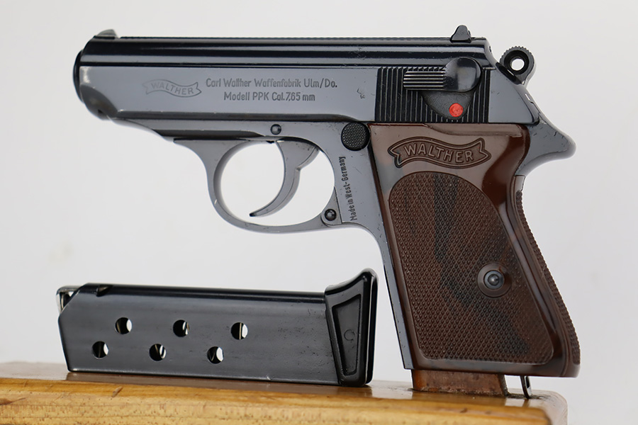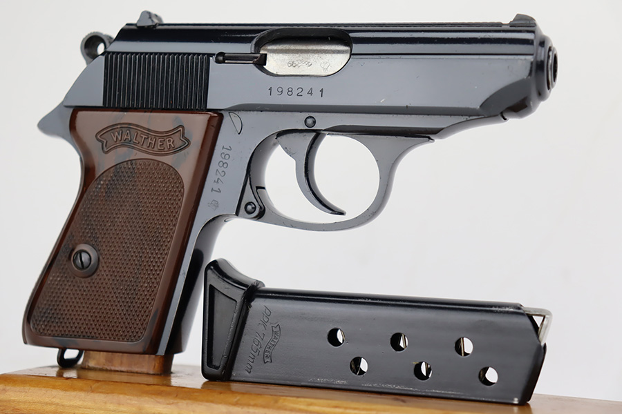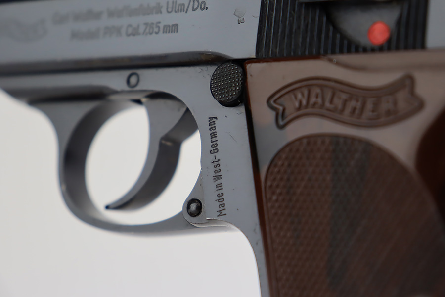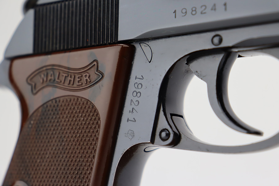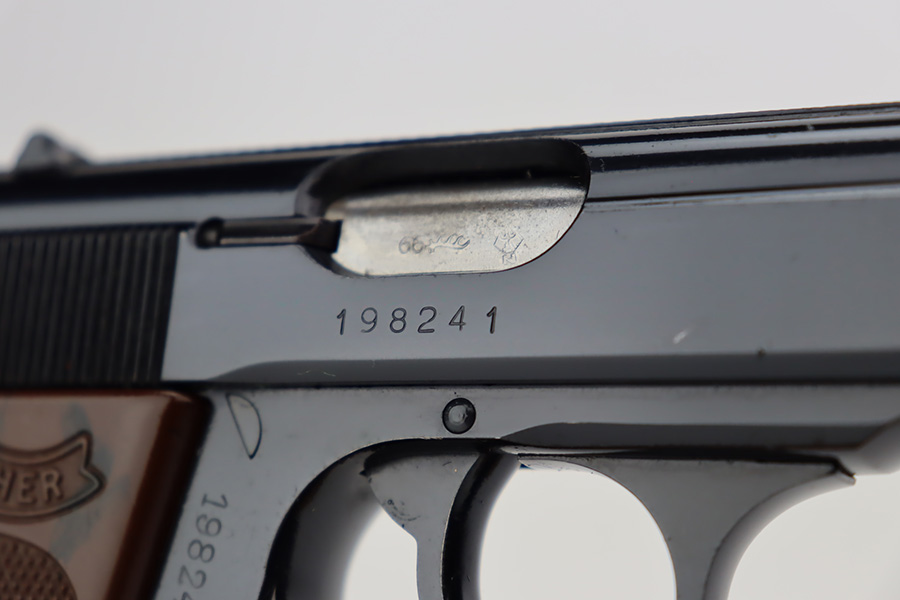 9/6/23 – This is an excellent example of a Walther PPK, manufactured in 1966 and chambered in 7.65mm. It is all matching with a “Made in West Germany” export marking on the frame. No import marks. It has retained nearly all of its original high polish finish with just a hint of muzzle wear, some tiny handling marks here and there, and very minor freckling on the front strap. Fitted with nice brown grips and comes with a black finger extension magazine. Mint bore.