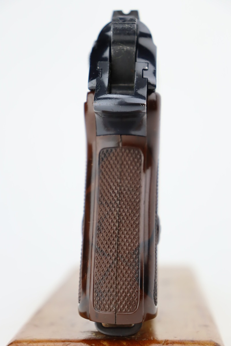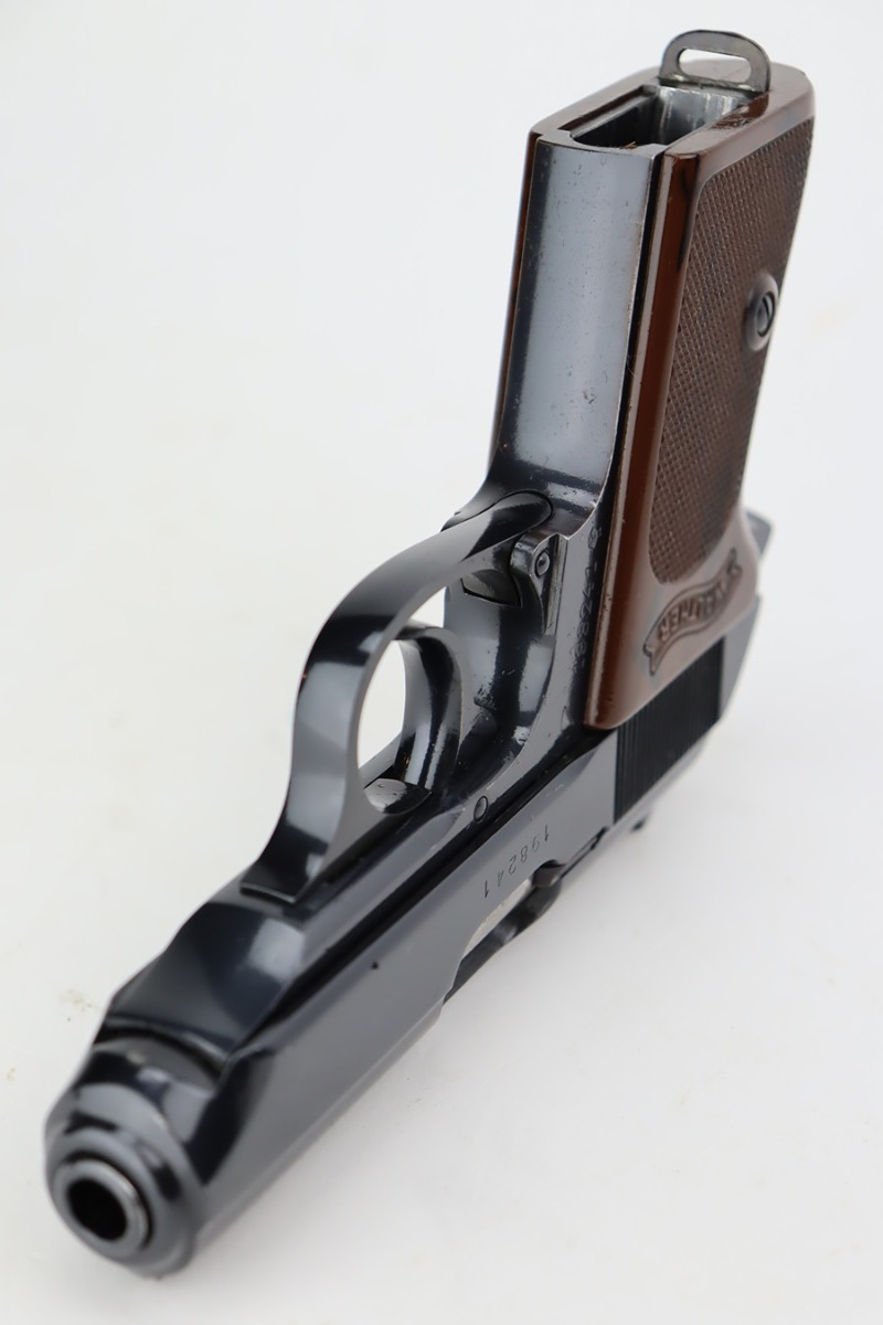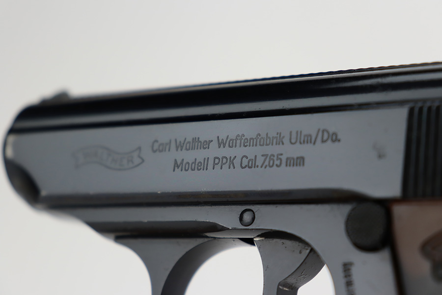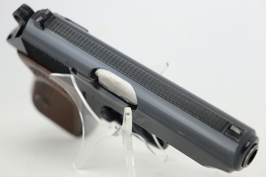 9/6/23 – This is an excellent example of a Walther PPK, manufactured in 1966 and chambered in 7.65mm. It is all matching with a “Made in West Germany” export marking on the frame. No import marks. It has retained nearly all of its original high polish finish with just a hint of muzzle wear, some tiny handling marks here and there, and very minor freckling on the front strap. Fitted with nice brown grips and comes with a black finger extension magazine. Mint bore.