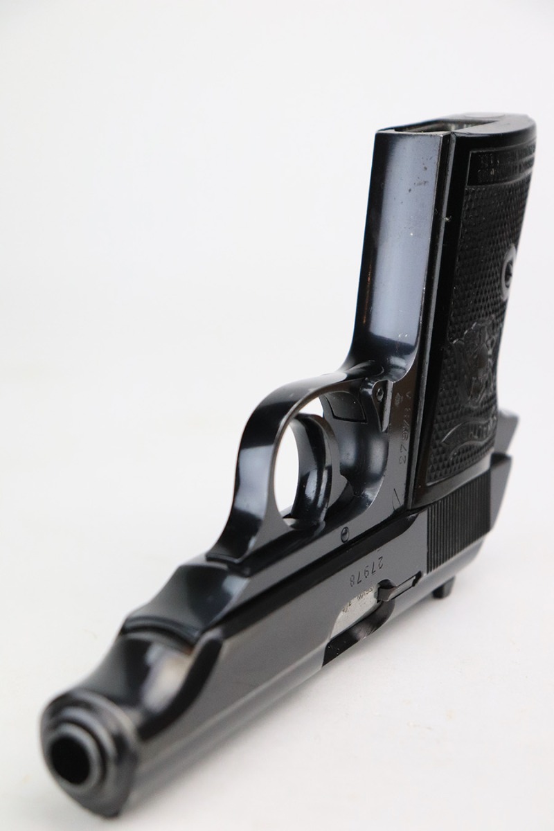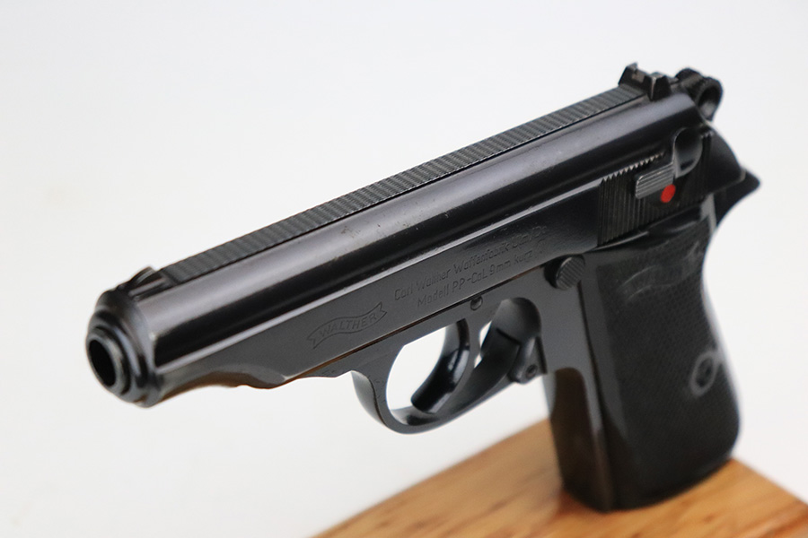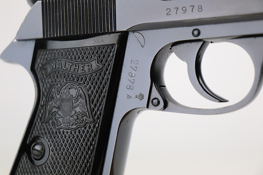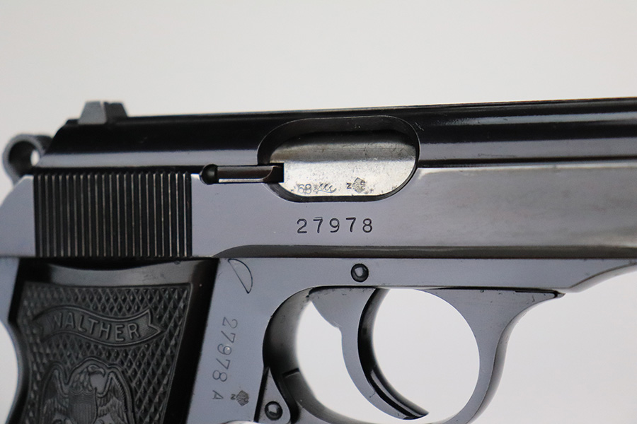 7/17/22 – This is an excellent example of a Walther PP manufactured in 1968 and chambered in 9mm Kurz. It is all matching, has the proper West German proofs, and has no import marks. It has retained about 97% of its high polish bluing. Most of the wear is around the muzzle, but there is also some light spotty wear and freckling on both grip straps. Comes with excellent Walther/Interarms black plastic grips and one proper magazine. Mint bore.