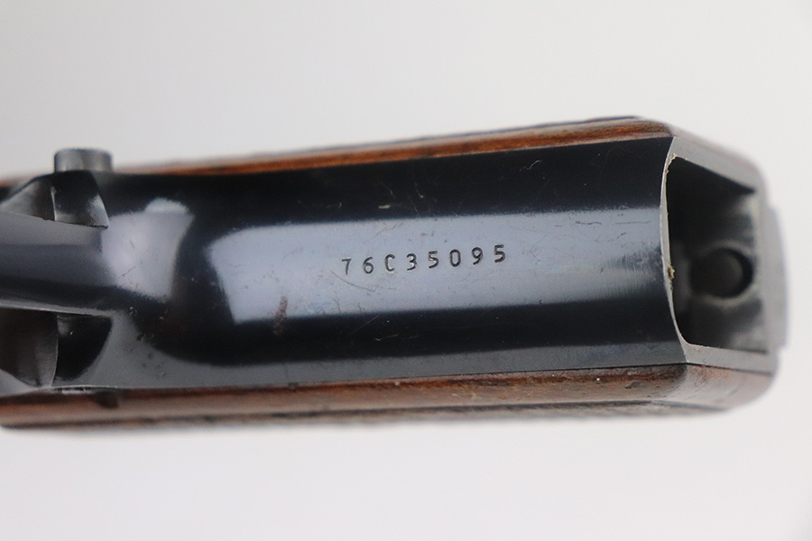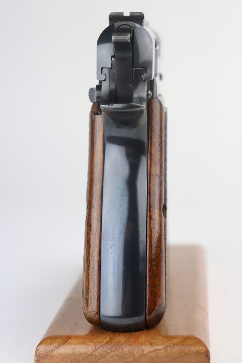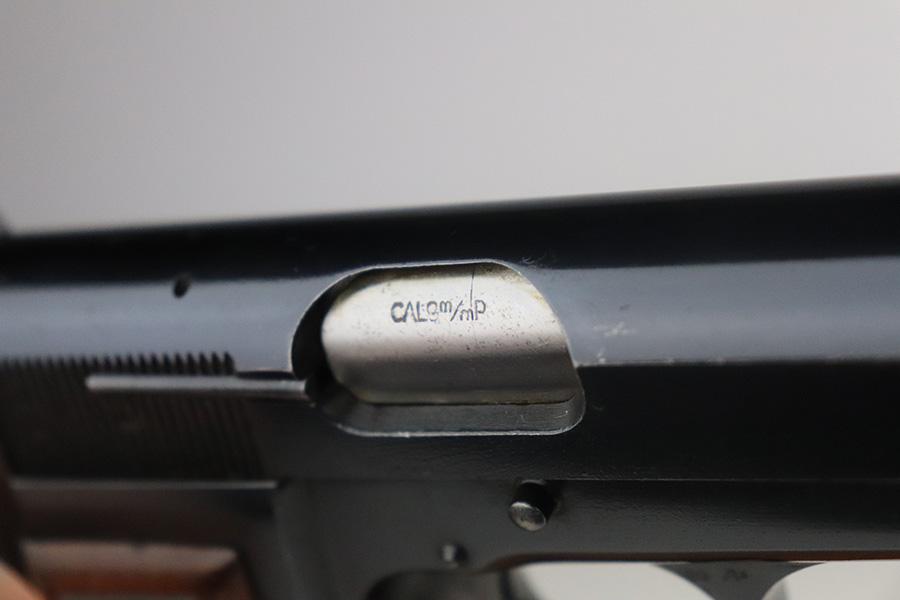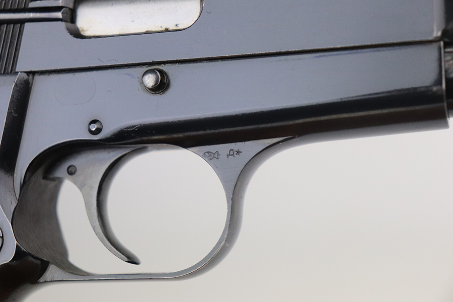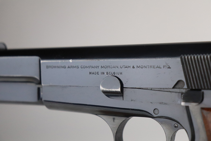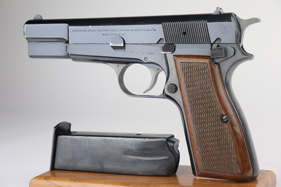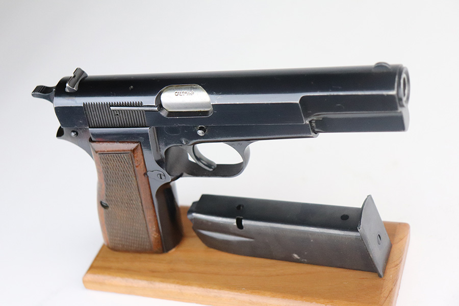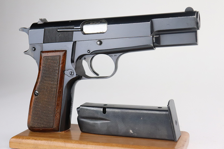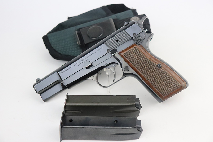 7/12/21 – This is an excellent example of an FN Browning Hi Power made in Belgium in 1976. It is matching and has the proper Belgian proofs. The rig comes with a nice modern holster and two proper magazines. The gun has retained about 97-98% of its high polish finish. There are hints of wear on the high edges of the slide and scratchy wear on the front strap. A few tiny dings on the left side of the slide. Comes with very nice wood grips. Mint bore.