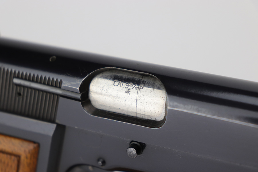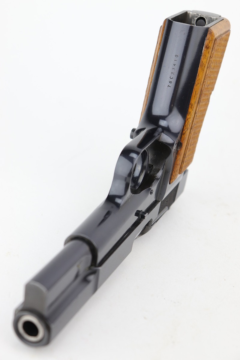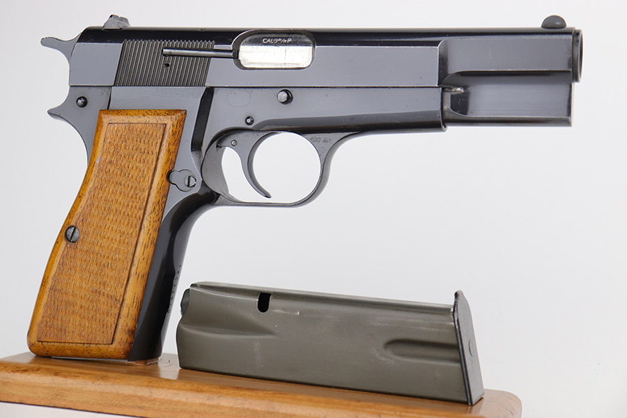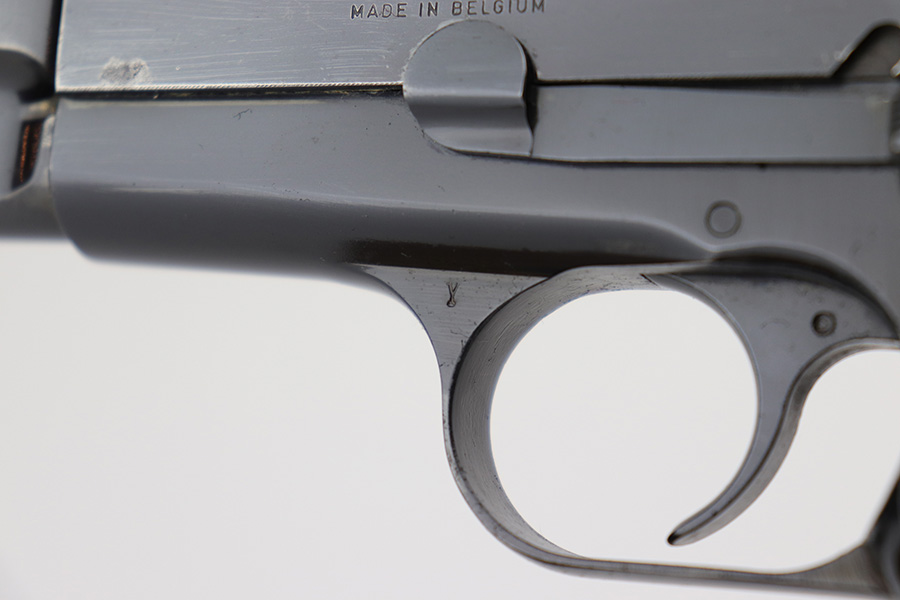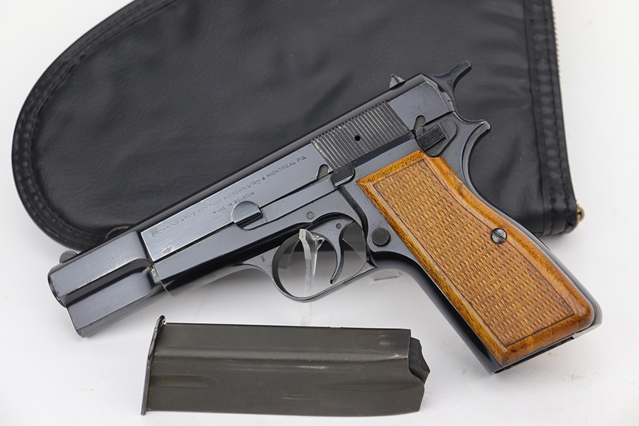 6/7/23 – This is an excellent example of an FN Browning Hi Power manufactured in Belgium in 1976 and chambered in 9mm. All matching with the proper Belgian proofs. Comes with its original Browning soft case and one magazine. The gun itself has retained about 97-98% of its original high polish finish with very minor wear on the high edges of the slide and one small dot of discoloration and pin-pricking on the left side of the slide. Fitted with minty blonde wood grips. The bore is very shiny for the most part with strong rifling, but there are a few small dots of frosting here and there.