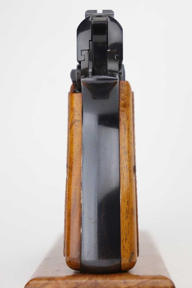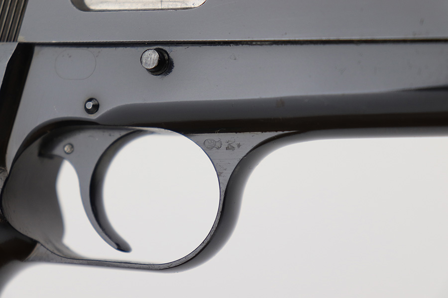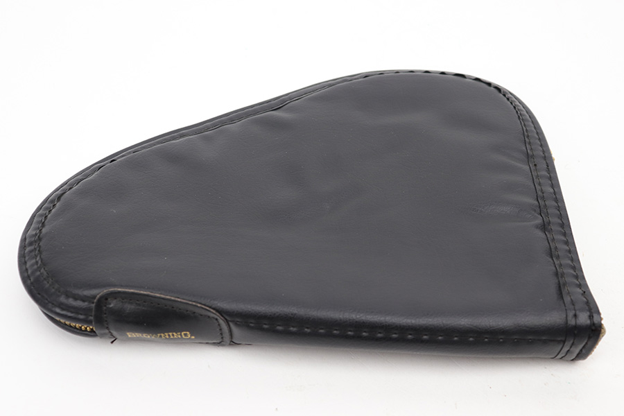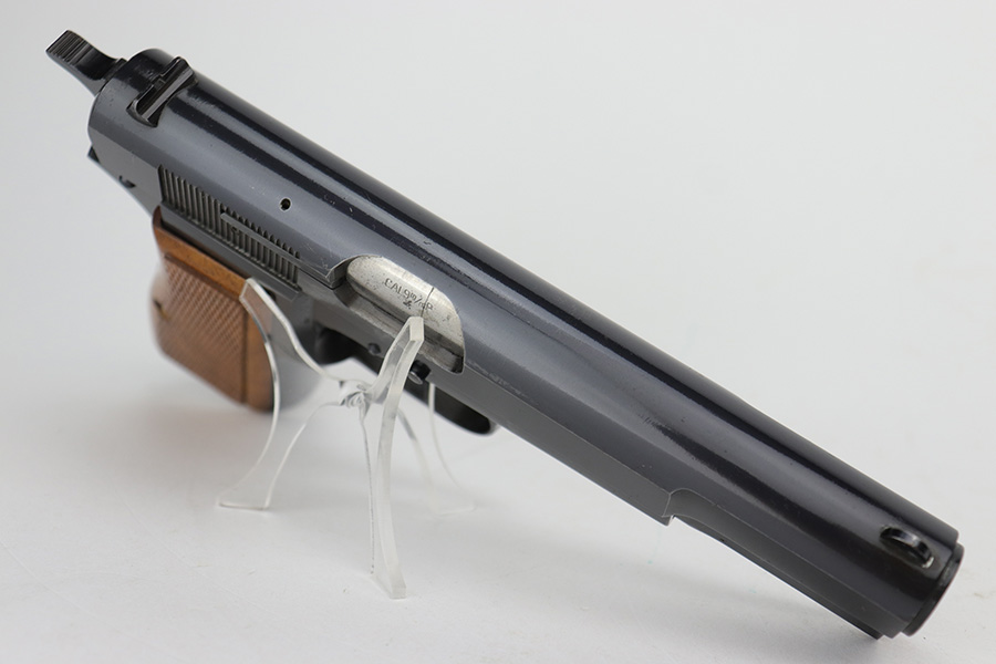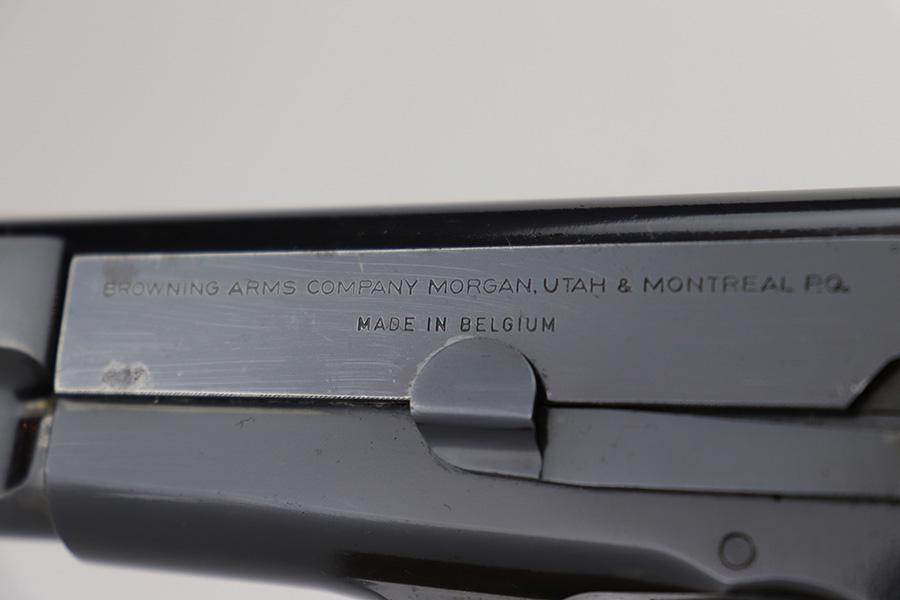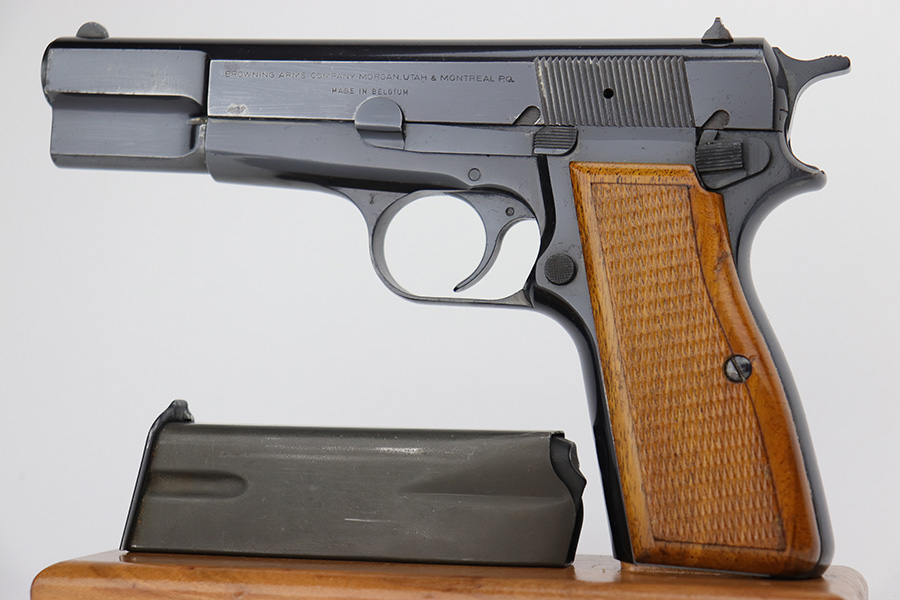 6/7/23 – This is an excellent example of an FN Browning Hi Power manufactured in Belgium in 1976 and chambered in 9mm. All matching with the proper Belgian proofs. Comes with its original Browning soft case and one magazine. The gun itself has retained about 97-98% of its original high polish finish with very minor wear on the high edges of the slide and one small dot of discoloration and pin-pricking on the left side of the slide. Fitted with minty blonde wood grips. The bore is very shiny for the most part with strong rifling, but there are a few small dots of frosting here and there.