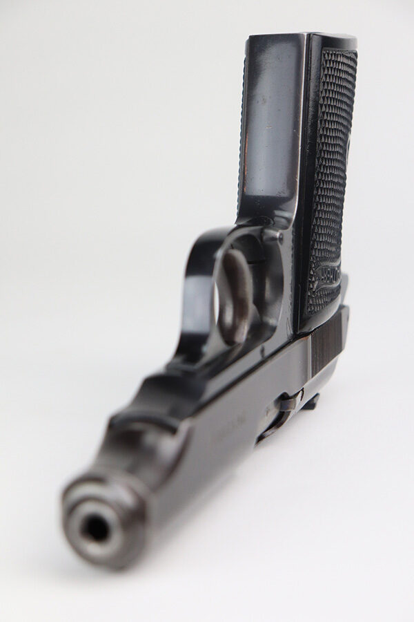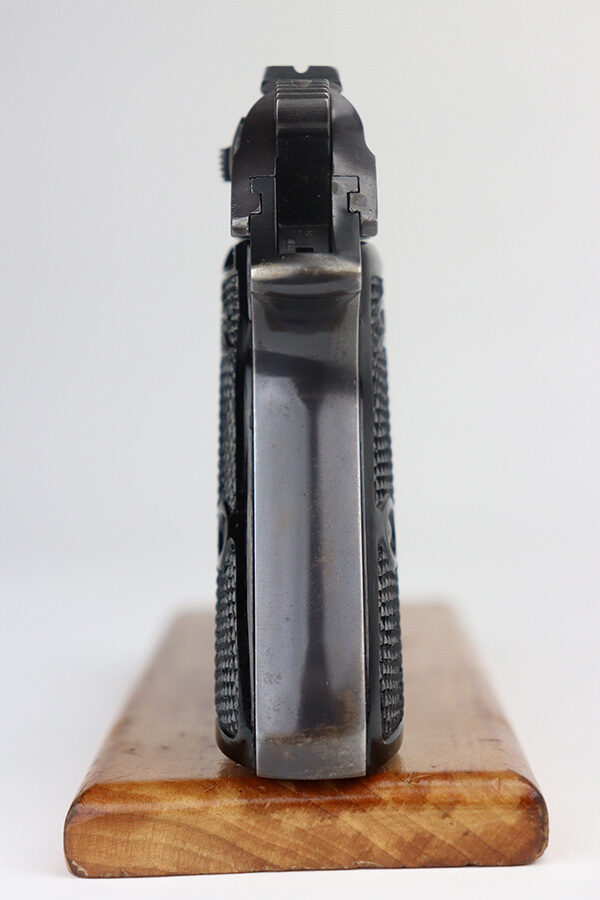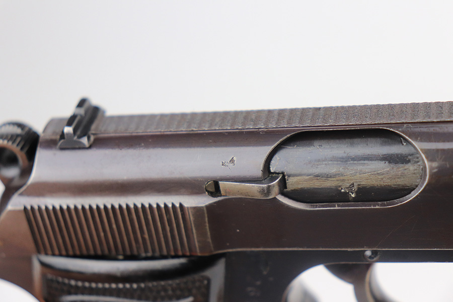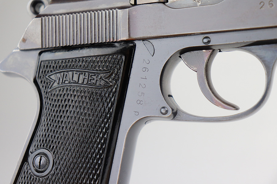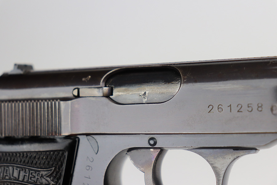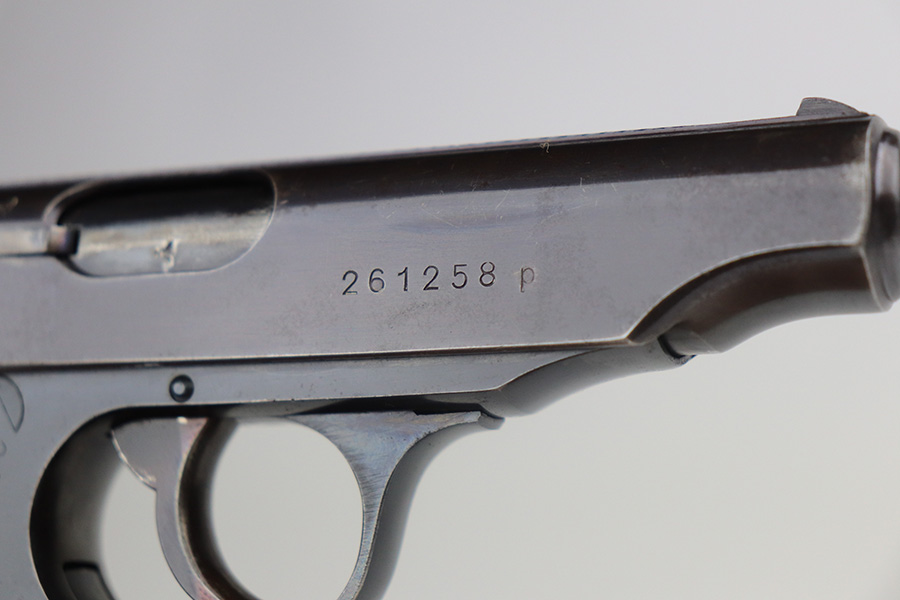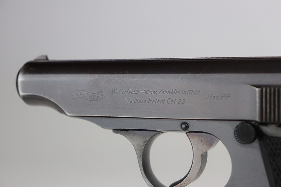 6/24/21 – This is an excellent example of a .22 caliber Walther PP sold in the commercial market in 1942. It is all matching and has the proper “Eagle N” proofs. It has retained about 95% of its high polish finish. The bluing on the slide has a slight plumb color to it. There is minor wear around the muzzle, minor scratchy wear around the round edges of the slide, and spotty wear on the back strap. A few small handling marks on the front strap. Comes with excellent grips and a period-correct .22 caliber magazine. Mint bore.