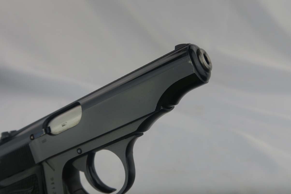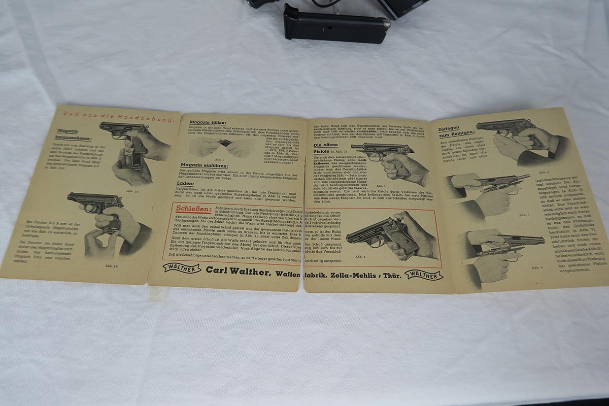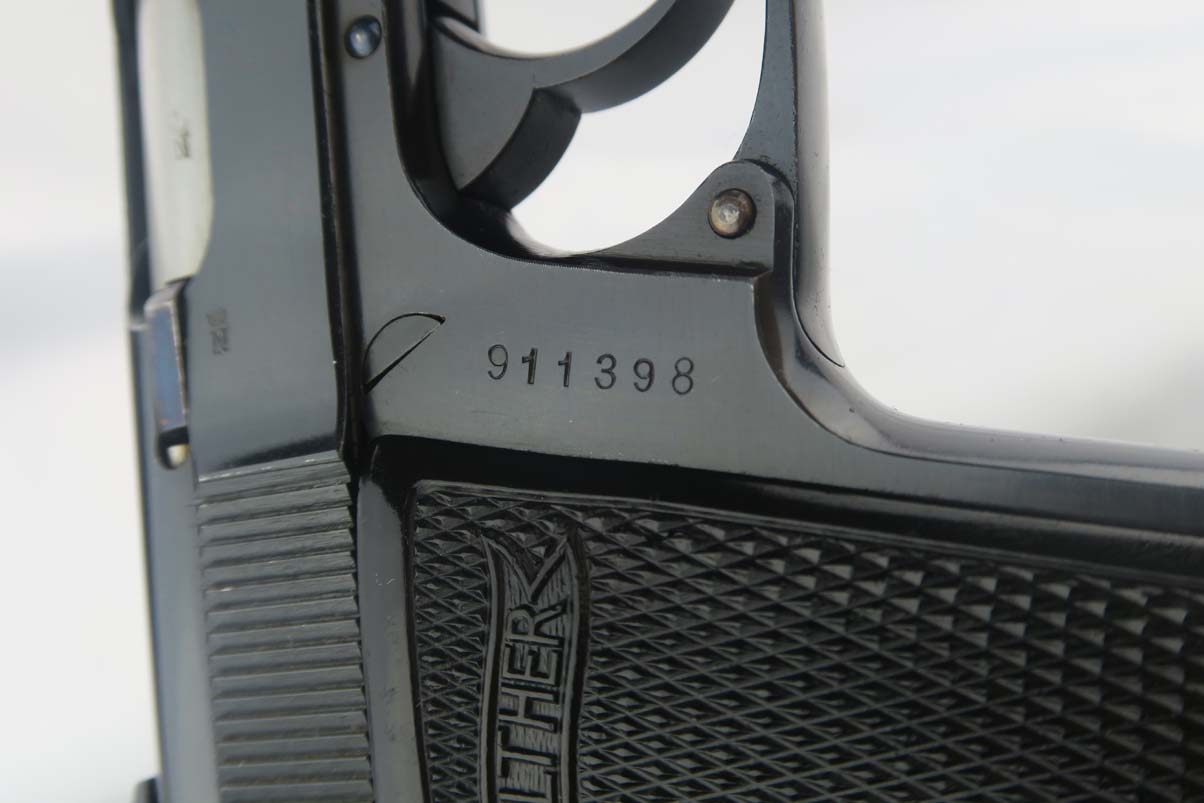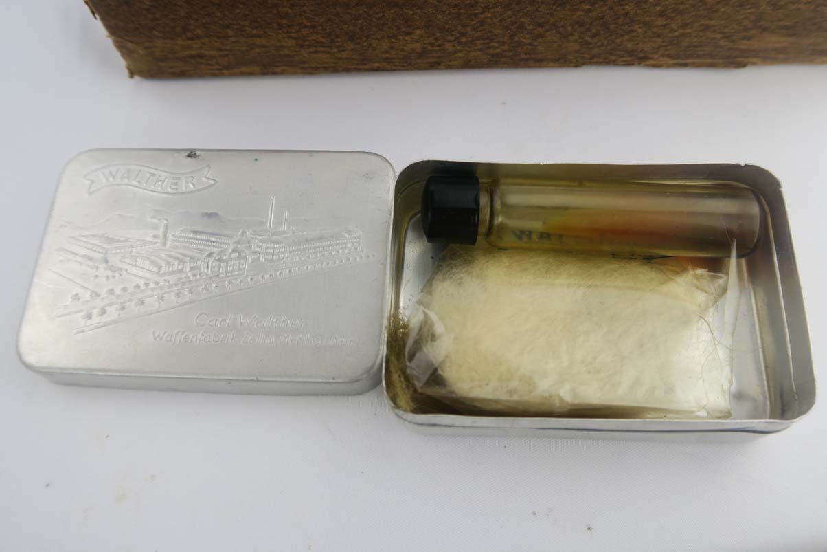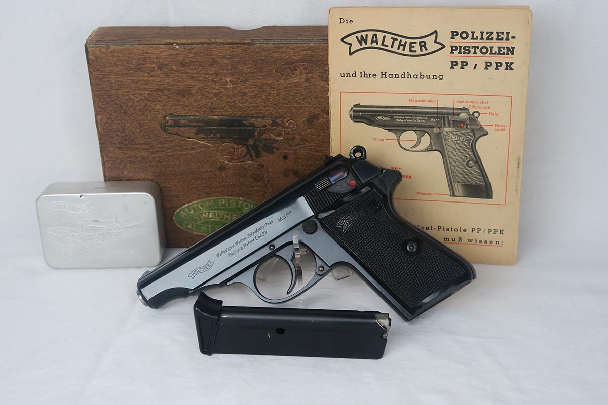 8/2/17 – This is a near-mint Walther PP, chambered in .22, and with the original matching box! The finish on this pistol rates at about 98-99%, with a couple of dings on the straps. The early style box with green oval label is numbered to the pistol, and includes an original cleaning tin with oiler and an original manual (with photo of a 22 caliber PP on the cover). The grips and magazine are excellent originals. Minty bore.