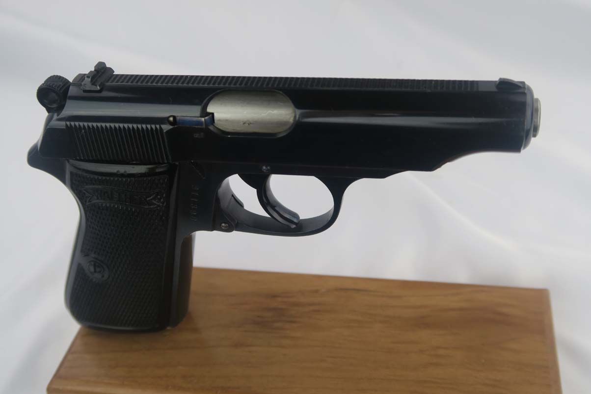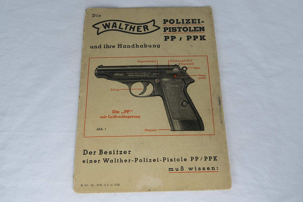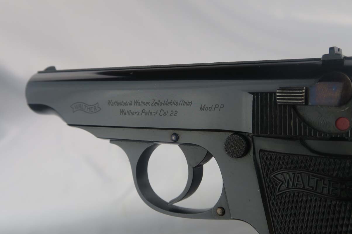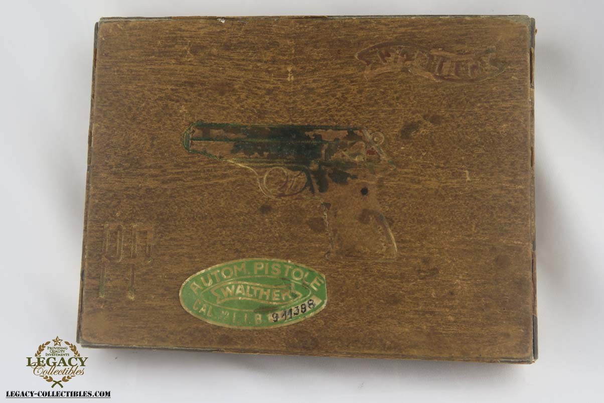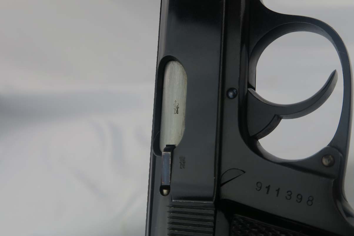 8/2/17 – This is a near-mint Walther PP, chambered in .22, and with the original matching box! The finish on this pistol rates at about 98-99%, with a couple of dings on the straps. The early style box with green oval label is numbered to the pistol, and includes an original cleaning tin with oiler and an original manual (with photo of a 22 caliber PP on the cover). The grips and magazine are excellent originals. Minty bore.