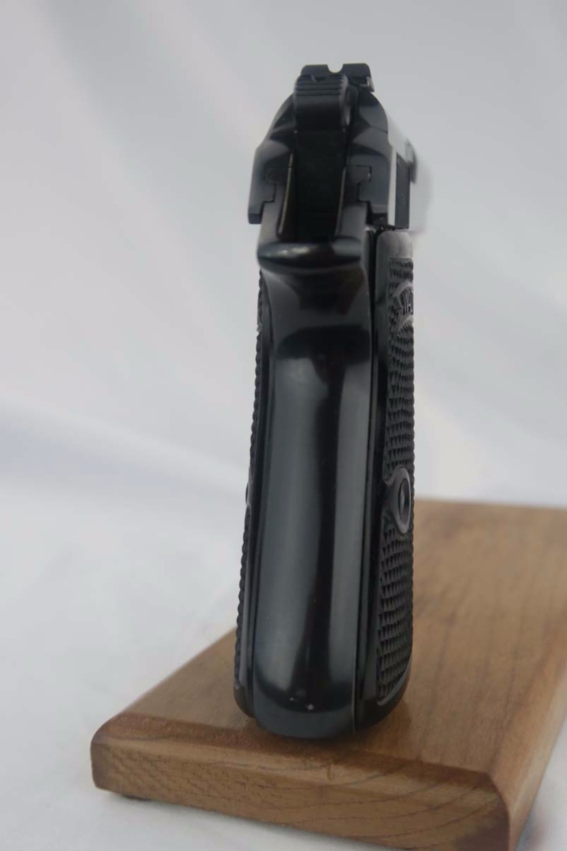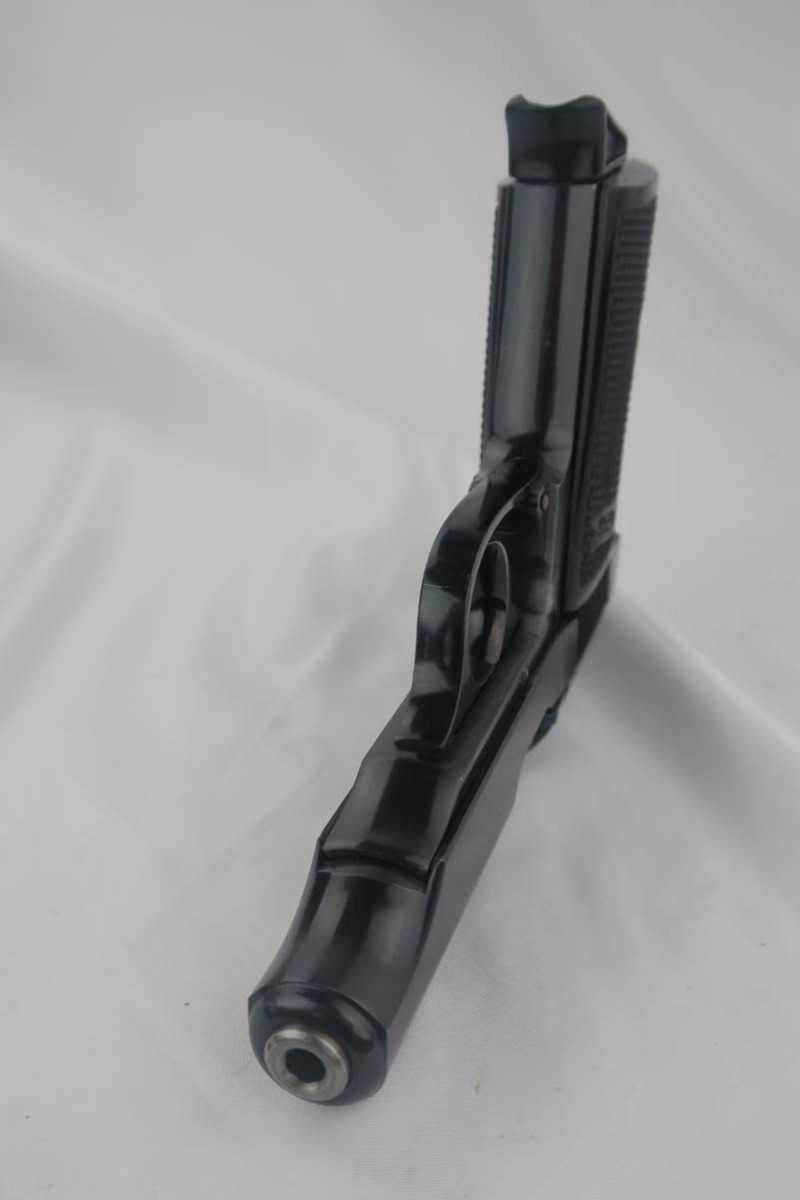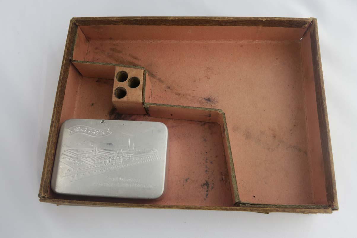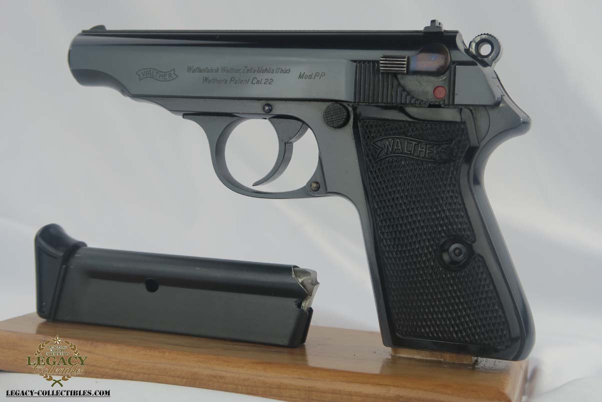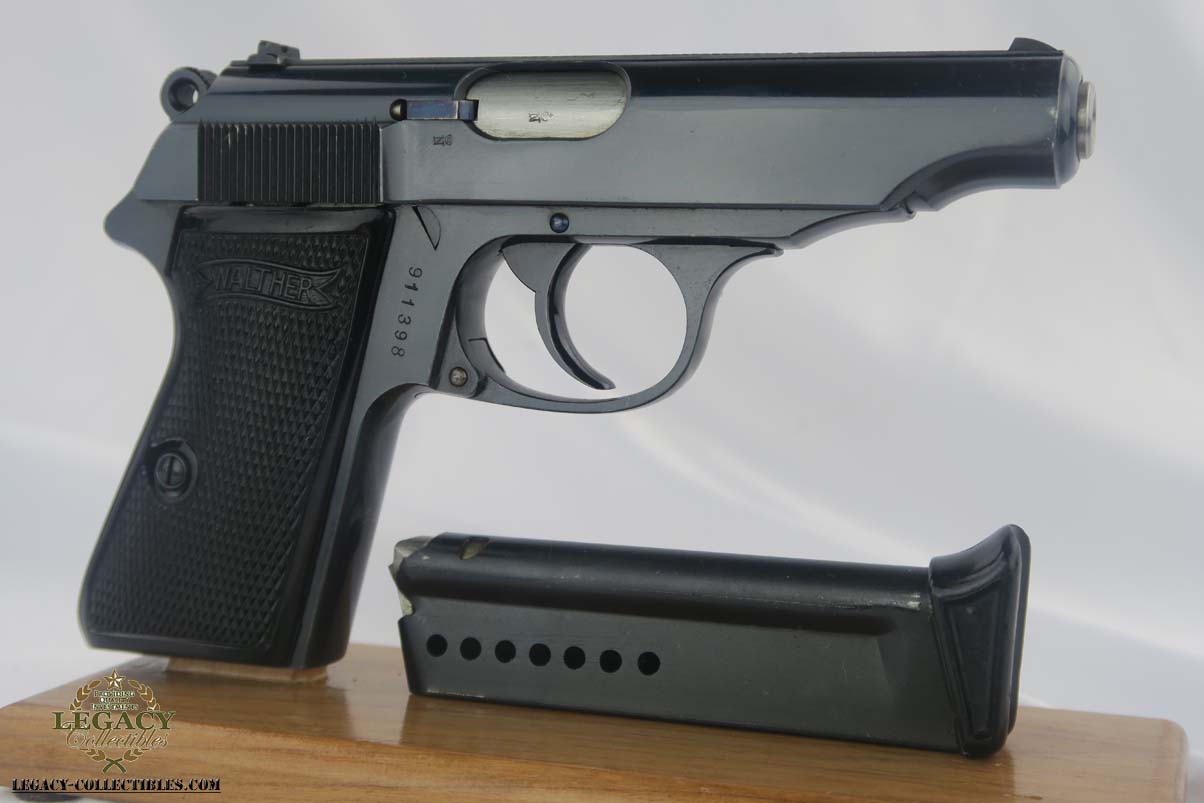 8/2/17 – This is a near-mint Walther PP, chambered in .22, and with the original matching box! The finish on this pistol rates at about 98-99%, with a couple of dings on the straps. The early style box with green oval label is numbered to the pistol, and includes an original cleaning tin with oiler and an original manual (with photo of a 22 caliber PP on the cover). The grips and magazine are excellent originals. Minty bore.