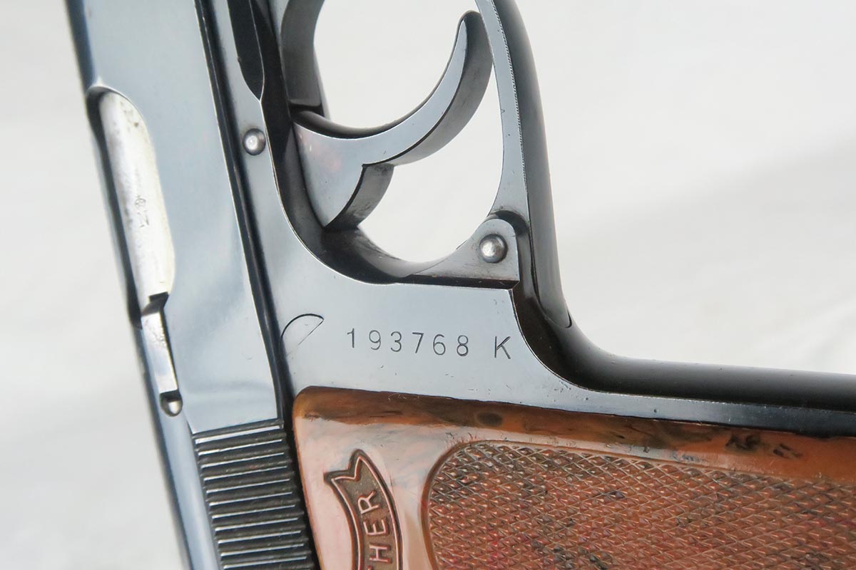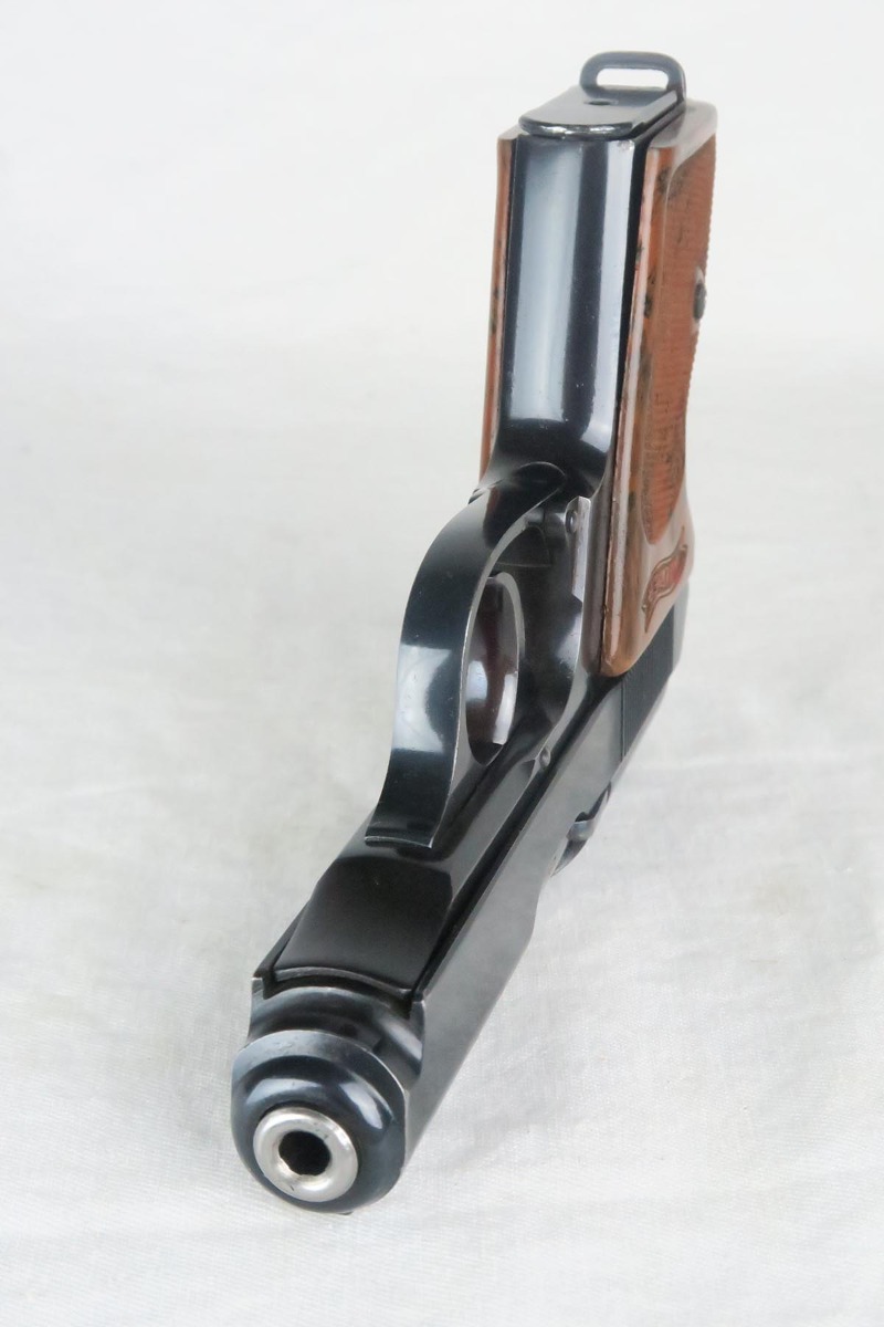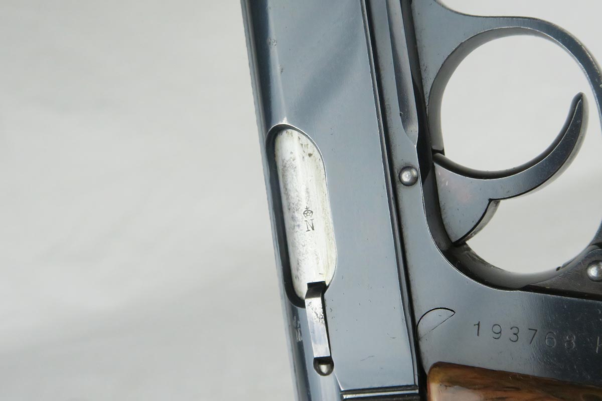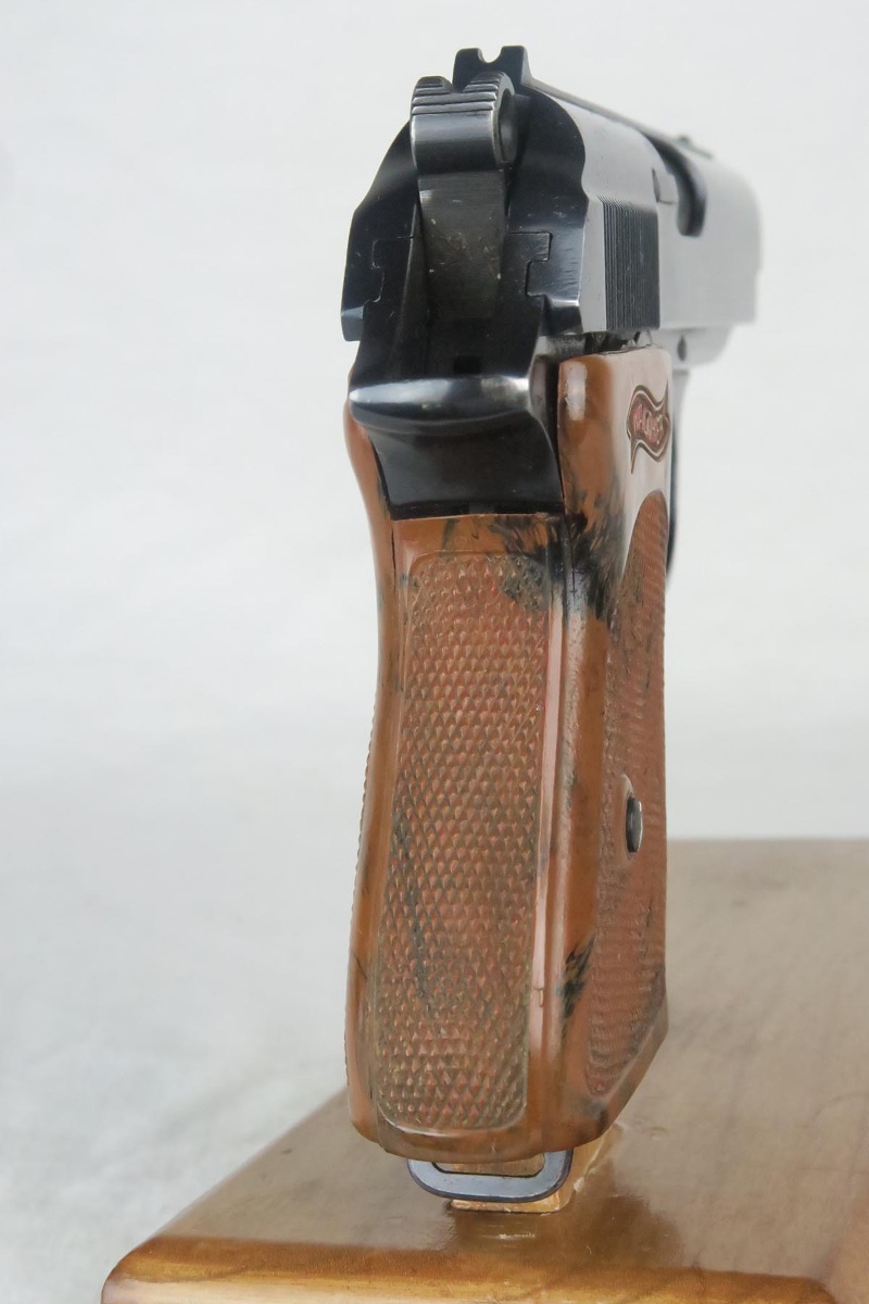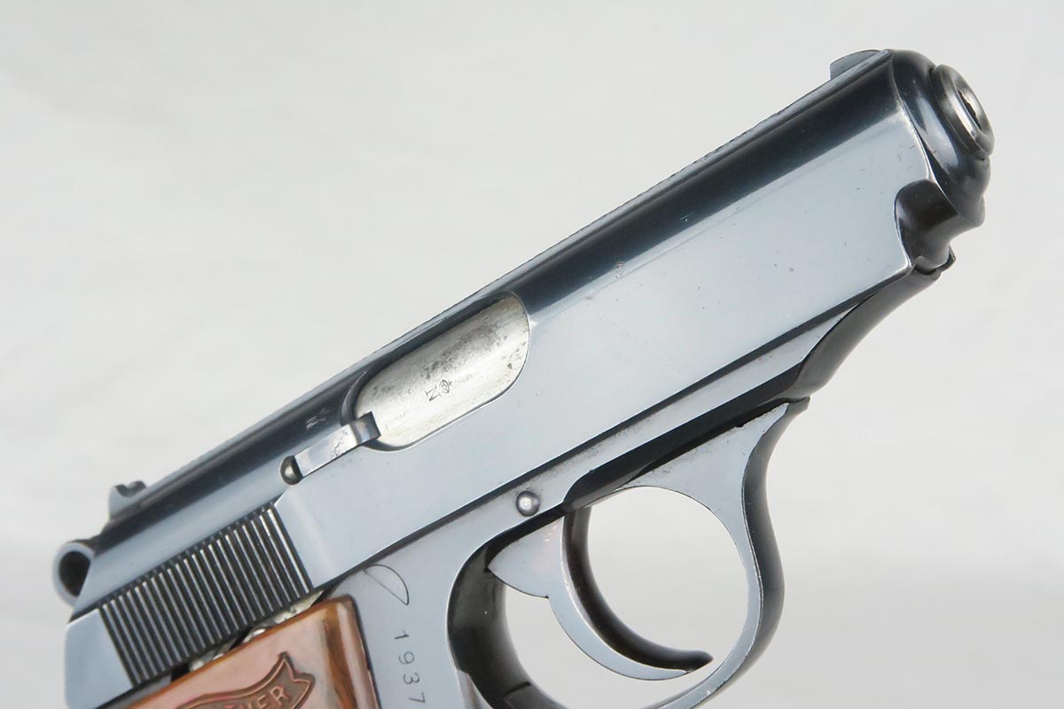 12/29/17 – This is a beautiful Walther PPK chambered in .22 caliber.  The original high-polish finish rates at 97-98% with minor finish loss on either side of the muzzle, and a small area of pinpricking on the right side slide.  Serial dates this pistol to 1939, and it has the appropriate crown/N proofs for that date.  Excellent one-piece grip.  Terrific bore.