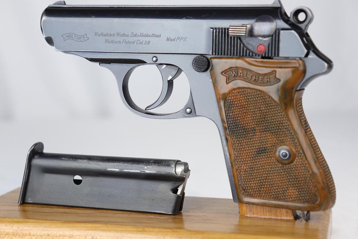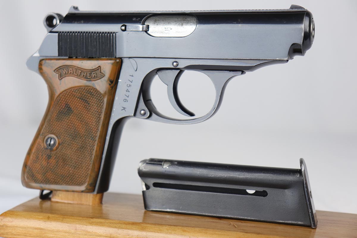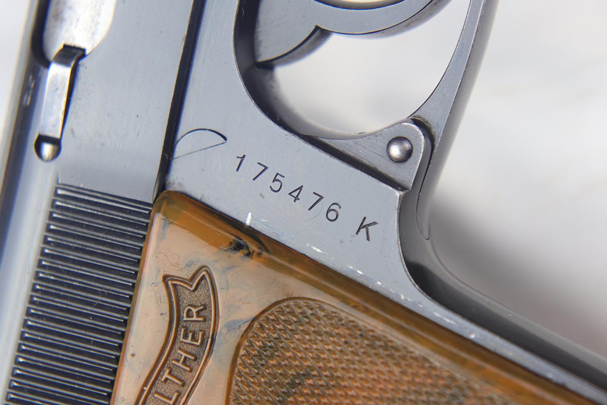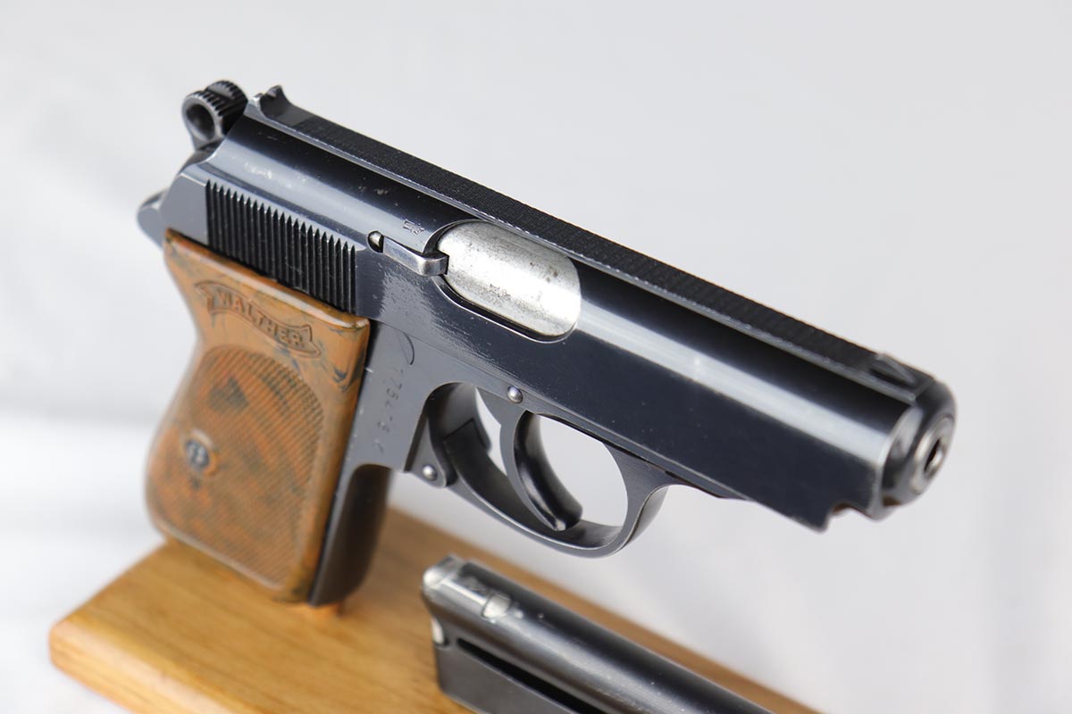 9/27/18 – This is an excellent and original commercial Walther PPK, chambered in the more scarcely found .22 caliber. The pistol retains 96-97% blue with minor muzzle wear and slight thinning along the rounded edges of the slide. Correct magazine and a nice original grip, though it does have a minor crack on the bottom left corner of left side. Bore is mint.