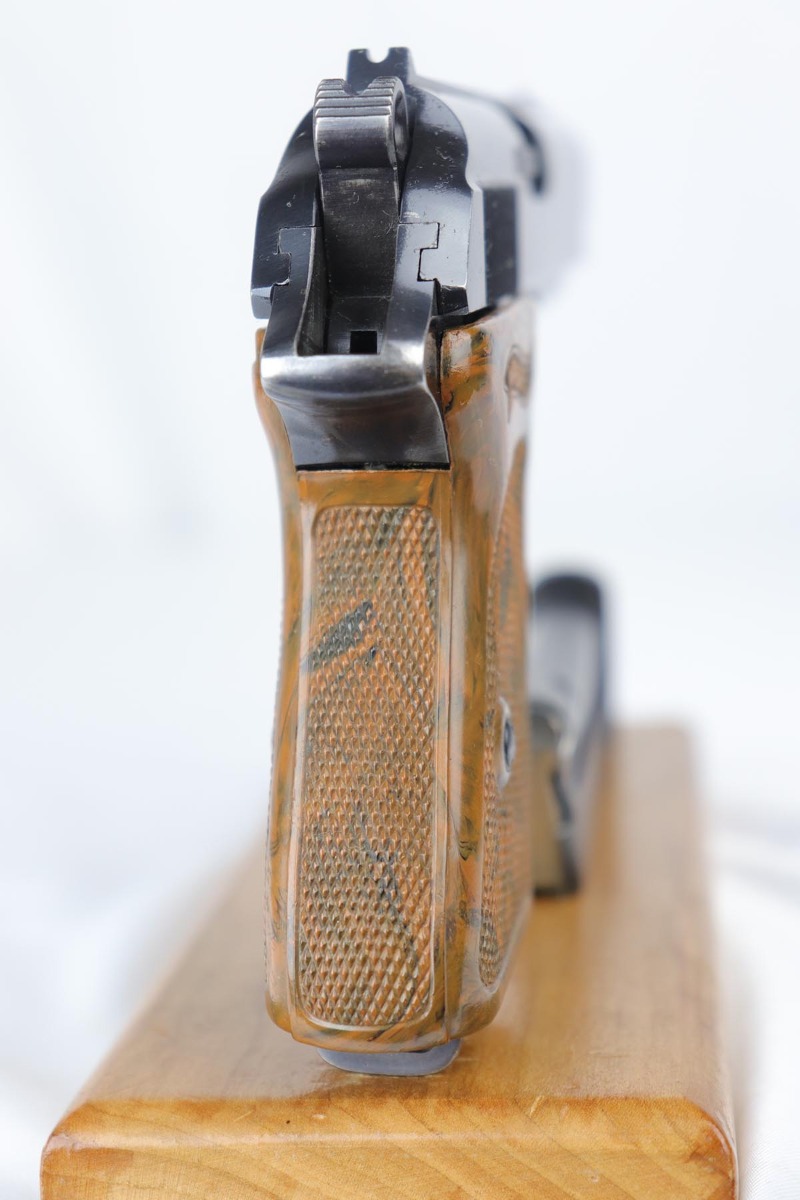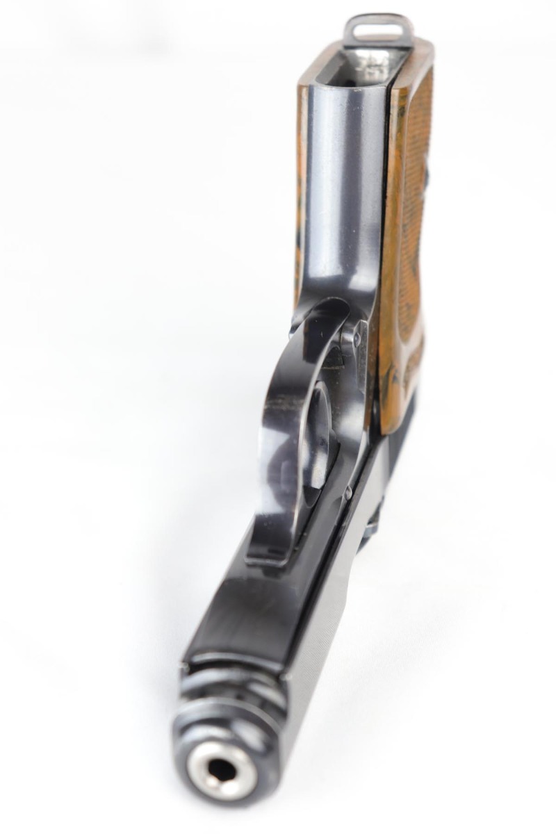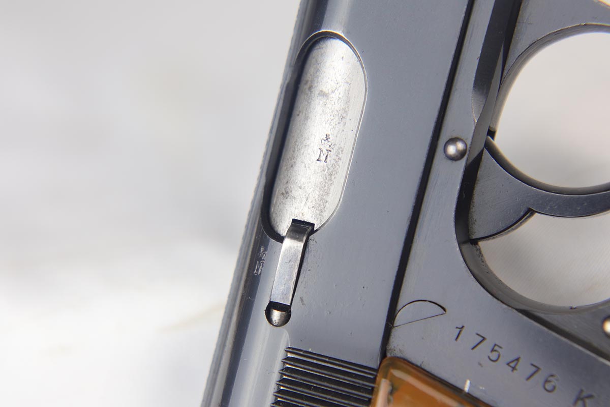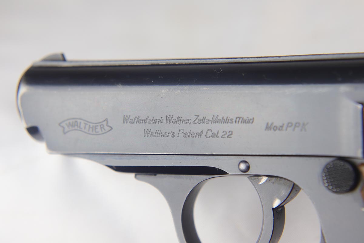 9/27/18 – This is an excellent and original commercial Walther PPK, chambered in the more scarcely found .22 caliber. The pistol retains 96-97% blue with minor muzzle wear and slight thinning along the rounded edges of the slide. Correct magazine and a nice original grip, though it does have a minor crack on the bottom left corner of left side. Bore is mint.