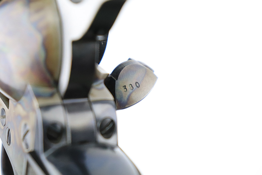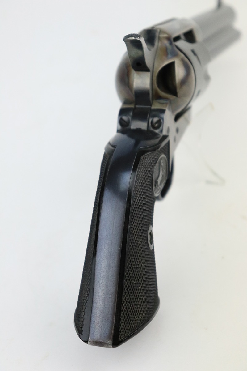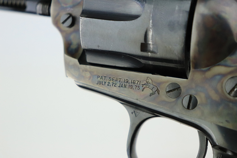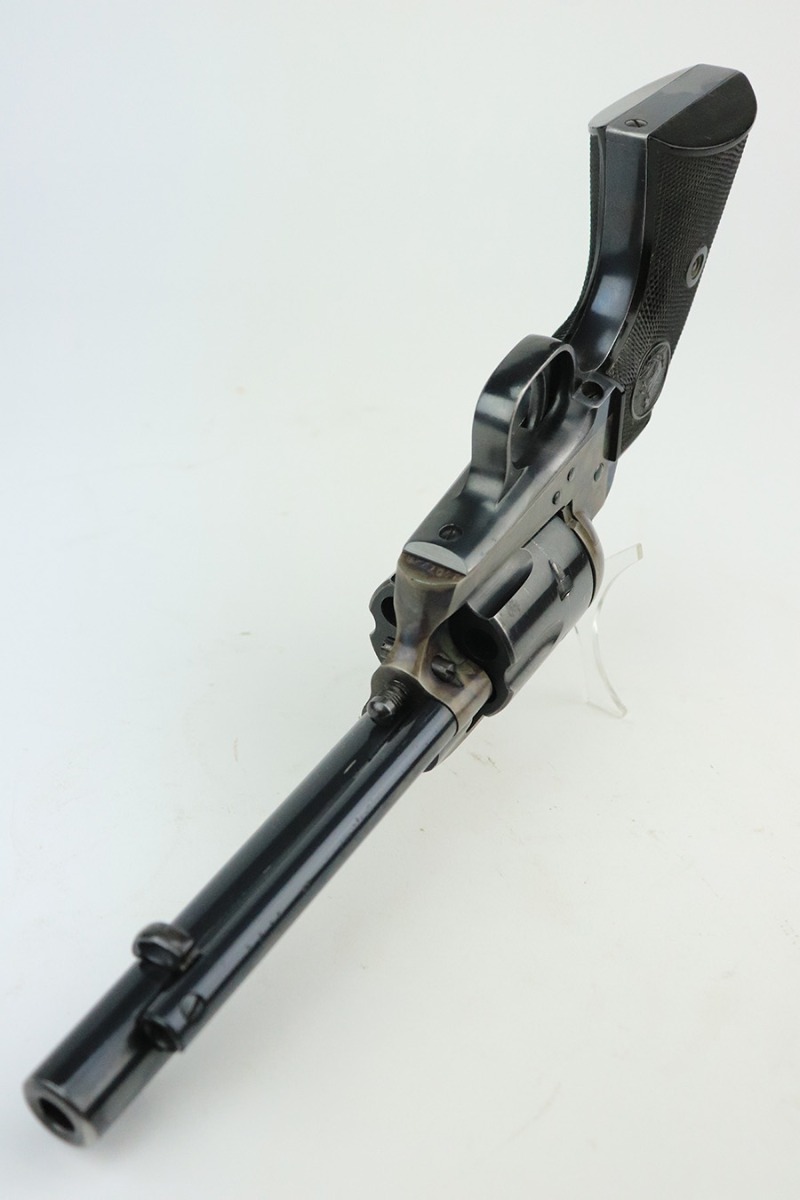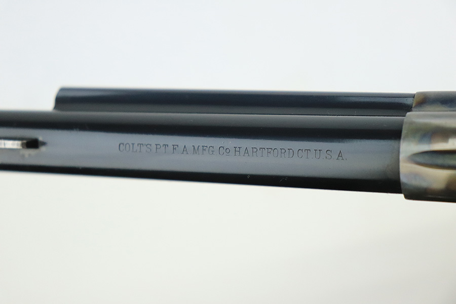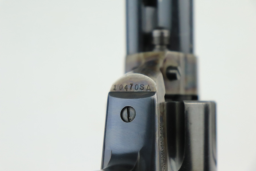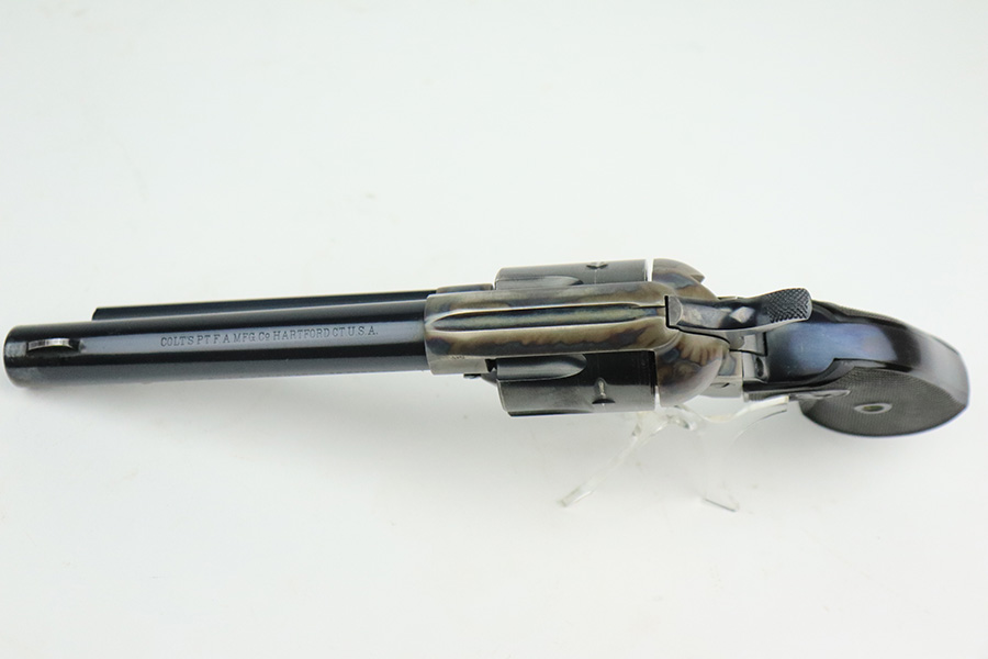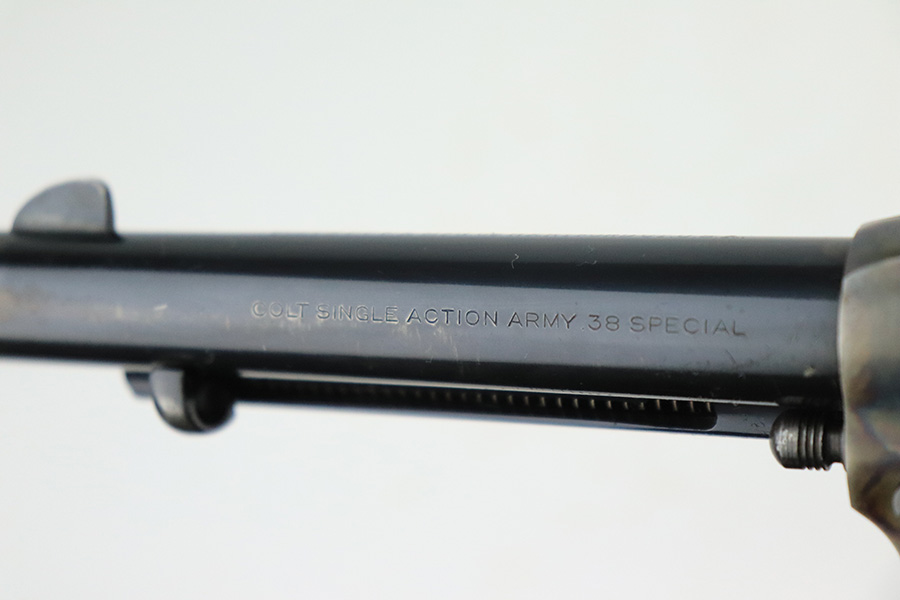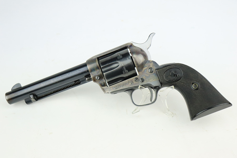 6/13/22 – This is an excellent 2nd Generation Colt Single Action Army Revolver manufactured in 1957. 5.5″ barrel, chambered in .38 Special. It has retained about 96% of its original finish. There is some wear, discoloration, and some tiny handling marks along the left side of the barrel. Light roll marks and tiny scratches on the cylinder. Some tiny pits along the ejector tube. Beautiful case-hardening on the frame. Comes with excellent black hard rubber Colt grips. The cylinder is tight and the action is smooth. Mint bore.