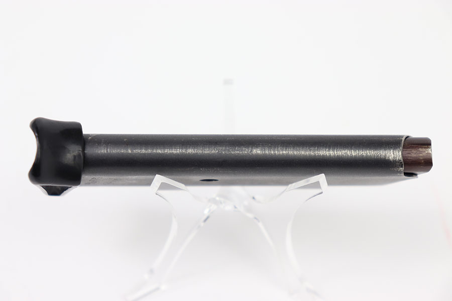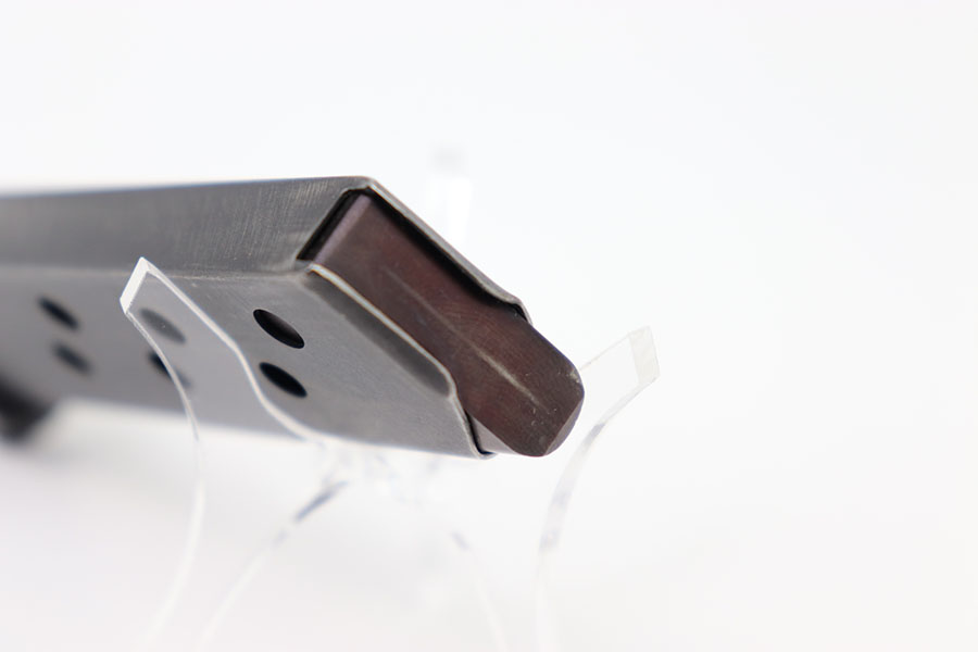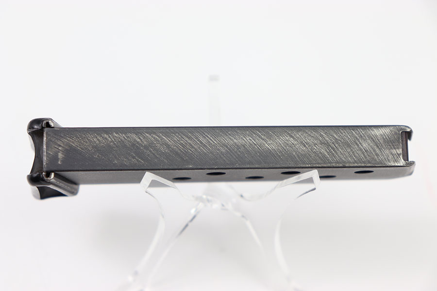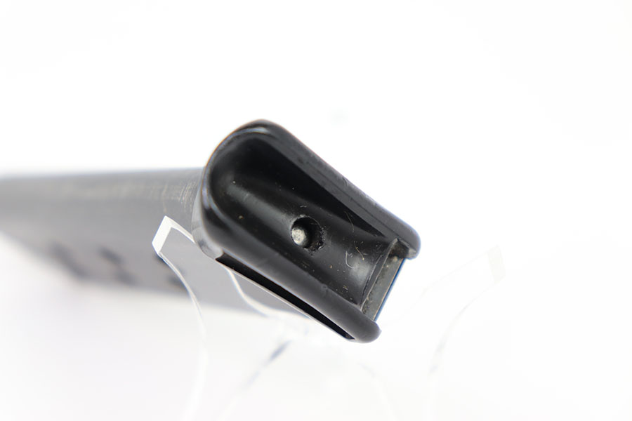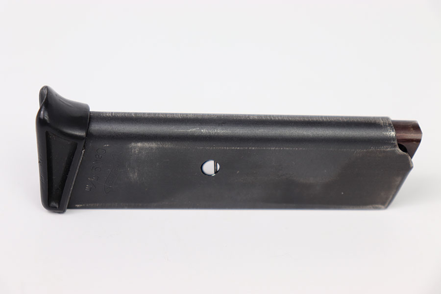 1/31/24 – This is a near minty example of a Walther PP 9mm/(.380) magazine with a finger extension. This example was made around 1940. The magazine has excellent bluing with minimal edge wear near the top of the magazine, front rounded edge, and the spine. The left side of the tube is marked with the Walther banner and “CAL. 9m/m” underneath. The black finger extension is in minty condition with no dings or dents. The spring is strong and fully functional.