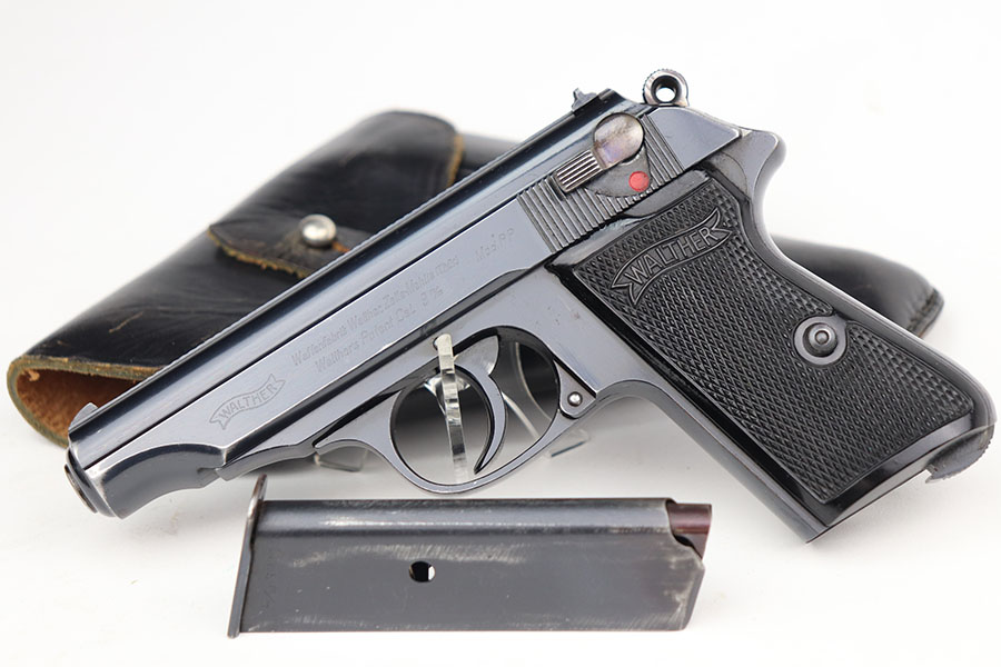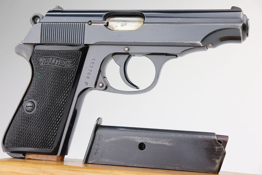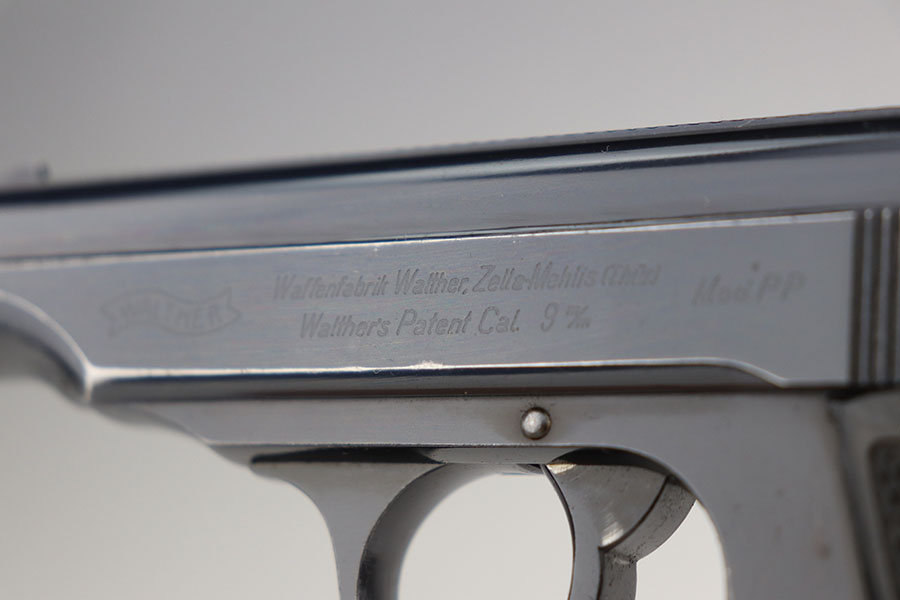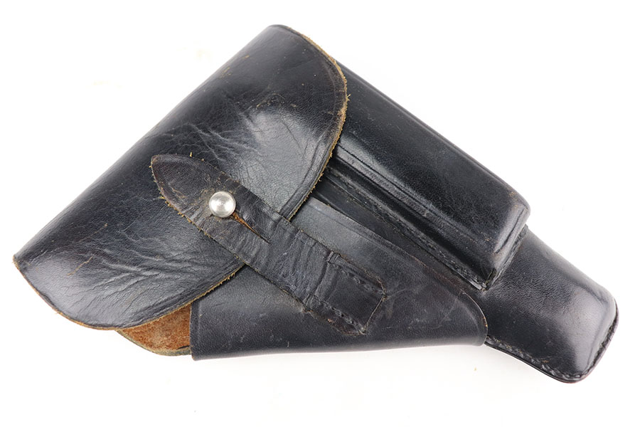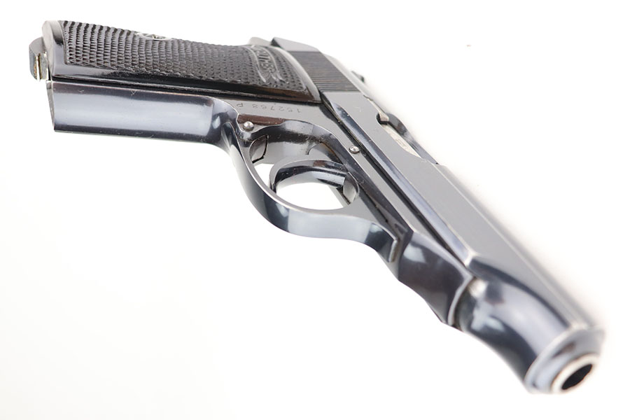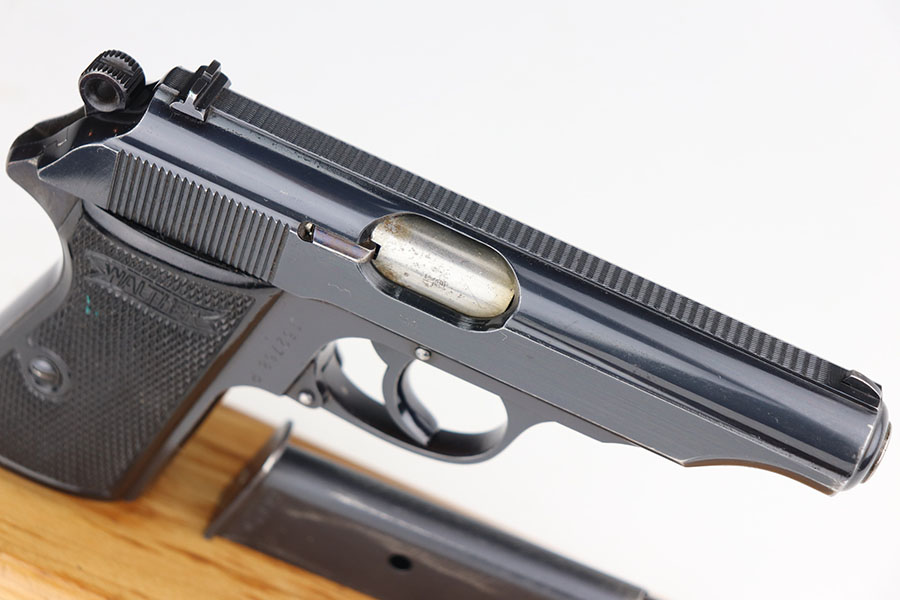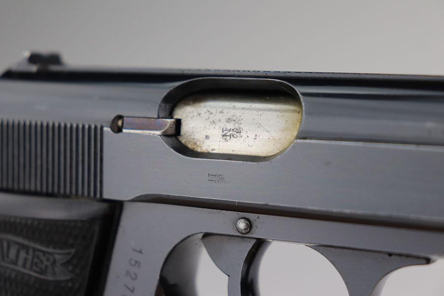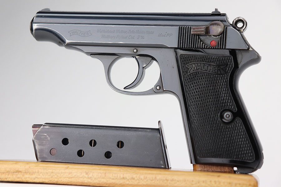 2/3/21 – This is an excellent example of a 9mm Walther PP Rig, sold in the commercial market in 1939. It is all matching and has the correct “Crown N” proofs. The rig come with one 9mm magazine and an un-marked commercial holster. The gun is excellent, retaining about 97% of its original bluing. There is minor muzzle wear and just a hint of wear on some of the high edges. There are a few small dots of oxidation on the back strap. It comes with excellent grips. Excellent bore – shiny with strong rifling. The slide does not stay back with the current magazine.