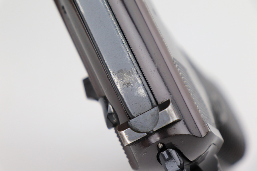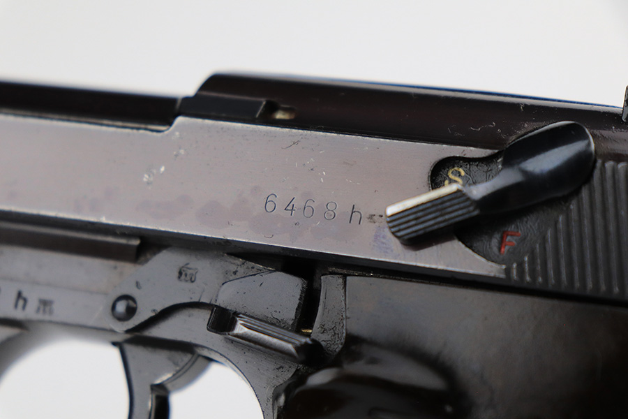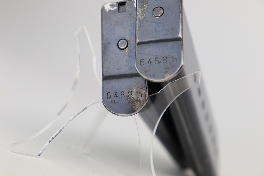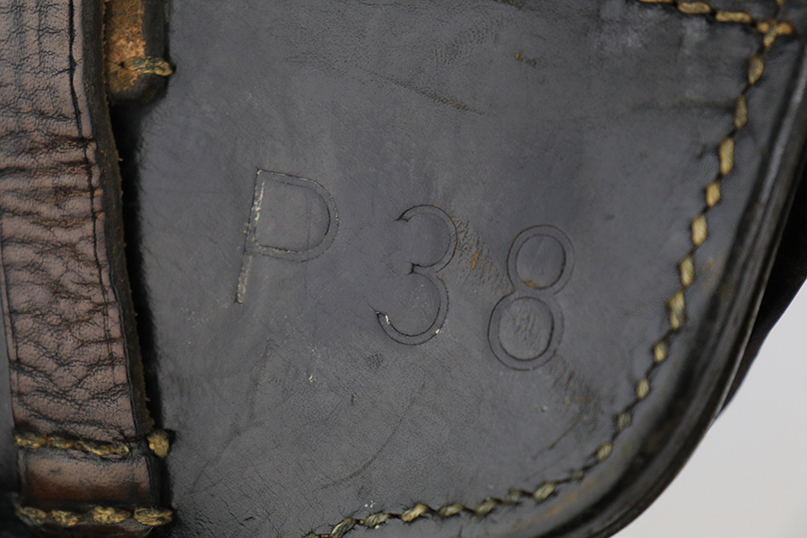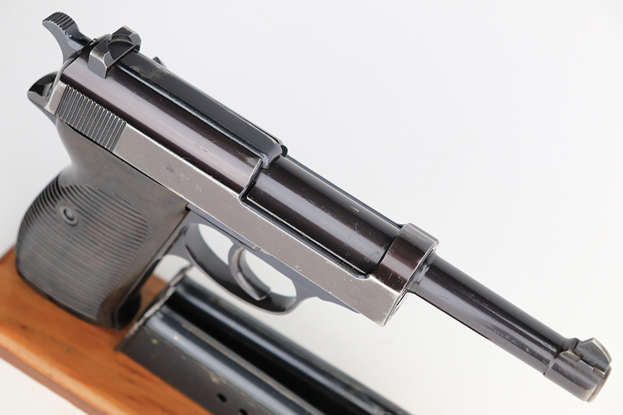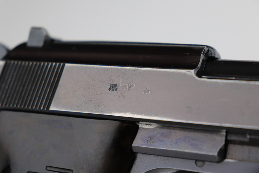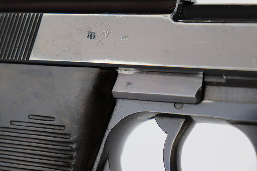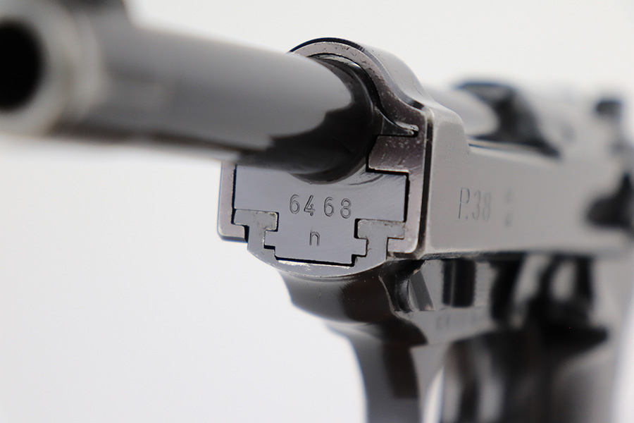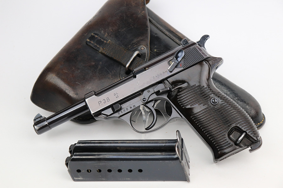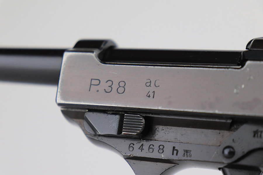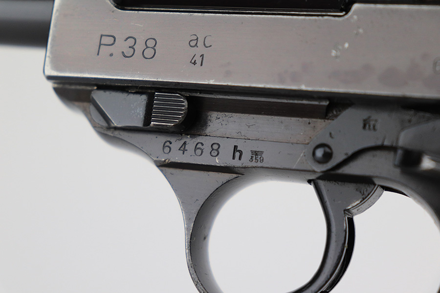 7/8/24 – This is an excellent example of an AC 41 Walther P.38 issued to the Nazi military in 1941. All matching with the proper “Eagle 359” military acceptance proofs throughout, even on the small parts. It comes as a complete rig with a very nice 1941-dated hard shell holster and two original matching-numbered magazines. The gun itself has retained about 95% of its original high polish finish. There is minor wear around the muzzle, along both sides of the slide (concentrated mostly around the high edges), and one small area of wear on the top strap. A few tiny dots of discoloration along both sides of the slide. Fitted with excellent “Eagle 359” proofed Walther grips. The bore has great rifling, but there is minor freckling in the grooves. De-cocker is functional.