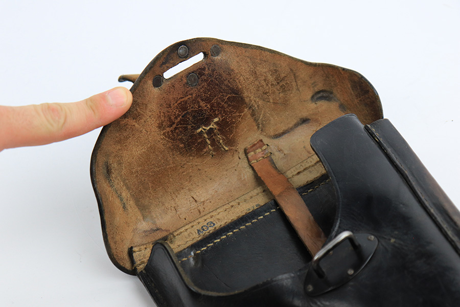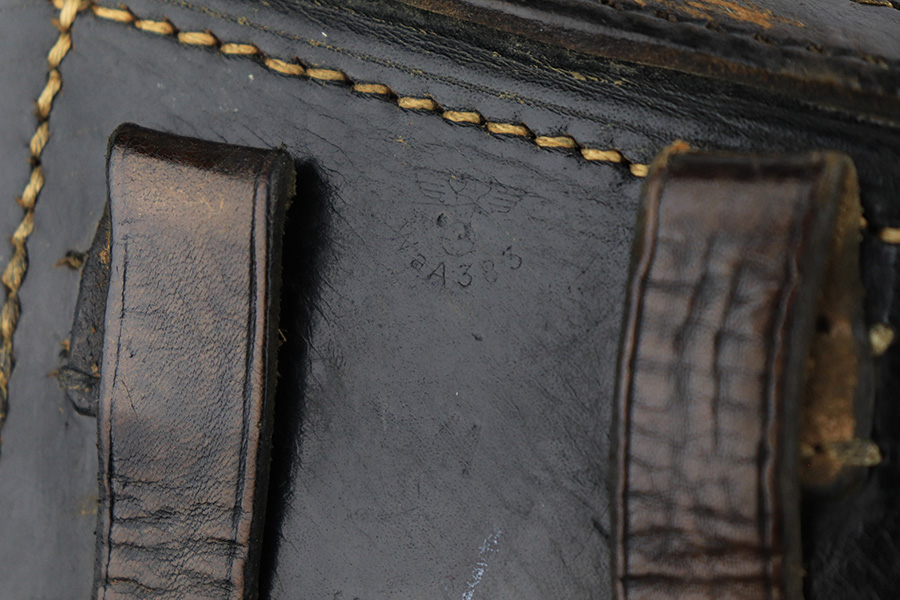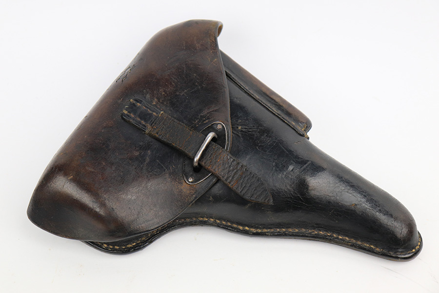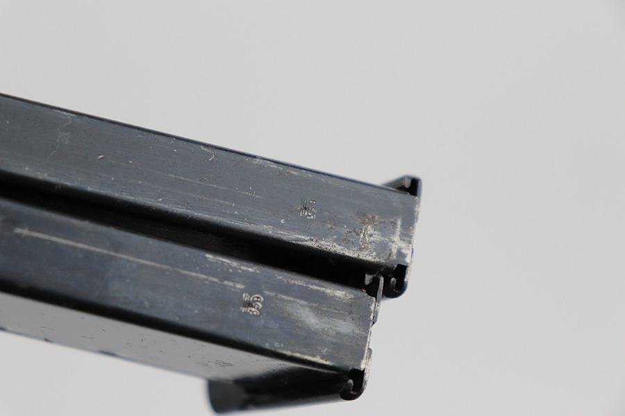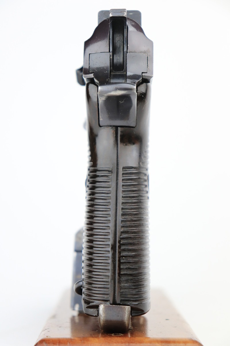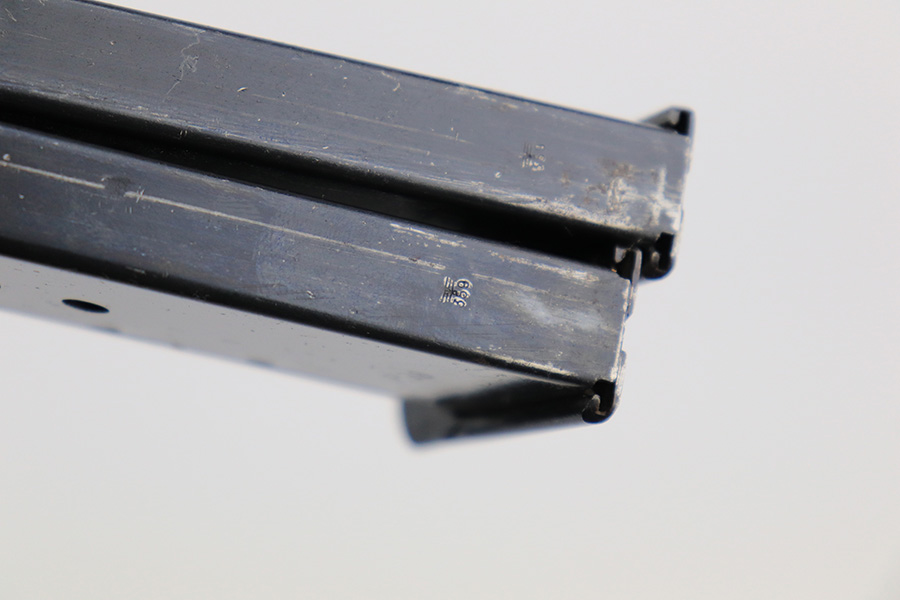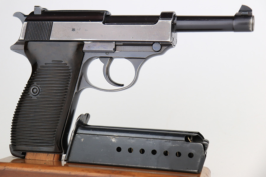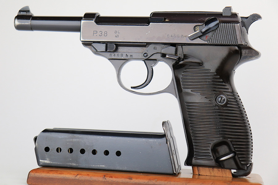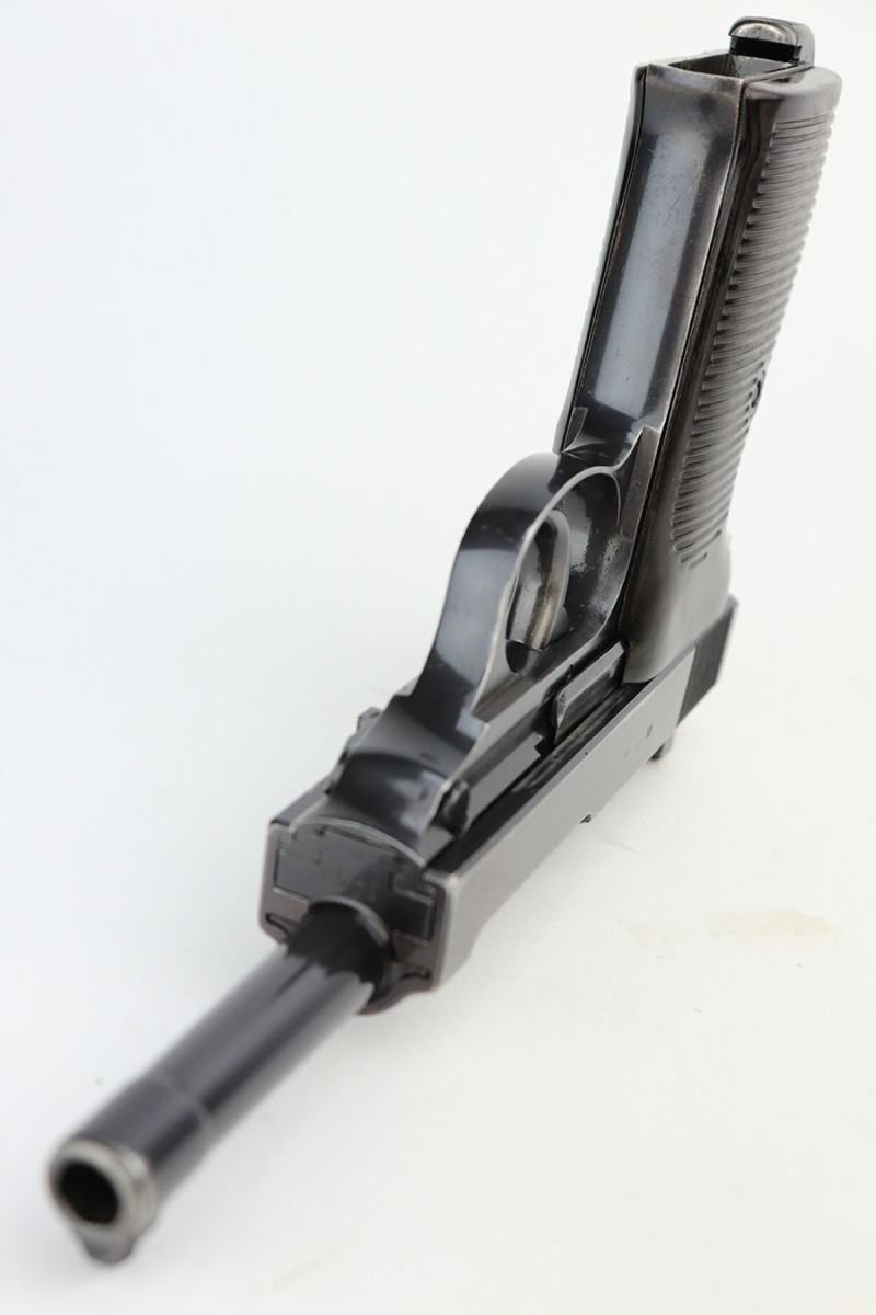 7/8/24 – This is an excellent example of an AC 41 Walther P.38 issued to the Nazi military in 1941. All matching with the proper “Eagle 359” military acceptance proofs throughout, even on the small parts. It comes as a complete rig with a very nice 1941-dated hard shell holster and two original matching-numbered magazines. The gun itself has retained about 95% of its original high polish finish. There is minor wear around the muzzle, along both sides of the slide (concentrated mostly around the high edges), and one small area of wear on the top strap. A few tiny dots of discoloration along both sides of the slide. Fitted with excellent “Eagle 359” proofed Walther grips. The bore has great rifling, but there is minor freckling in the grooves. De-cocker is functional.