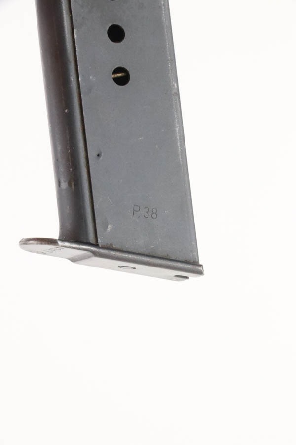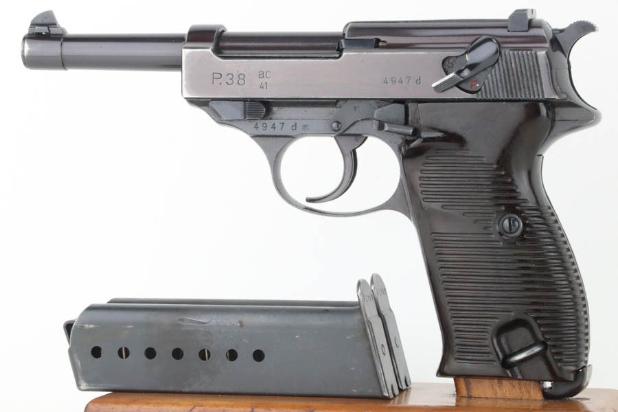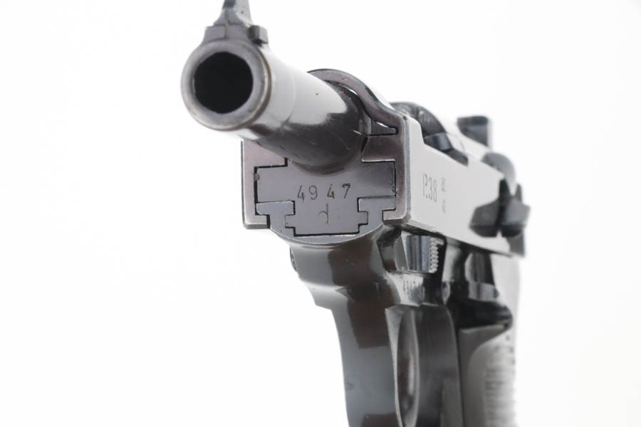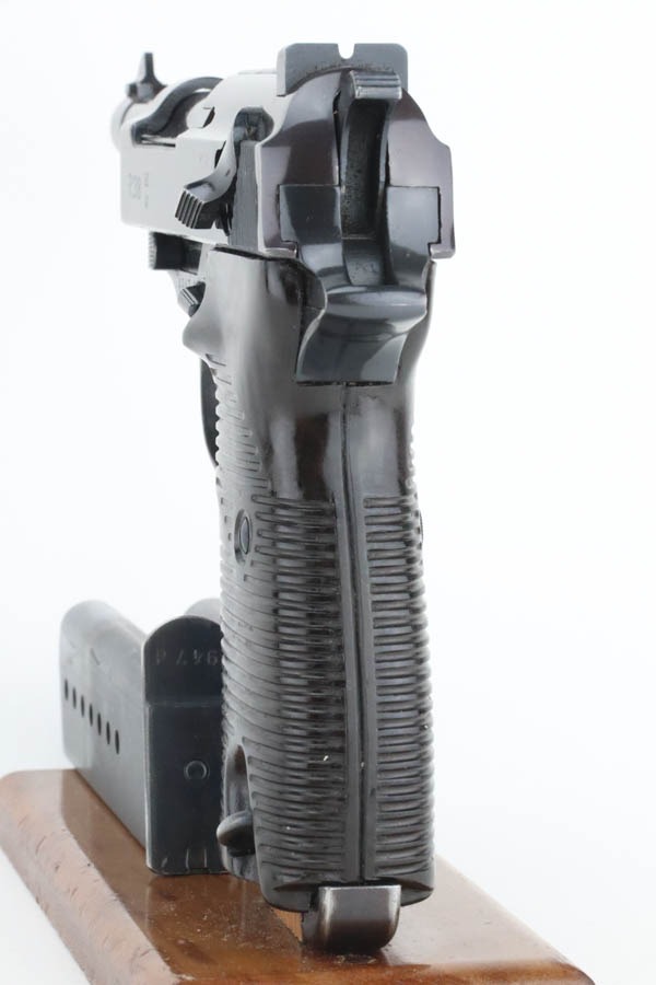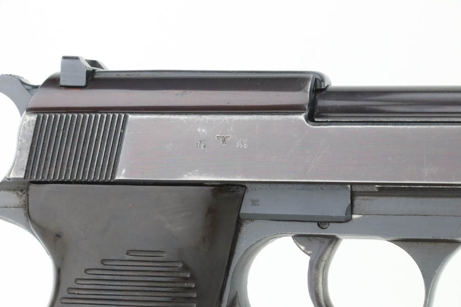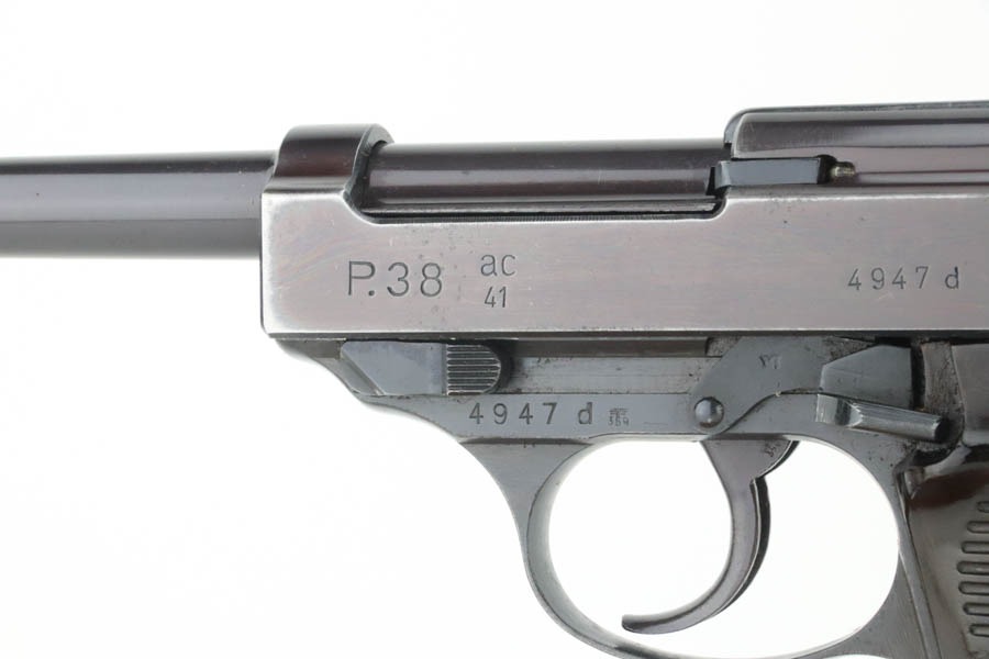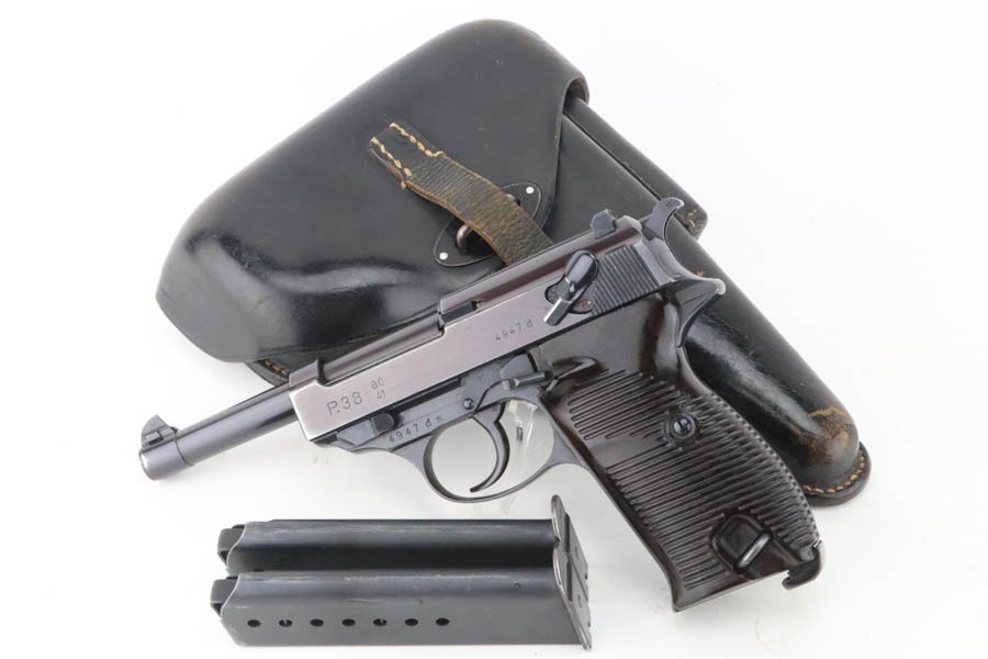 10/4/24 – This is an excellent example of an AC 41 Walther P.38 issued to the Nazi military in 1941. All matching with the proper “Eagle 359” military acceptance proofs throughout, even on the small parts. It comes as a complete rig with a beautiful, near-mint 1941-dated hard shell holster and two original matching-numbered magazines. The gun itself has retained about 95% of its original high polish finish. There is minor wear around the muzzle, on the high edges of the slide, a few very light surface scratches on the right side of the slide, and some very light freckling on the front strap. The finish on the slide has a really nice slight plum color to it. Fitted with excellent “Eagle 359” proofed Walther grips. The bore is mostly shiny with great rifling, but there is some light freckling here and there. De-cocker is functional.