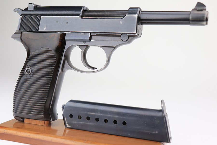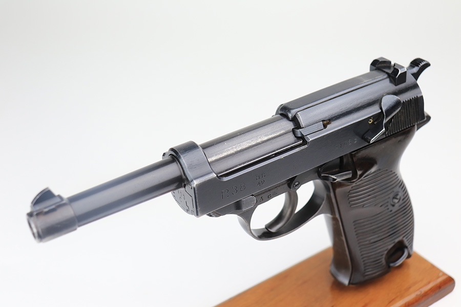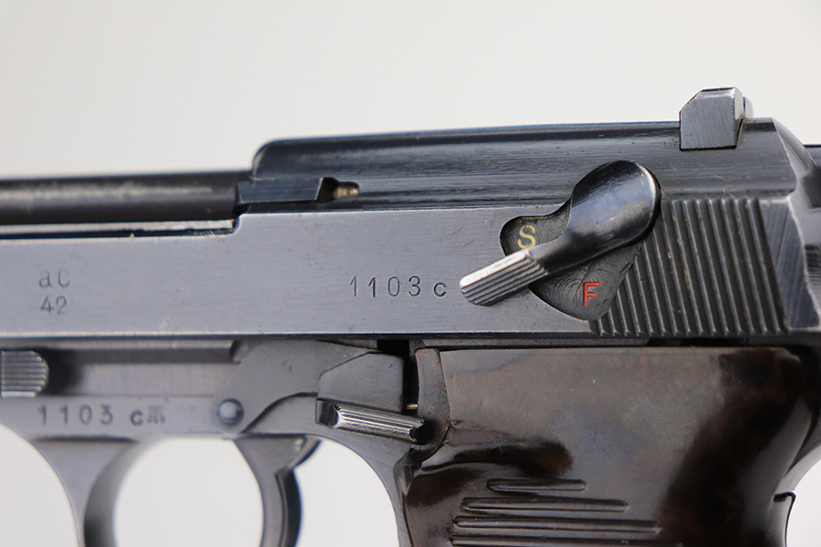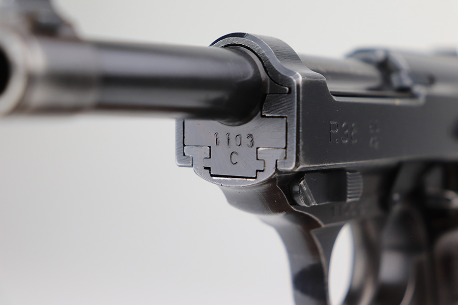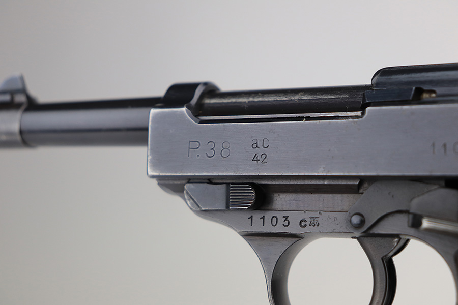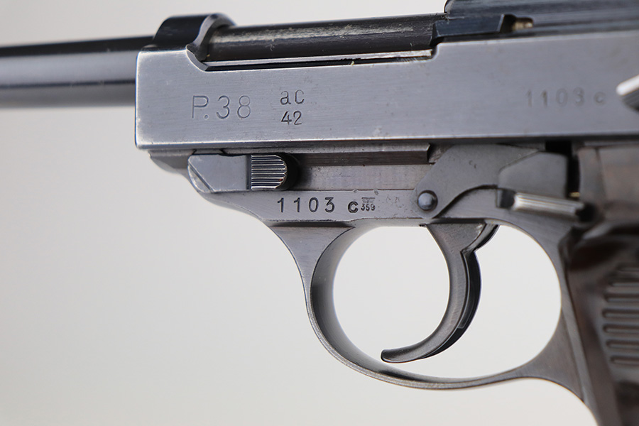 3/3/22 – This is an excellent example of an AC 42 Walther P.38 issued to the Nazi military in 1942. The gun is all matching and has the proper “Eagle 359” Nazi military acceptance proofs throughout. This one also comes with one original matching-numbered magazine. The gun has retained about 95% of its original finish. There are areas of minor somewhat spotty wear on the right side of the slide and on the front strap. Very minor wear on the high edges of the slide and around the muzzle. A streak of light wear in the ejection port. There are some light scuffs on the left side of the slide, around the safety lever. Comes with excellent period-correct bakelite grips. The bore is shiny with very strong rifling and areas of very light freckling here and there. De-cocker is functional.