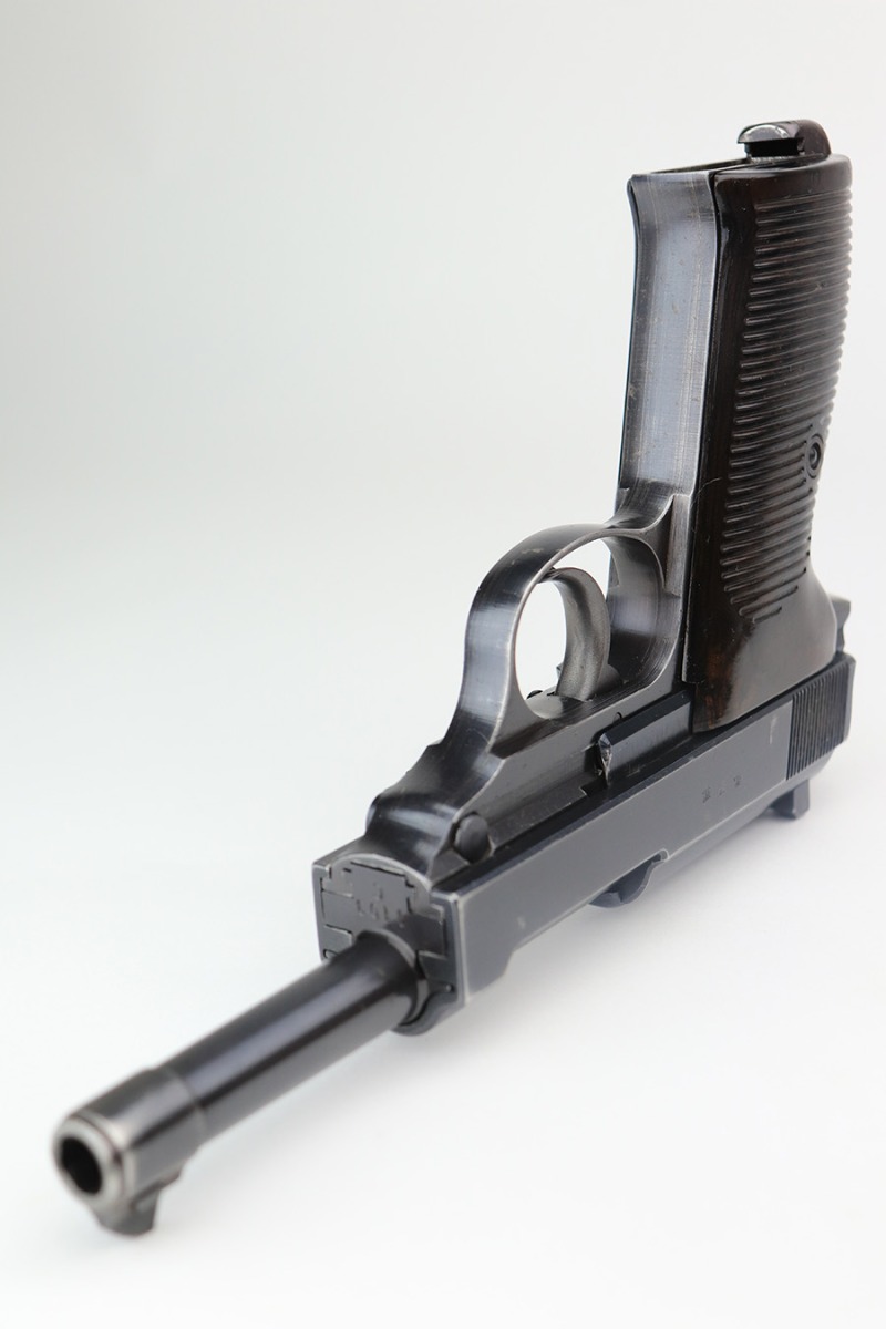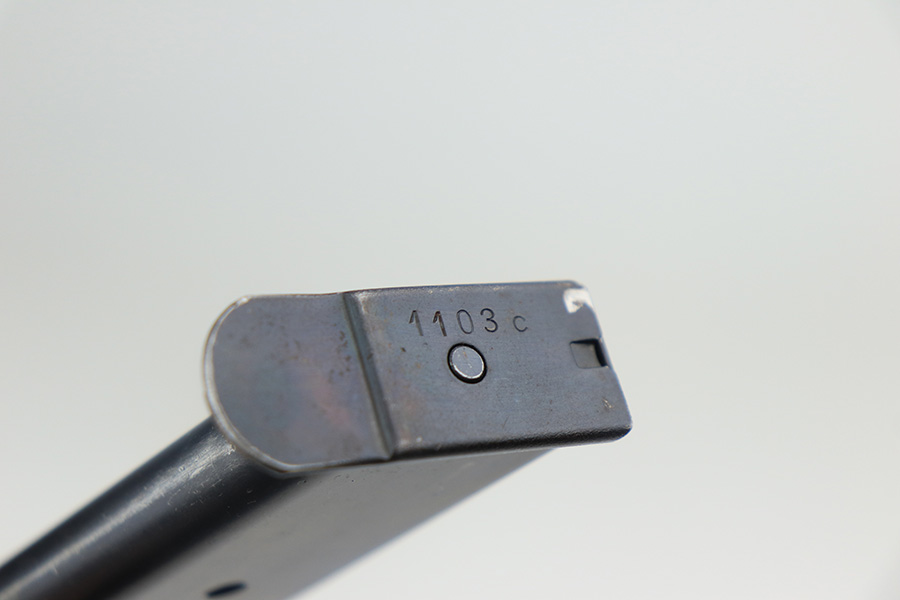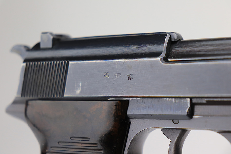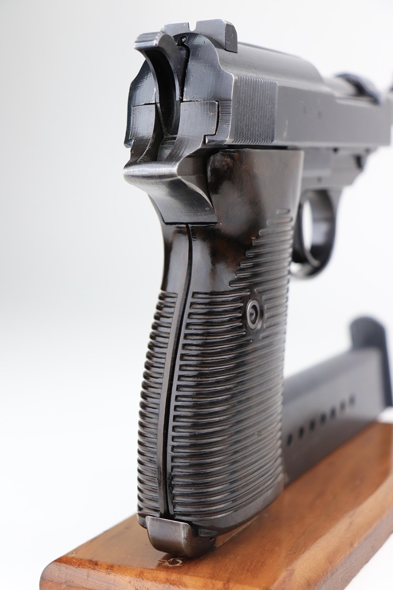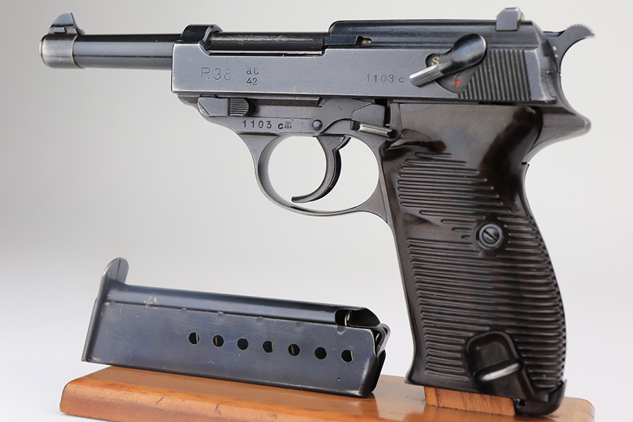 3/3/22 – This is an excellent example of an AC 42 Walther P.38 issued to the Nazi military in 1942. The gun is all matching and has the proper “Eagle 359” Nazi military acceptance proofs throughout. This one also comes with one original matching-numbered magazine. The gun has retained about 95% of its original finish. There are areas of minor somewhat spotty wear on the right side of the slide and on the front strap. Very minor wear on the high edges of the slide and around the muzzle. A streak of light wear in the ejection port. There are some light scuffs on the left side of the slide, around the safety lever. Comes with excellent period-correct bakelite grips. The bore is shiny with very strong rifling and areas of very light freckling here and there. De-cocker is functional.
