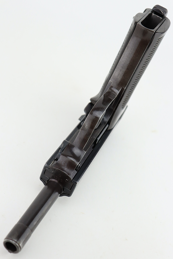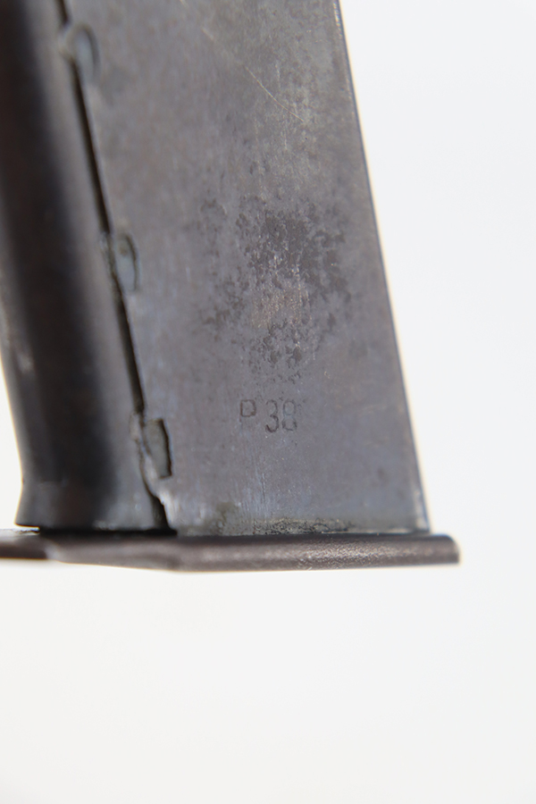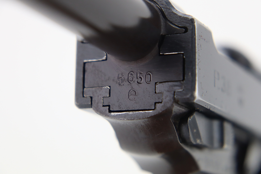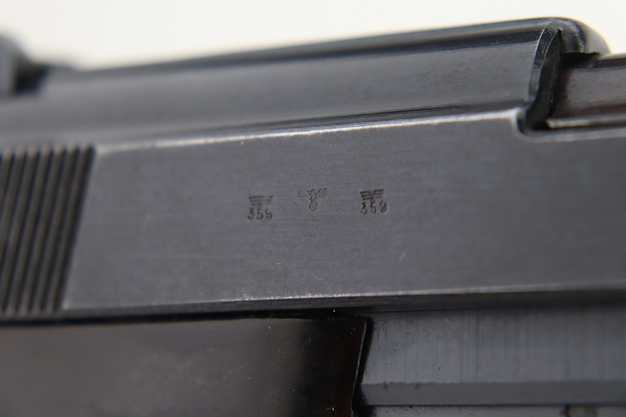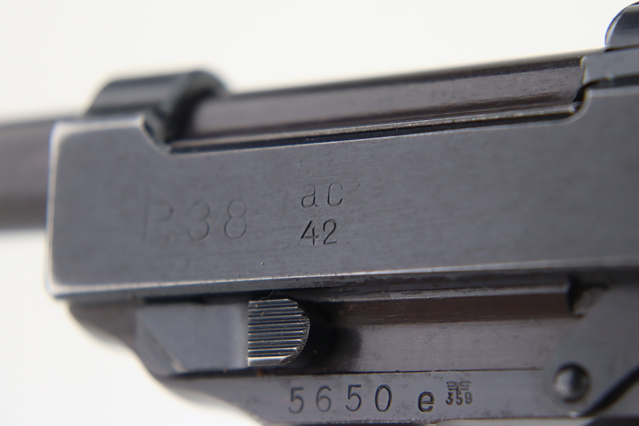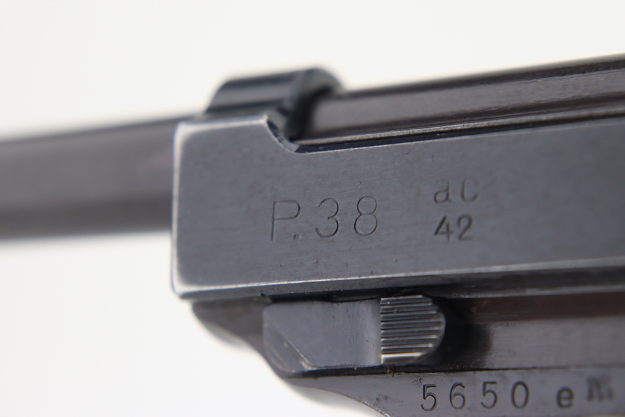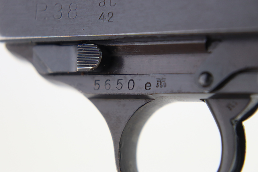 1/31/24 – This is an excellent example of an AC 42 Walther P.38 issued to the Nazi military in 1942. All matching with the proper “Eagle 359” military acceptance proofs throughout. It comes as a rig with a generic leather shoulder holster and a jvd magazine. The gun itself has retained about 96-97% of its original finish with very minor muzzle and high edge wear and some minor thinning on the front strap. Fitted with blackish-brown bakelite grips. The bore has good rifling with light freckling in the grooves. De-cocker is functional.