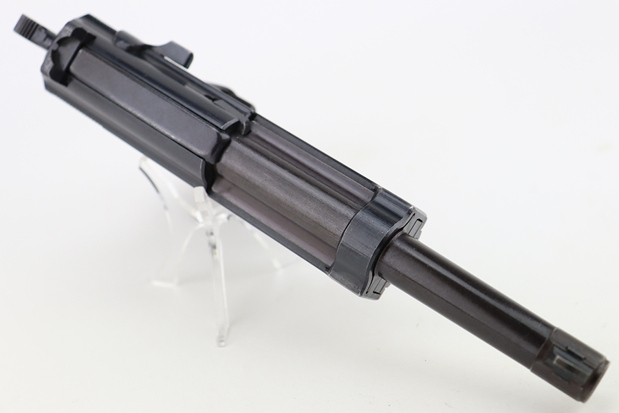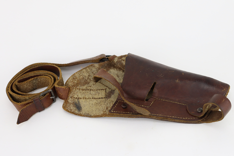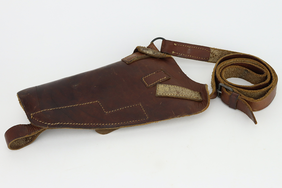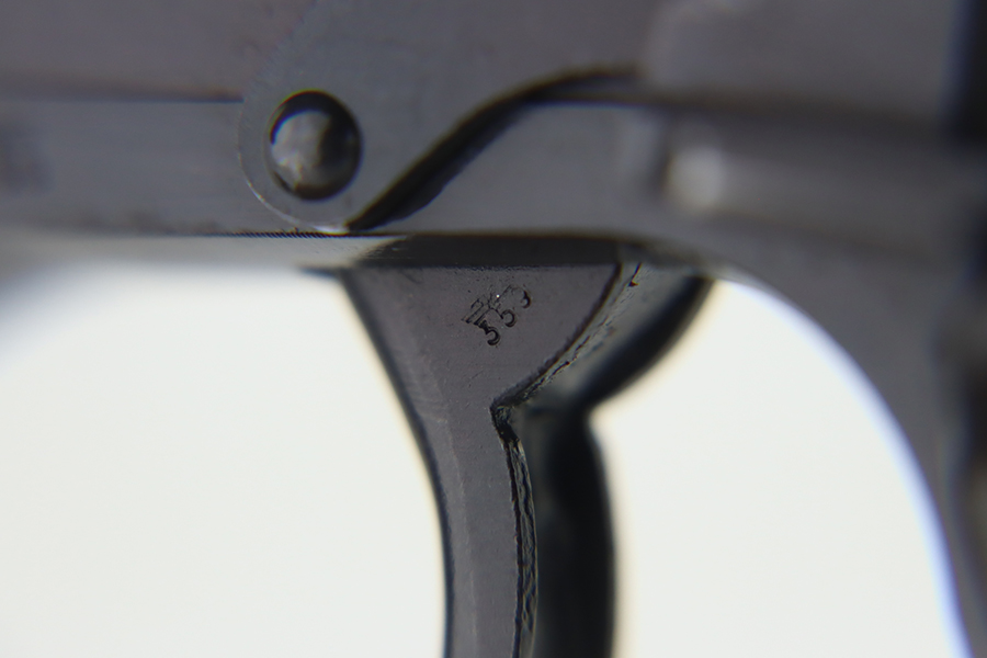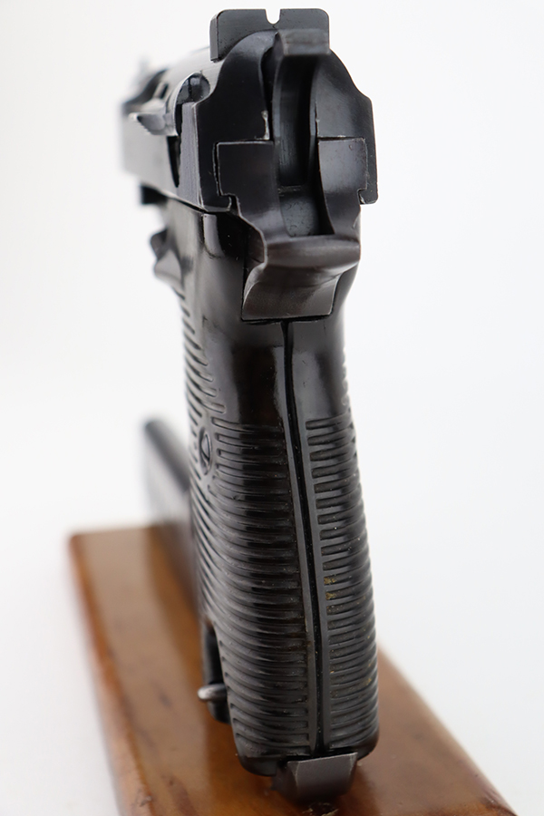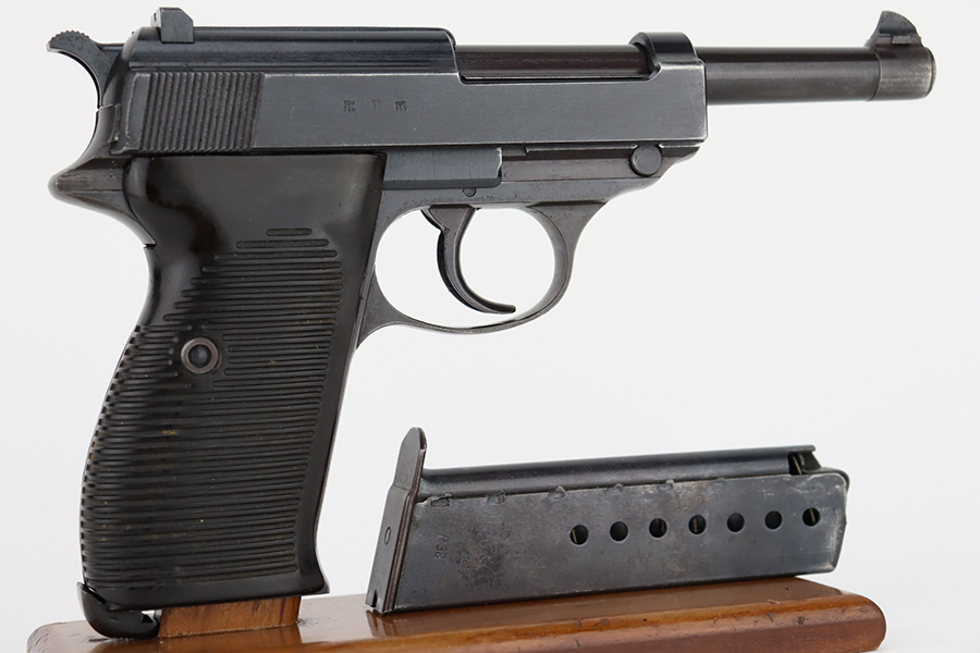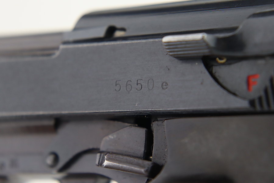 1/31/24 – This is an excellent example of an AC 42 Walther P.38 issued to the Nazi military in 1942. All matching with the proper “Eagle 359” military acceptance proofs throughout. It comes as a rig with a generic leather shoulder holster and a jvd magazine. The gun itself has retained about 96-97% of its original finish with very minor muzzle and high edge wear and some minor thinning on the front strap. Fitted with blackish-brown bakelite grips. The bore has good rifling with light freckling in the grooves. De-cocker is functional.