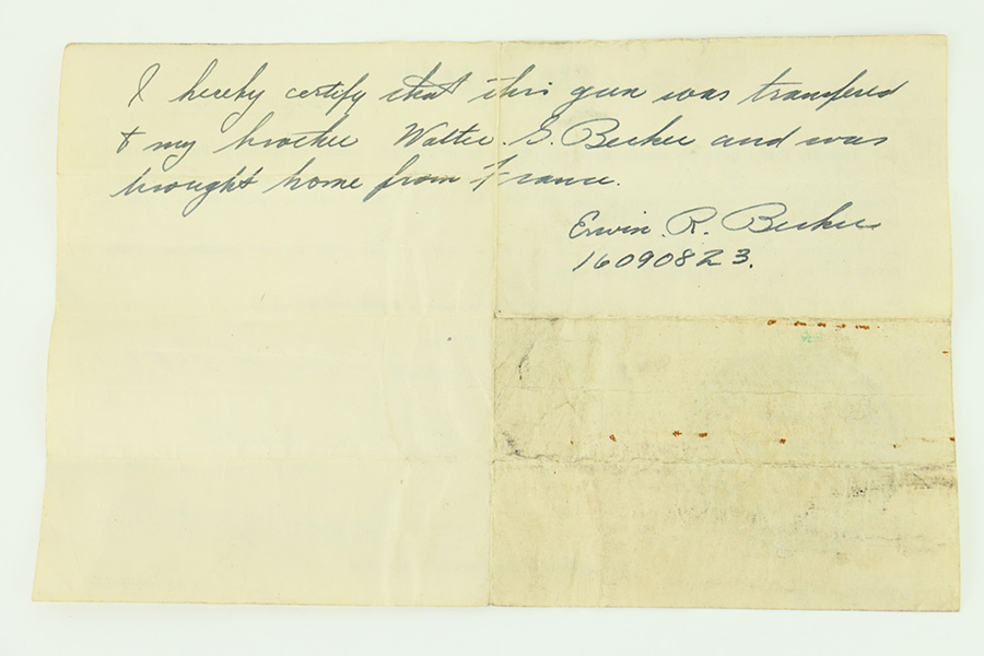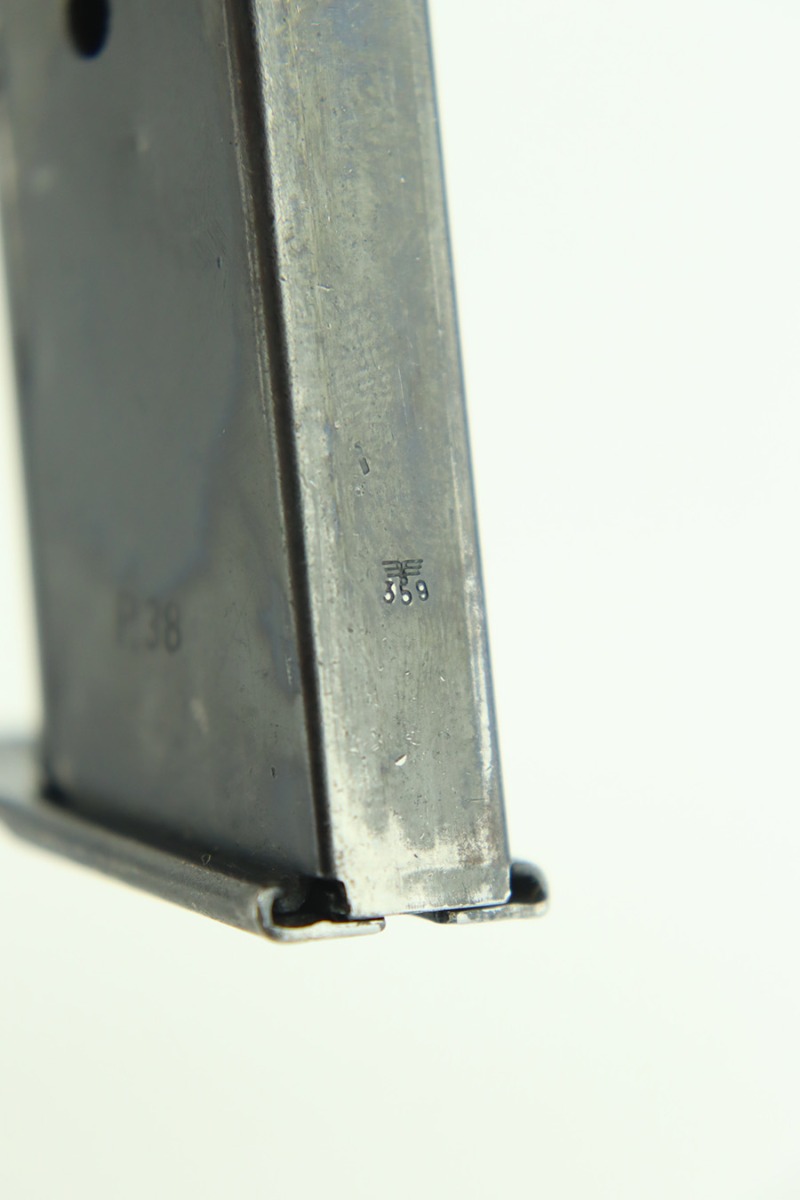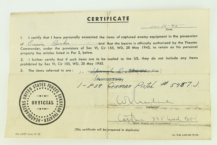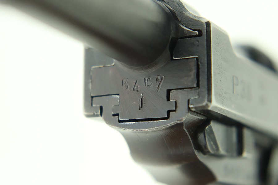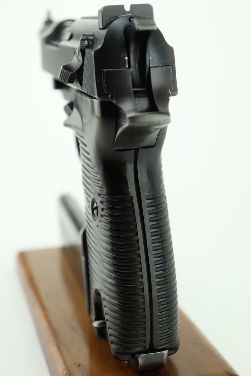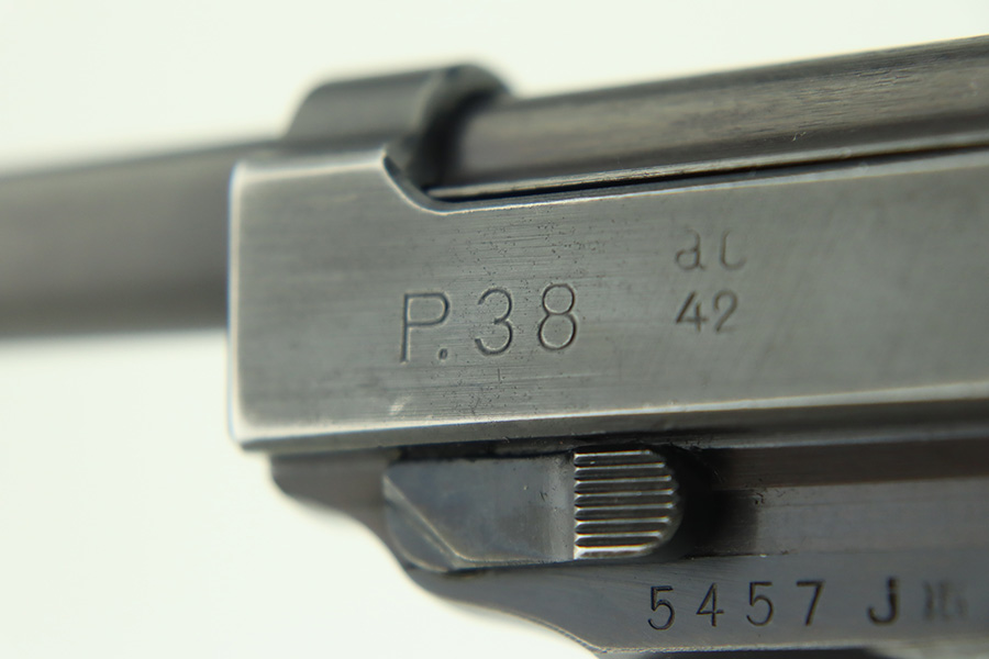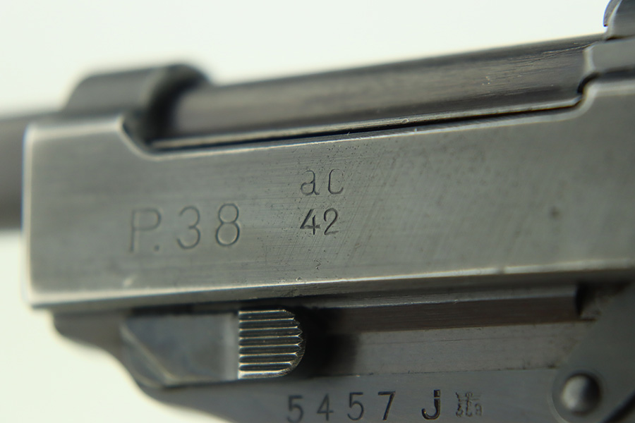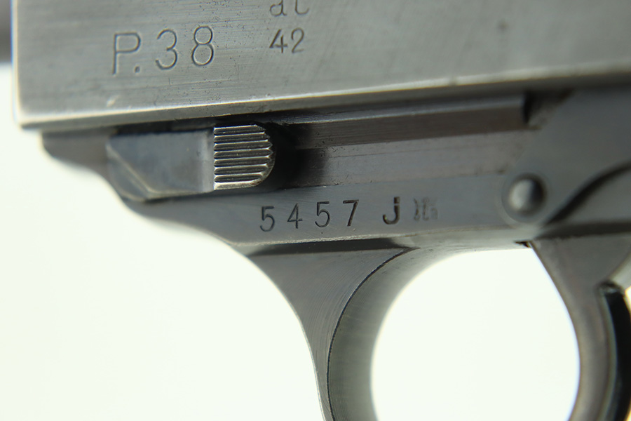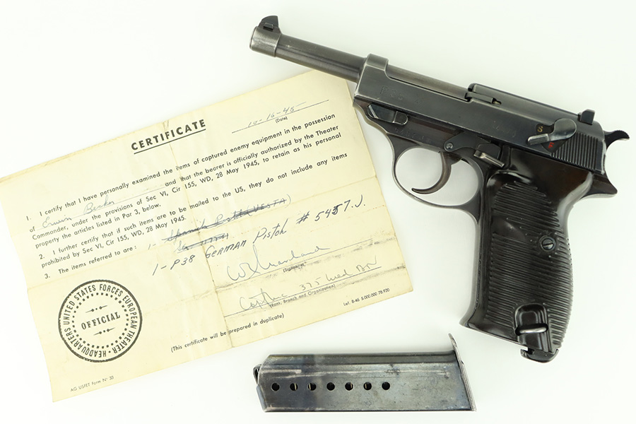 2/1/24 – This is an excellent example of an AC 42 Walther P.38 issued to the Nazi military in 1942. All matching with the proper “Eagle 359” military acceptance proofs. This one also comes with an original capture document that lists this gun by serial number. The original finish rates about 96-97% with just very minor muzzle and high edge wear. Very light pin-pricking along the right side of the slide. Fitted with correct blackish-brown bakelite grips and comes with an “Eagle 359” marked Walther magazine. Minty bore. De-cocker is functional.
