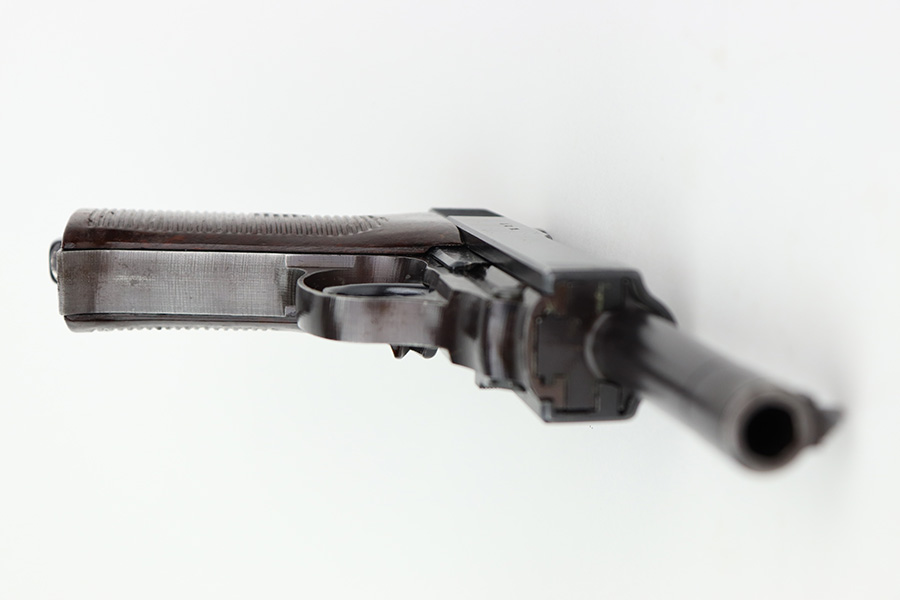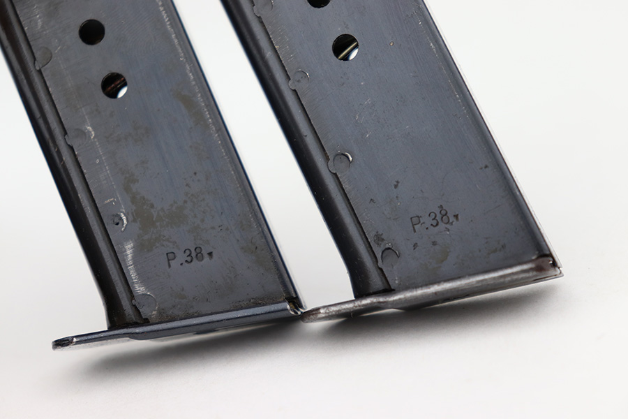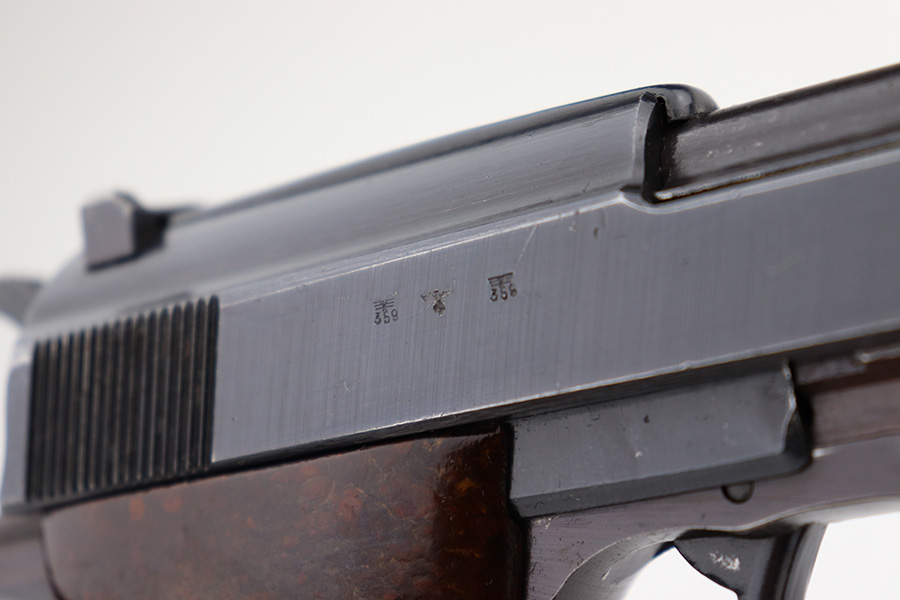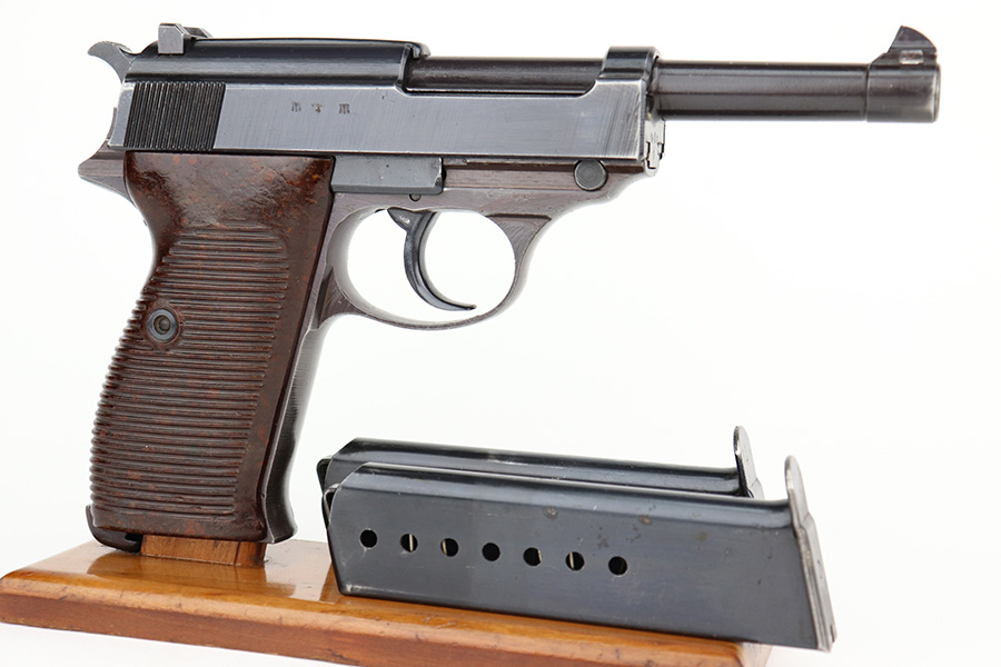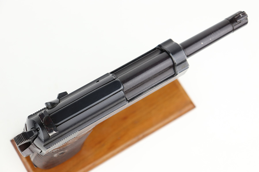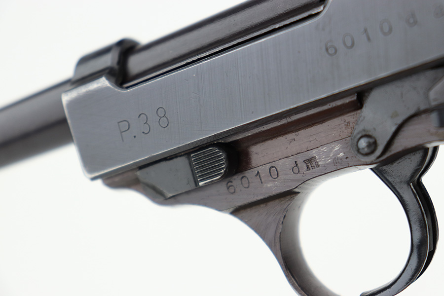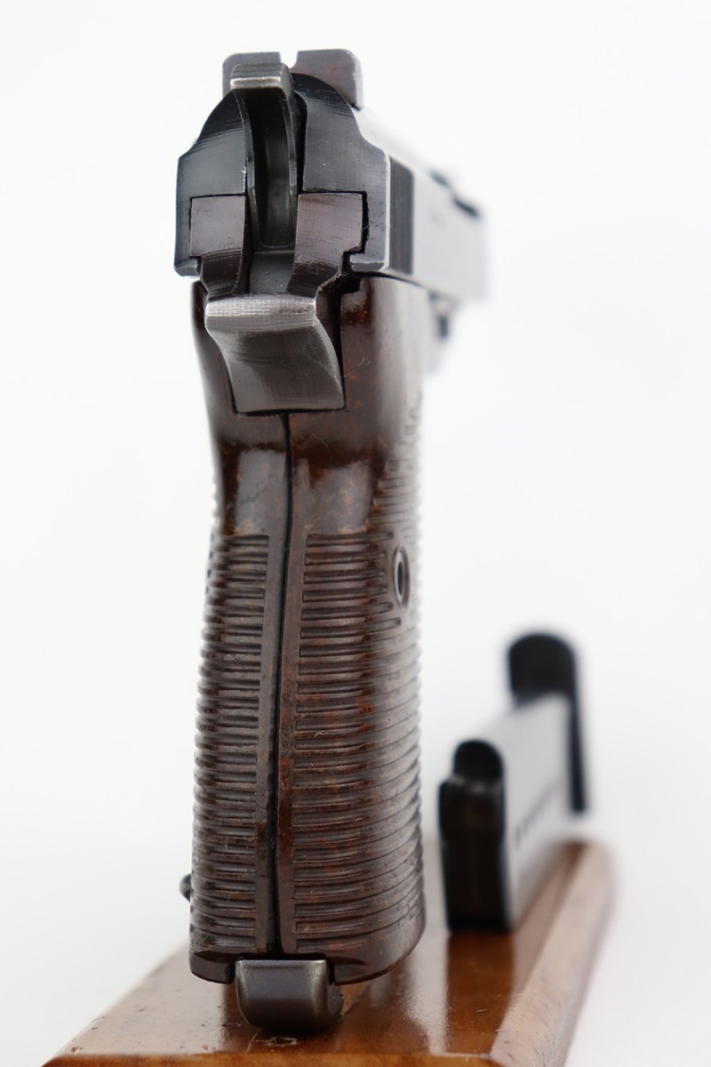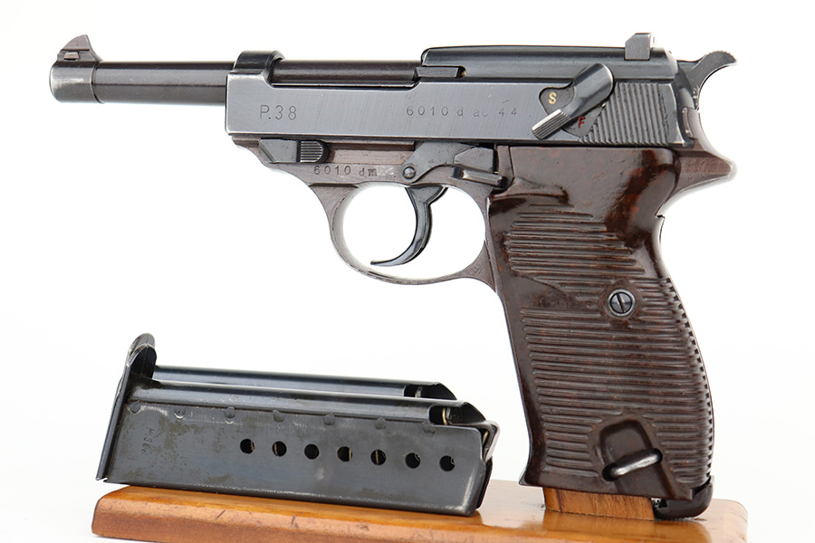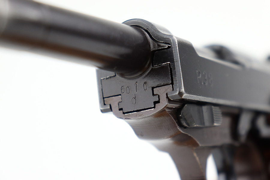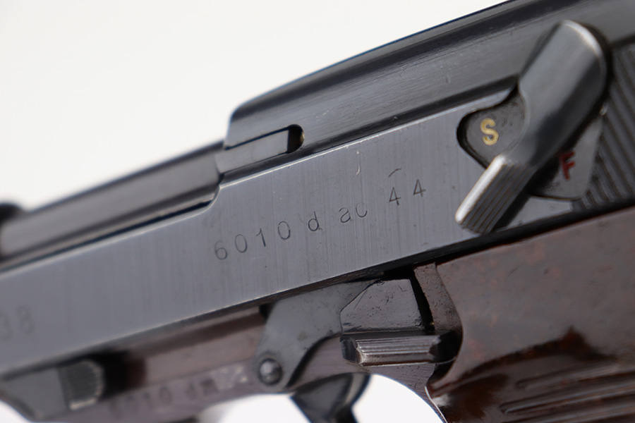8/15/22 – This is an excellent example of an AC 44 Walther P.38 issued to the Nazi military in 1944. The gun is all matching and has the proper “Eagle 359” Nazi military acceptance proofs throughout. There is an “asterisk” marking on the left side of the barrel, indicating it failed initial inspection and was sent back to the factory for repair. It has retained about 96% of its original bluing. The frame has a slight plumb color. Nearly all of the wear is on the front strap, so the profile views are minty. It comes with excellent reddish bakelite grips and two period-correct magazines – one is Walther and one is Mauser. The bore is near-mint. De-cocker is functional.