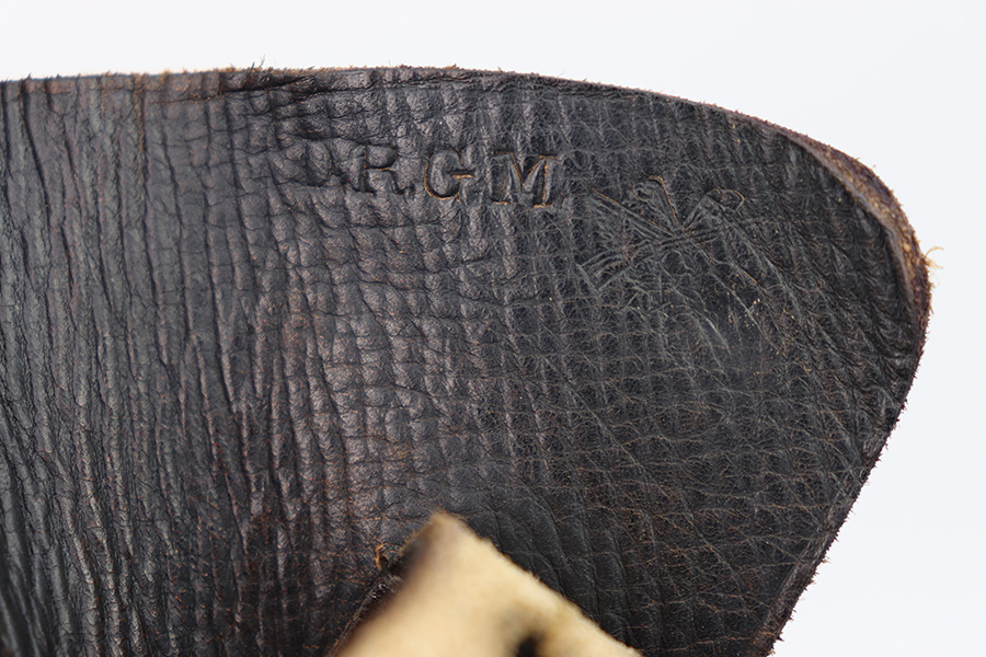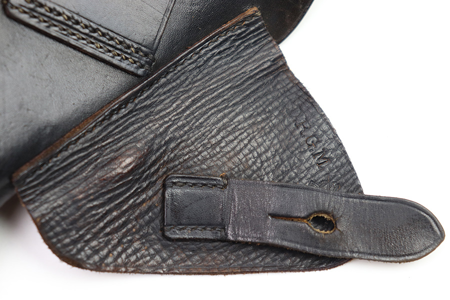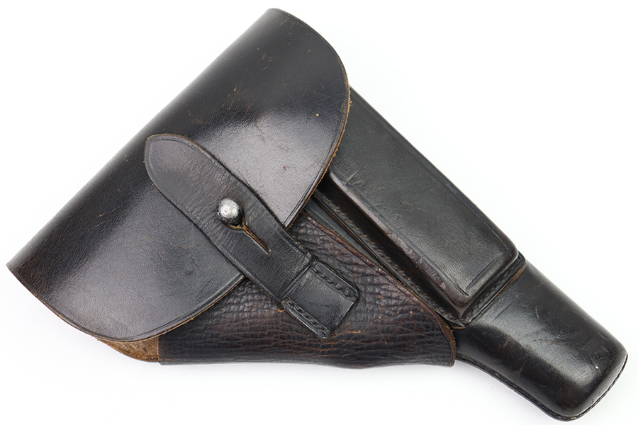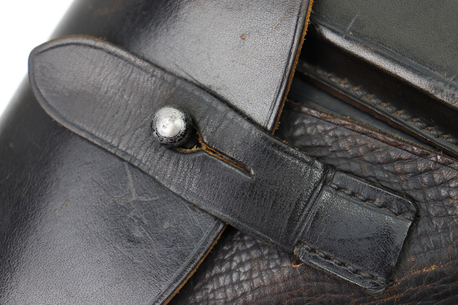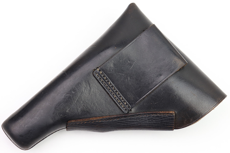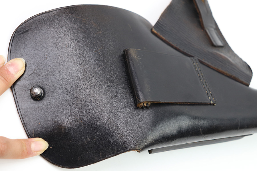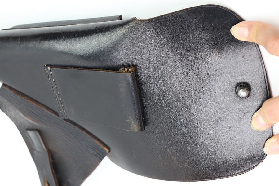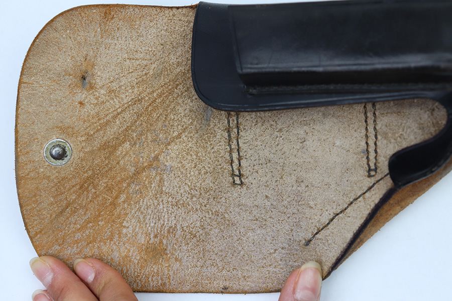 10/24/22 – This is an excellent example of an AKAH made holster for a Walther PP. The leather is in beautiful condition showing only minor signs of use/wear throughout. The stitching is consistent and original throughout. The flap and closure strap are in excellent condition with minimal wear. There is a crisp AKAH maker mark on the side flap and the side flap itself has some wrinkling. The interior leather is clean other then some surface scratch marks as shown. Overall, a clean example of an Akah-made PP holster.