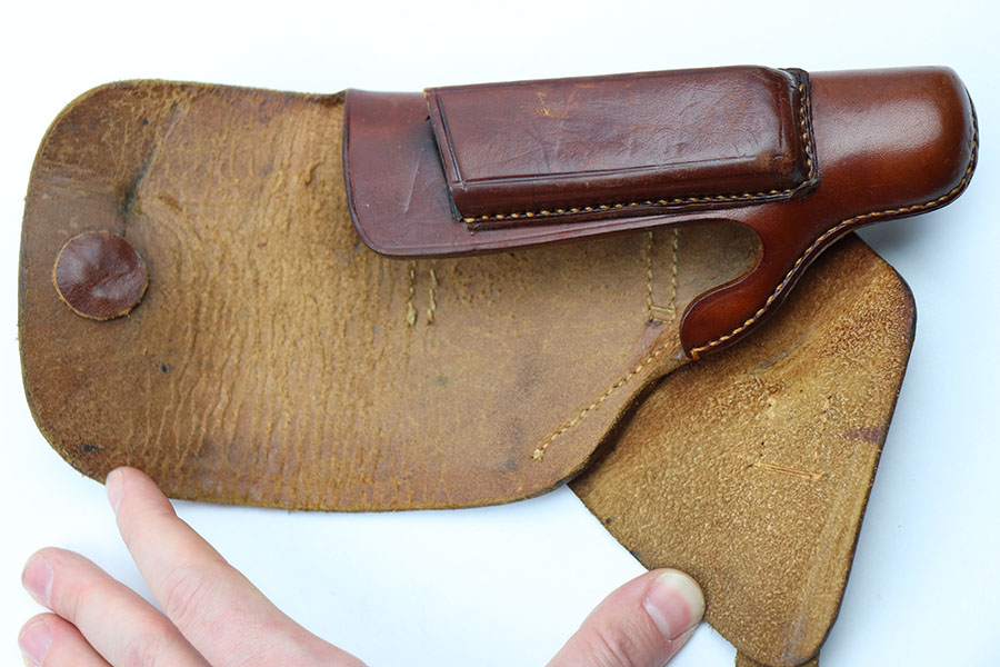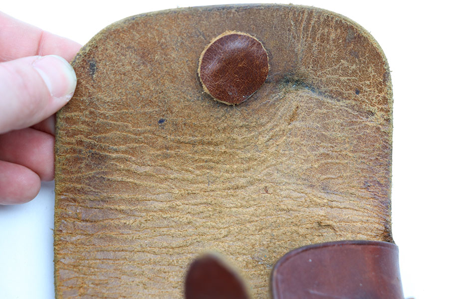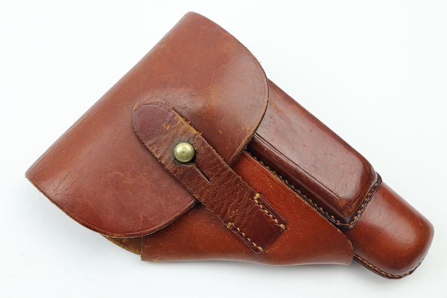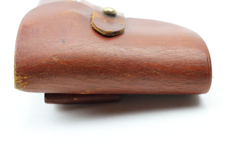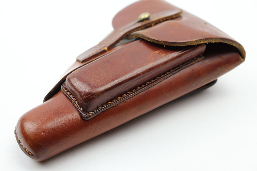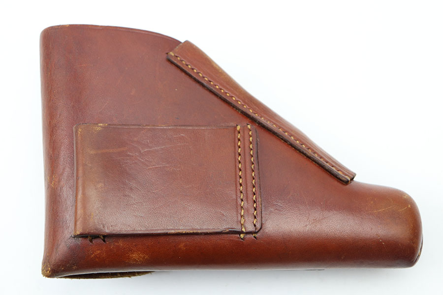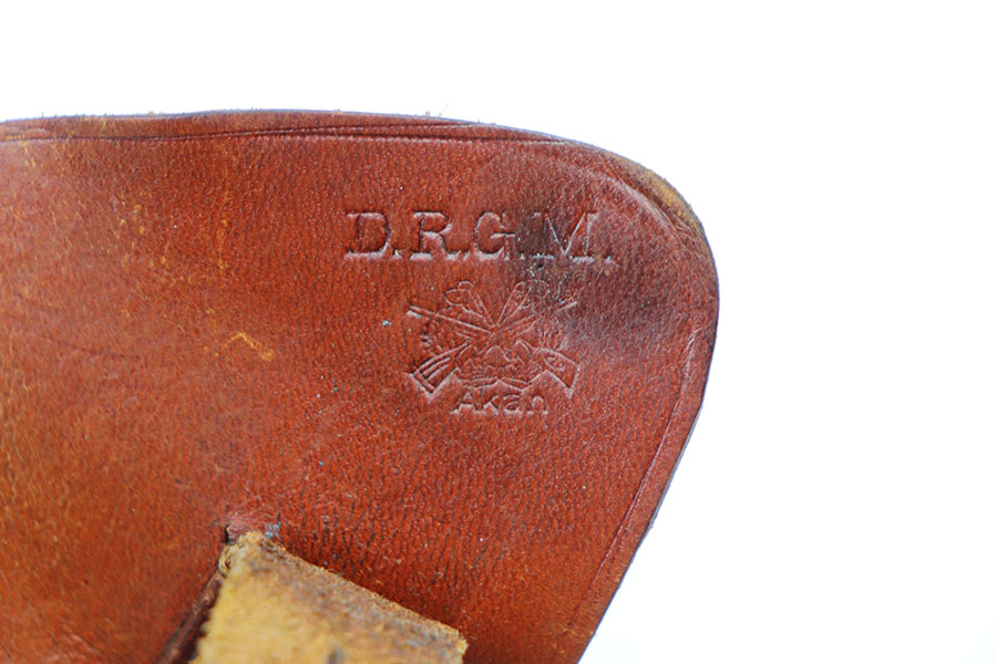 5/4/21 – This is an excellent example of an AKAH PPK Holster. The holster has early brown leather and an early brass closure knob. Very nice, crisp leather and stitching. Strongly stamped under the closure strap with an AKAH DRGM maker stamp.