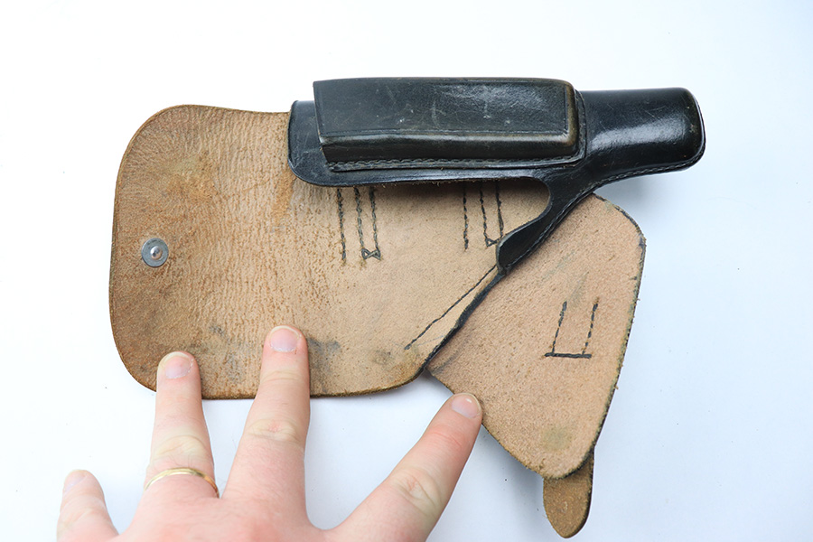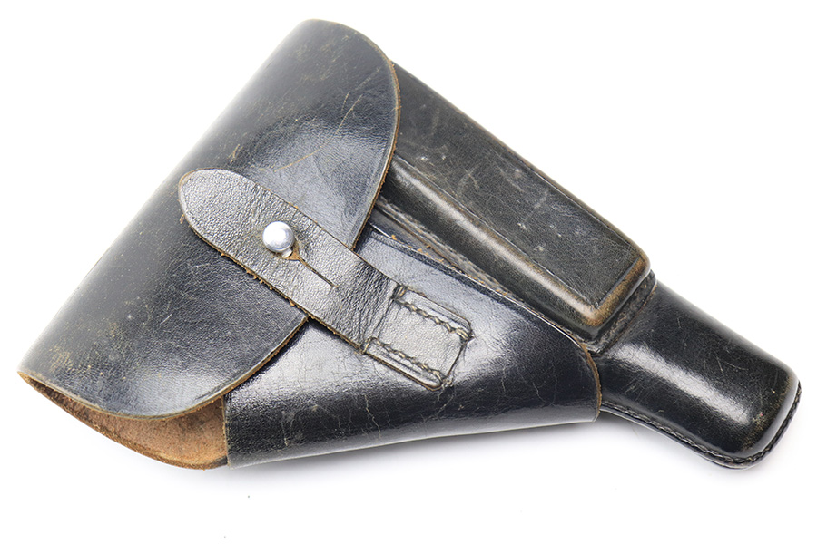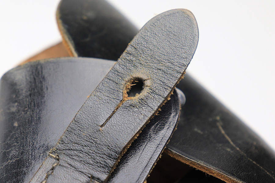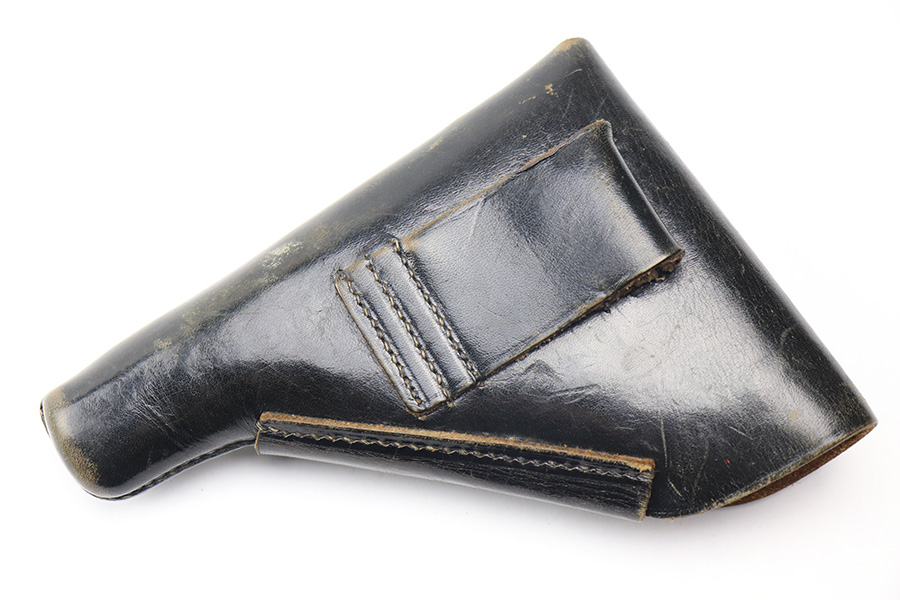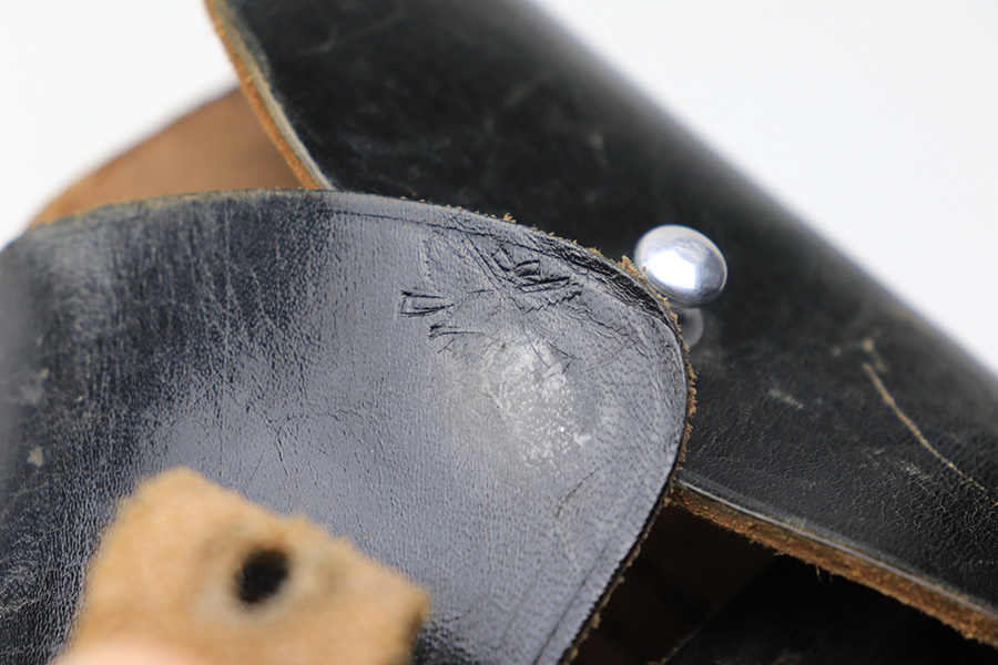 12/3/21 – This an excellent example of a black leather holster for a Walther PP manufactured by Akah during the WW2 era. The leather of the holster is in great condition with only minor scratchy surface wear throughout. The leather is still firm in most areas and only shows light fading on the backside along the spine and toward the muzzle. The closure strap is in great condition. The stitching is intact throughout the holster and appears original. Interestingly, there’s a third line of stitching on the belt loop. The Akah maker mark is slightly faded but intact under the closure strap. Overall the holster is an excellent piece.