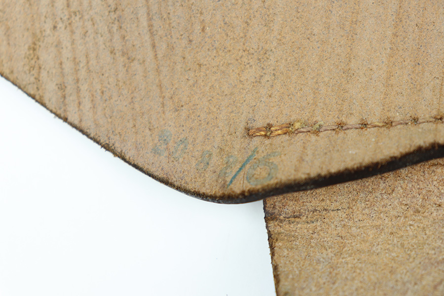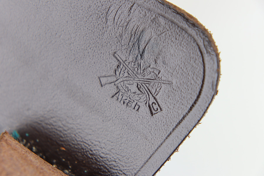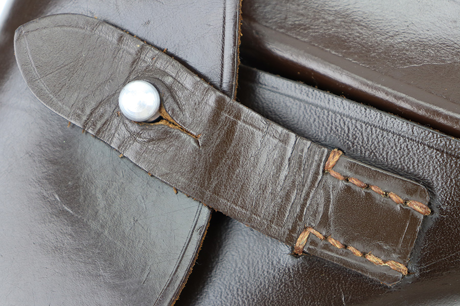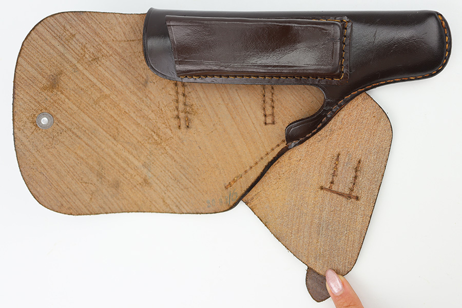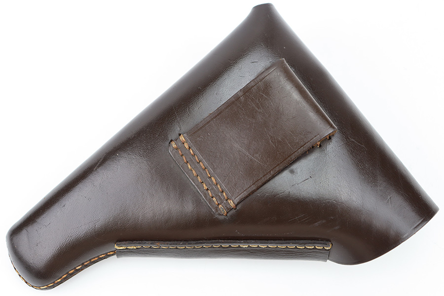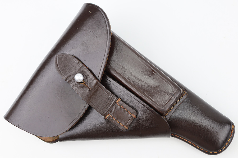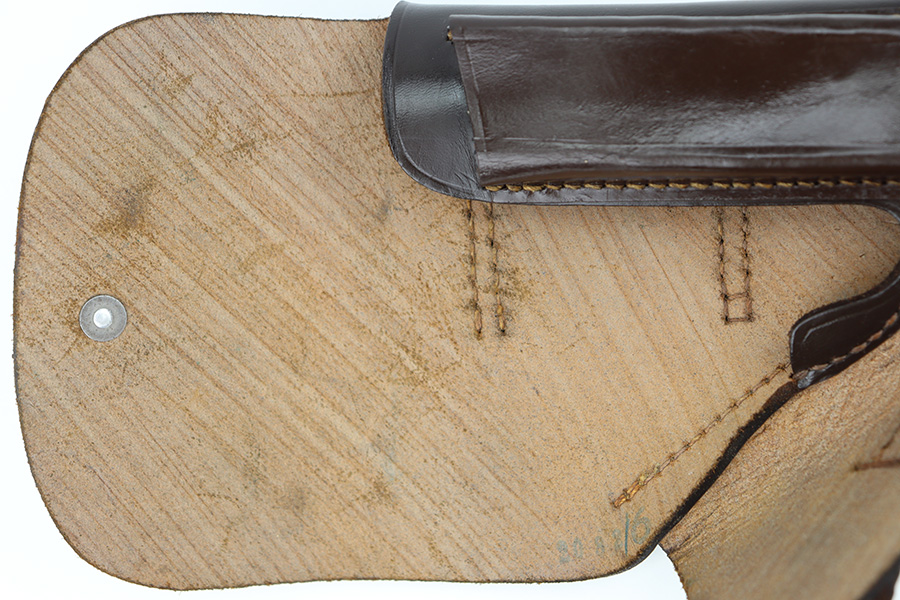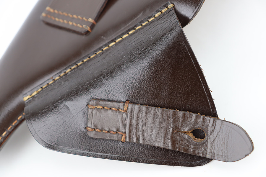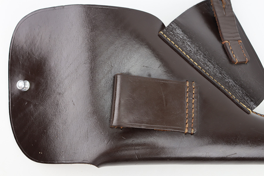 12/27/23 – This is an excellent condition AKAH Walther PP holster. The holster has strong, clean leather that’s chocolate-brown colored with minimal surface wrinkling and handling wear. The interior leather is crisp and clean. There’s an AKAH maker stamp under the closure strap, and a faint interior ink stamp, as shown. Excellent stitching throughout as well. Based on the style of the interior leather, the style of AKAH stamp, and overall condition of the holster, we believe this is an immediate postwar production.