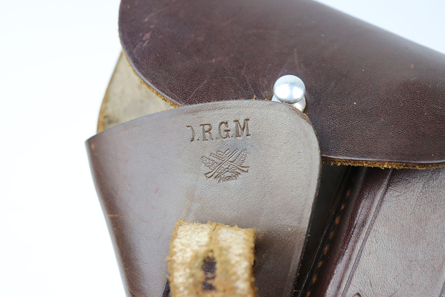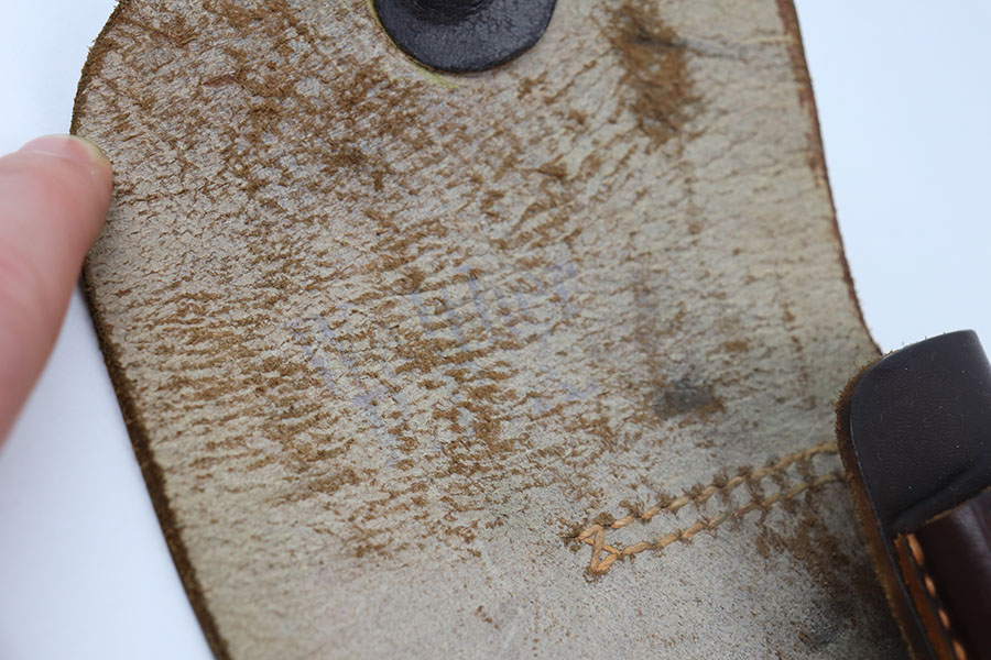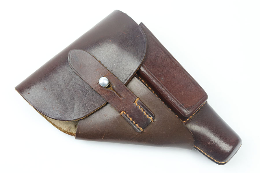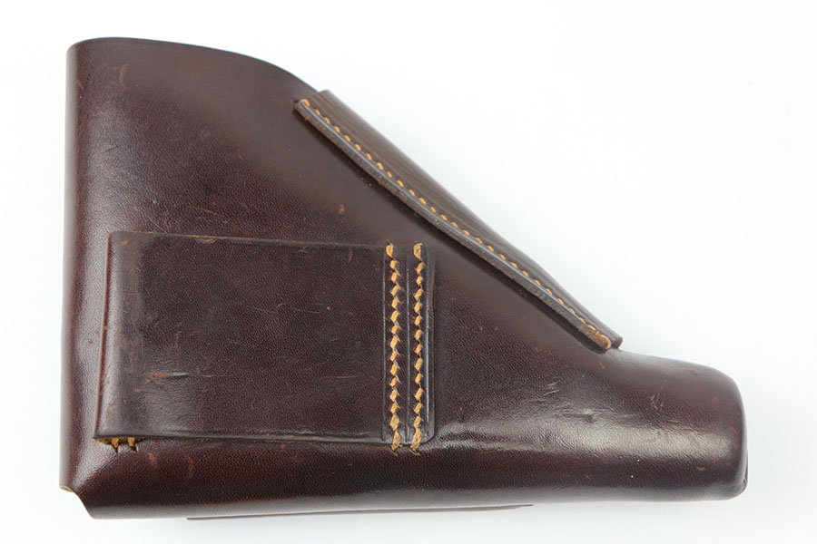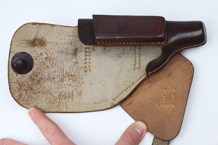 6/4/21 – This is an excellent, all original condition AKAH Walther PPK Holster from WW2. The holster has very nice, clean brown leather with minimal wear. The interior leather shows some light signs of use, but still displays the original WALTHER PPK ink stamp. There’s also an AKAH maker stamp under the closure strap. Excellent stitching is completely intact.