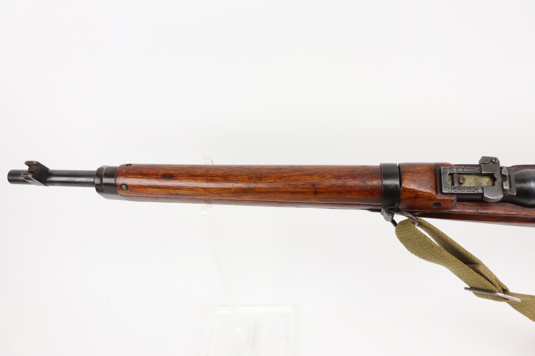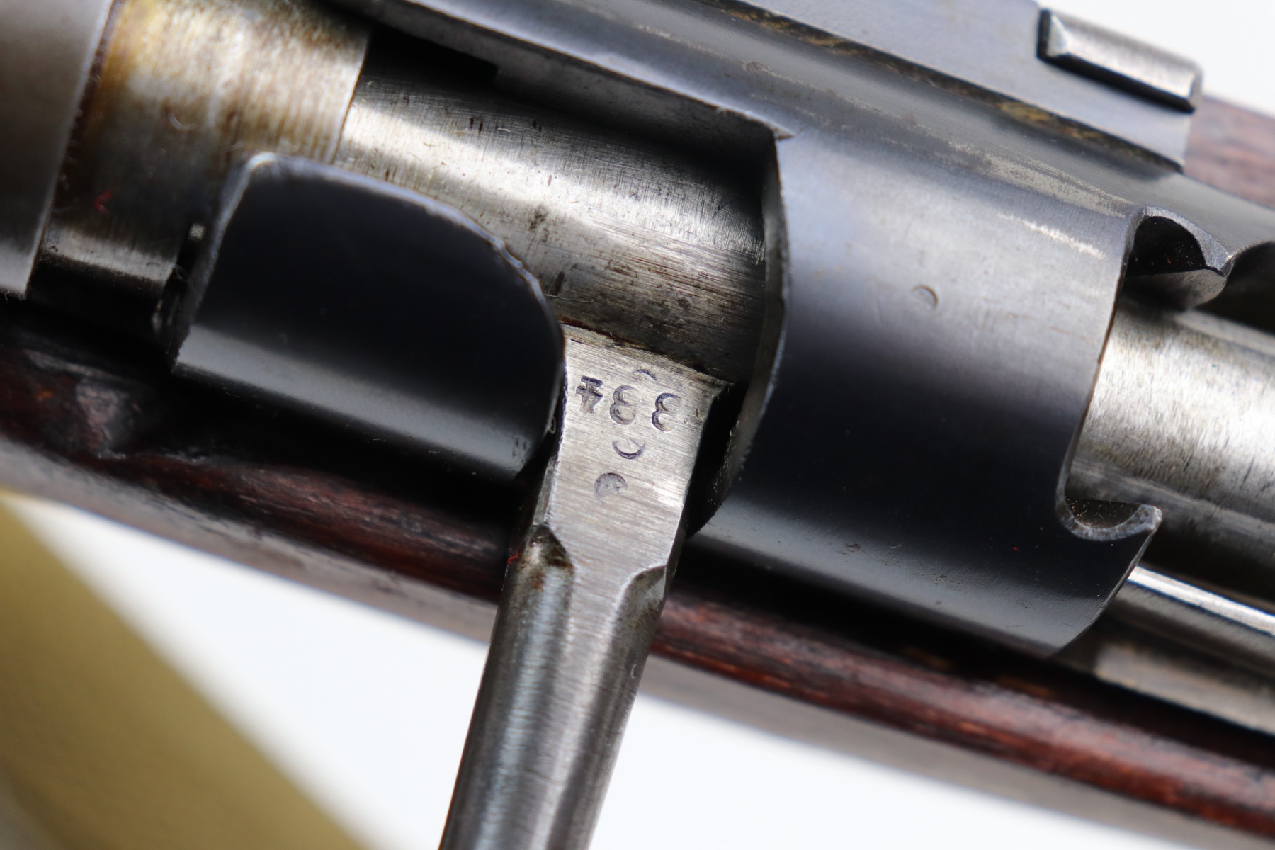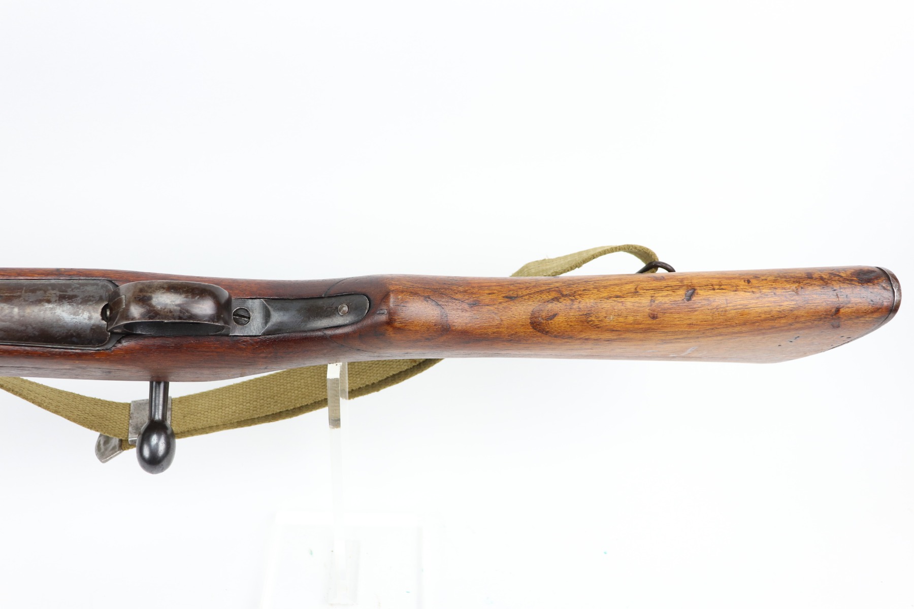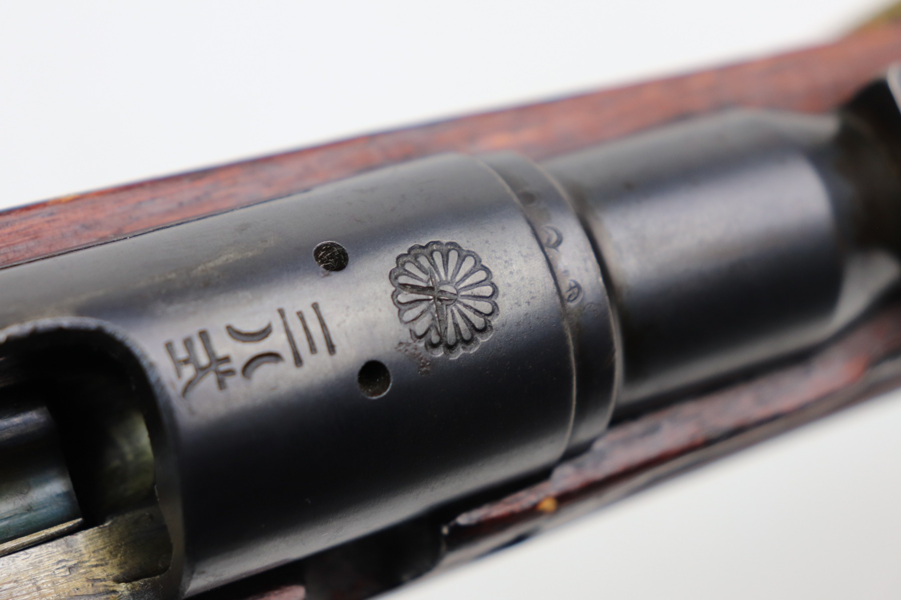 4/12/21 – This is an excellent example of an Arisaka Type 38 Carbine issued to the Japanese military during WW2. The mum stamp on the receiver is almost entirely in tact, but there is a faint “X” through it. The gun is all matching except for the firing pin and cocking knob. Comes with an original sling. The gun has retained most of its bluing, but there is splotchy discoloration throughout, most noticeable on the barrel and floor plate. The stock is excellent but has been sanded. Excellent bore – shiny with strong rifling.