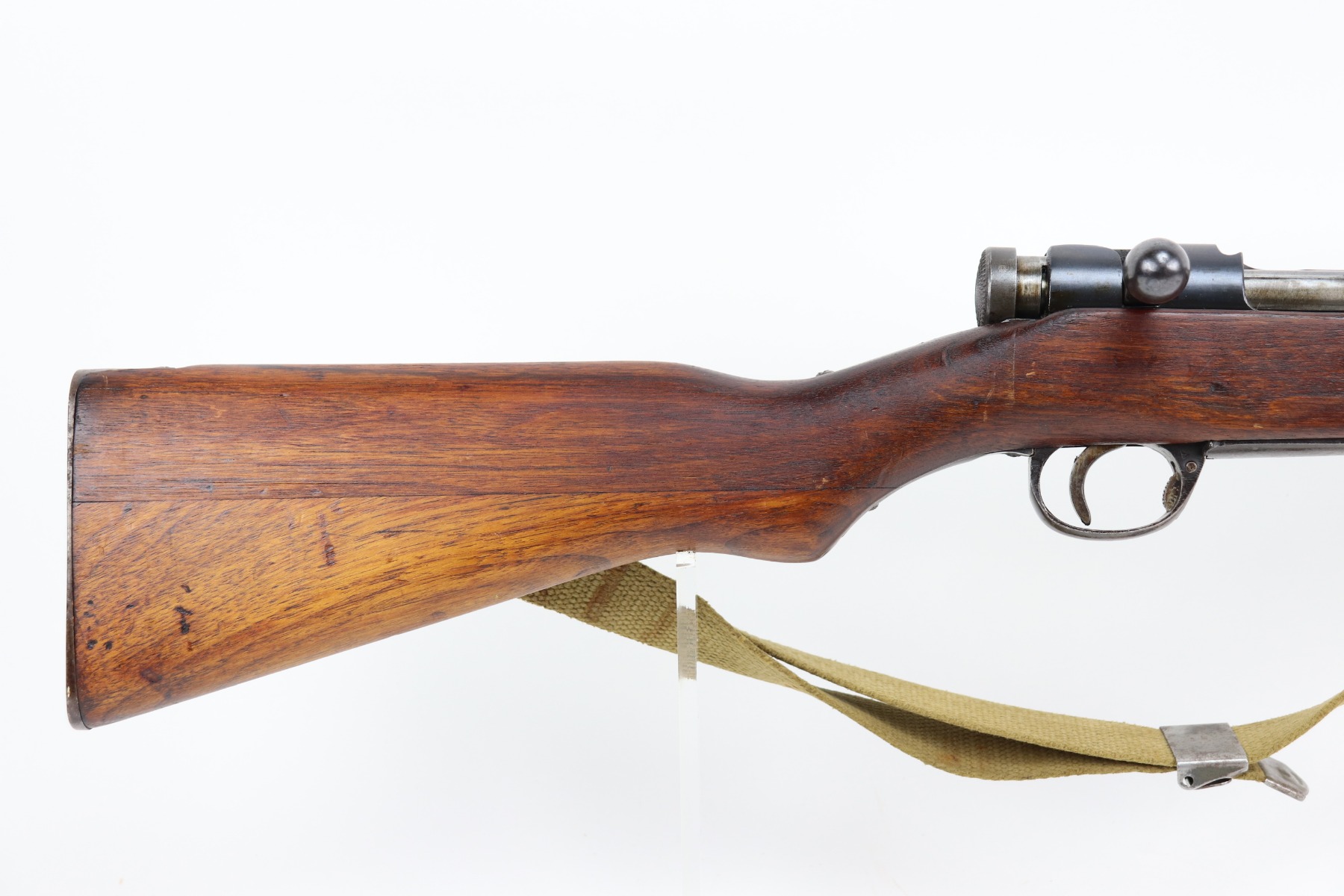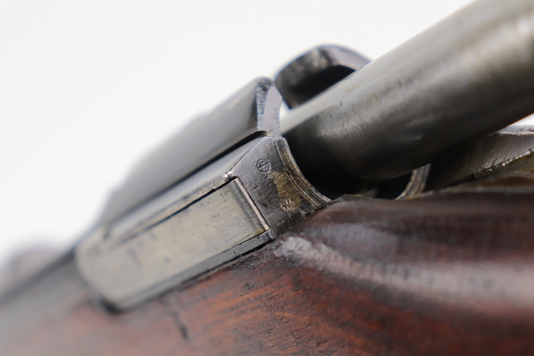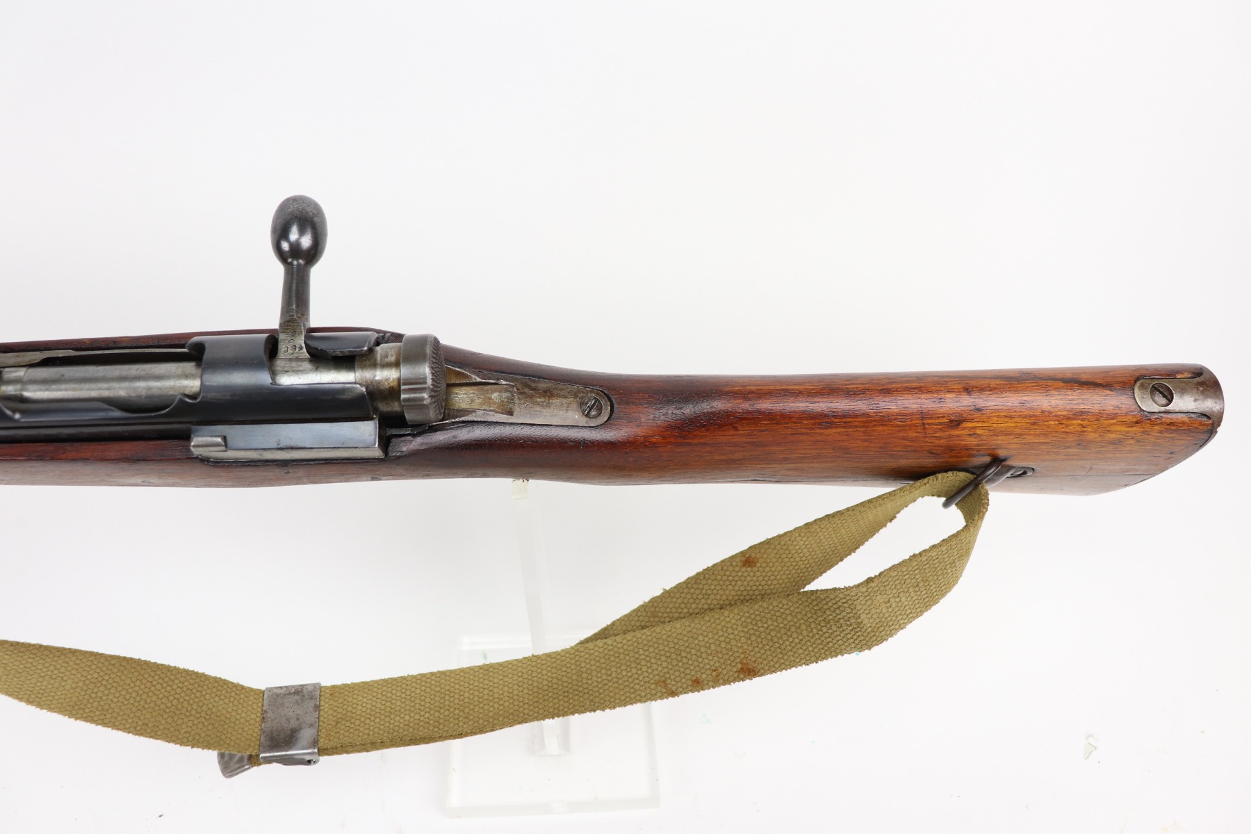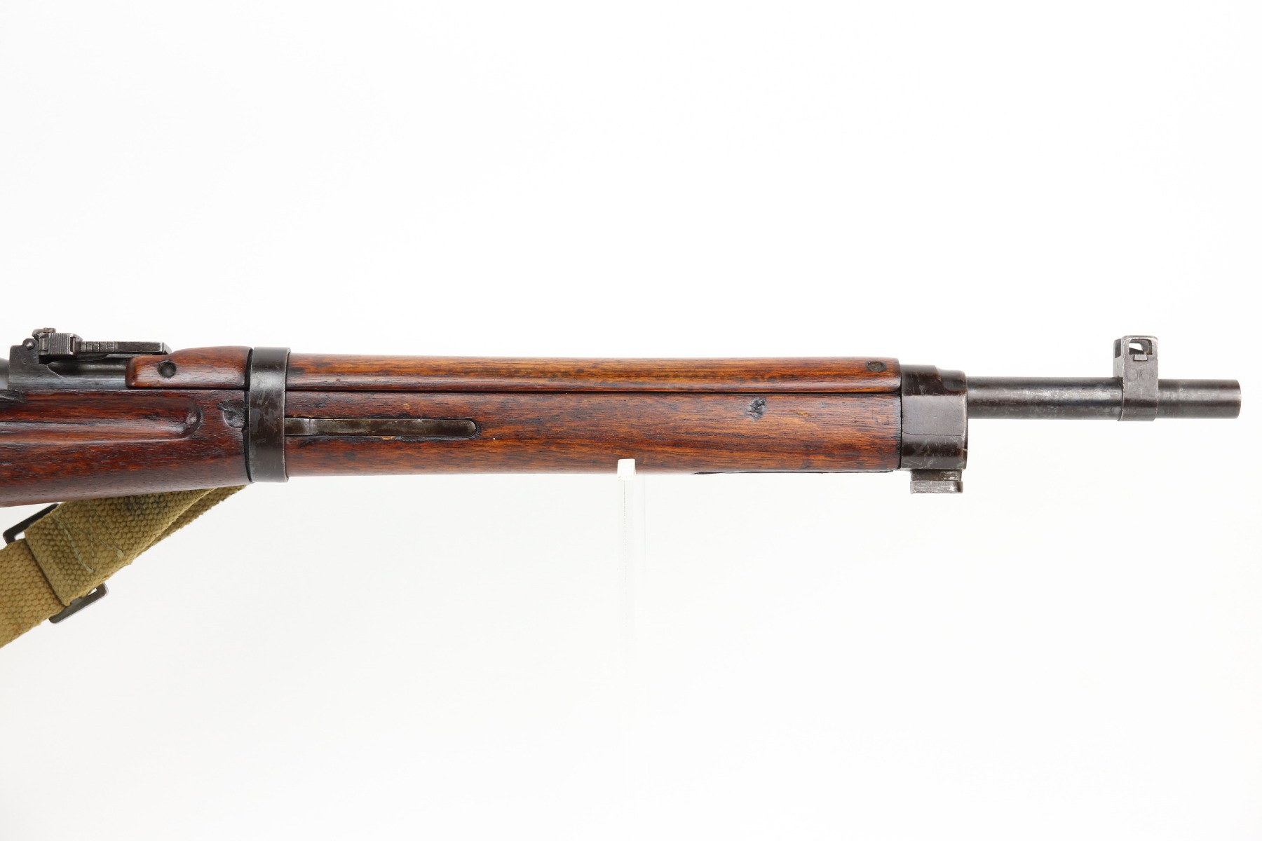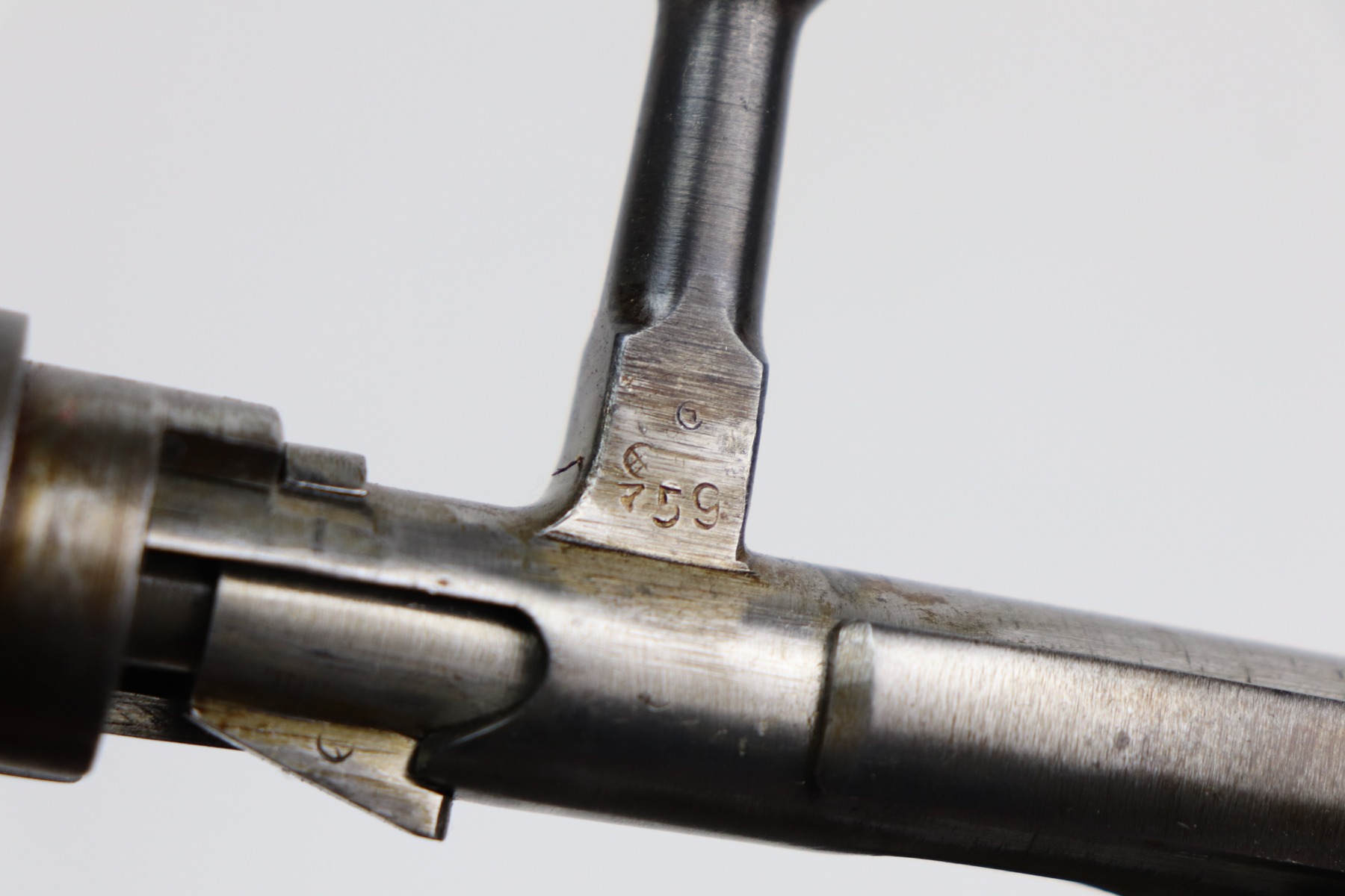4/12/21 – This is an excellent example of an Arisaka Type 38 Carbine issued to the Japanese military during WW2. The mum stamp on the receiver is almost entirely in tact, but there is a faint “X” through it. The gun is all matching except for the firing pin and cocking knob. Comes with an original sling. The gun has retained most of its bluing, but there is splotchy discoloration throughout, most noticeable on the barrel and floor plate. The stock is excellent but has been sanded. Excellent bore – shiny with strong rifling.