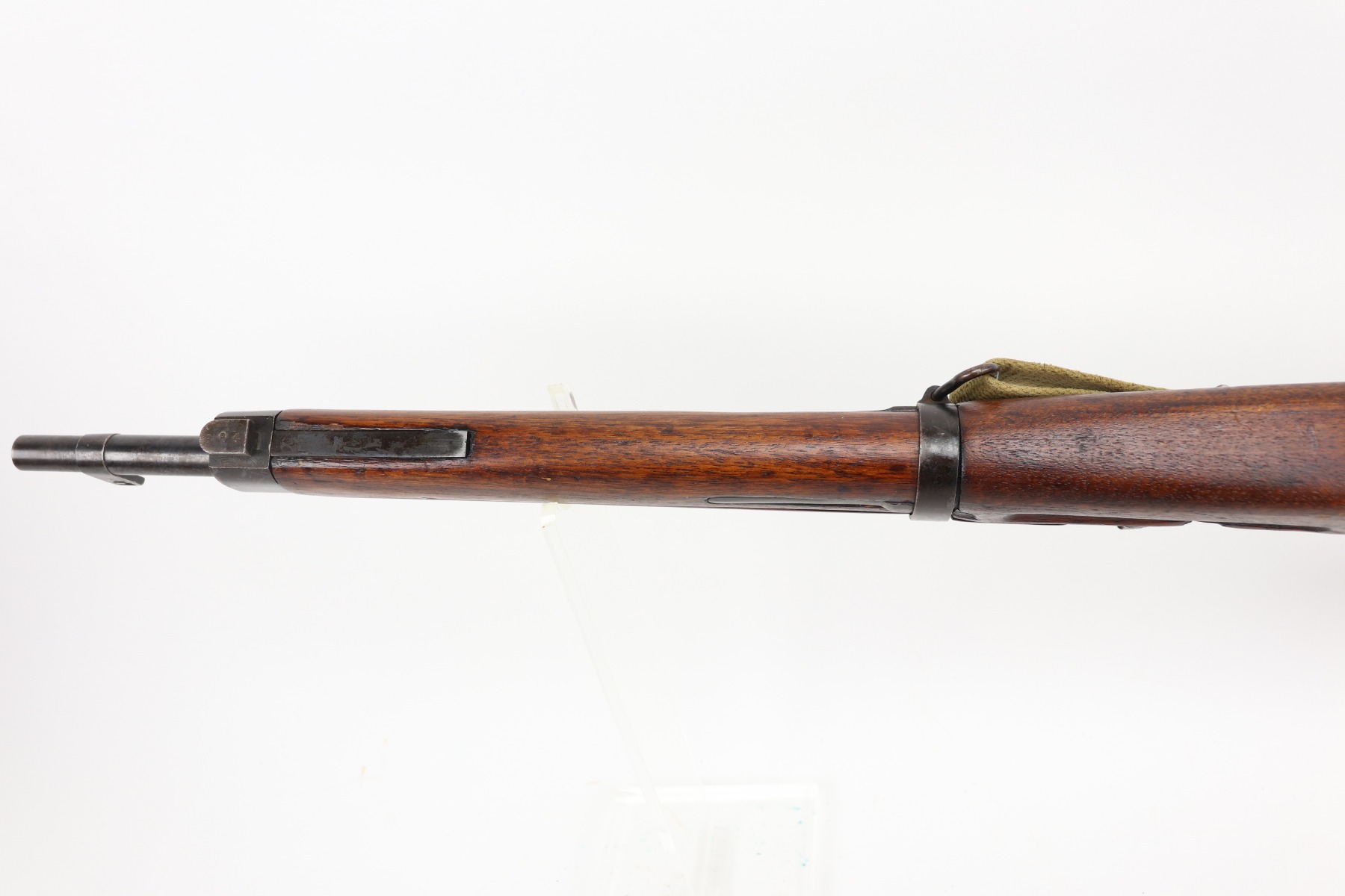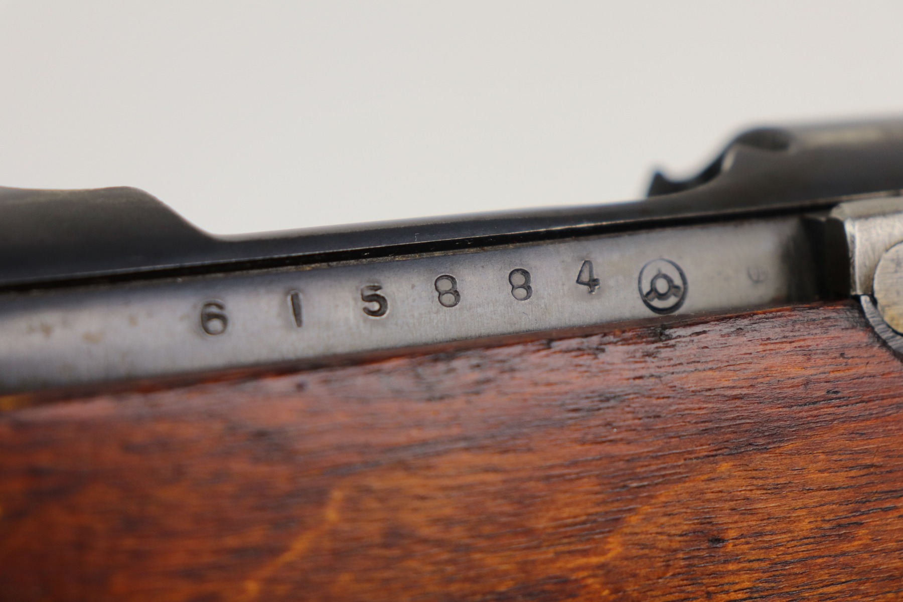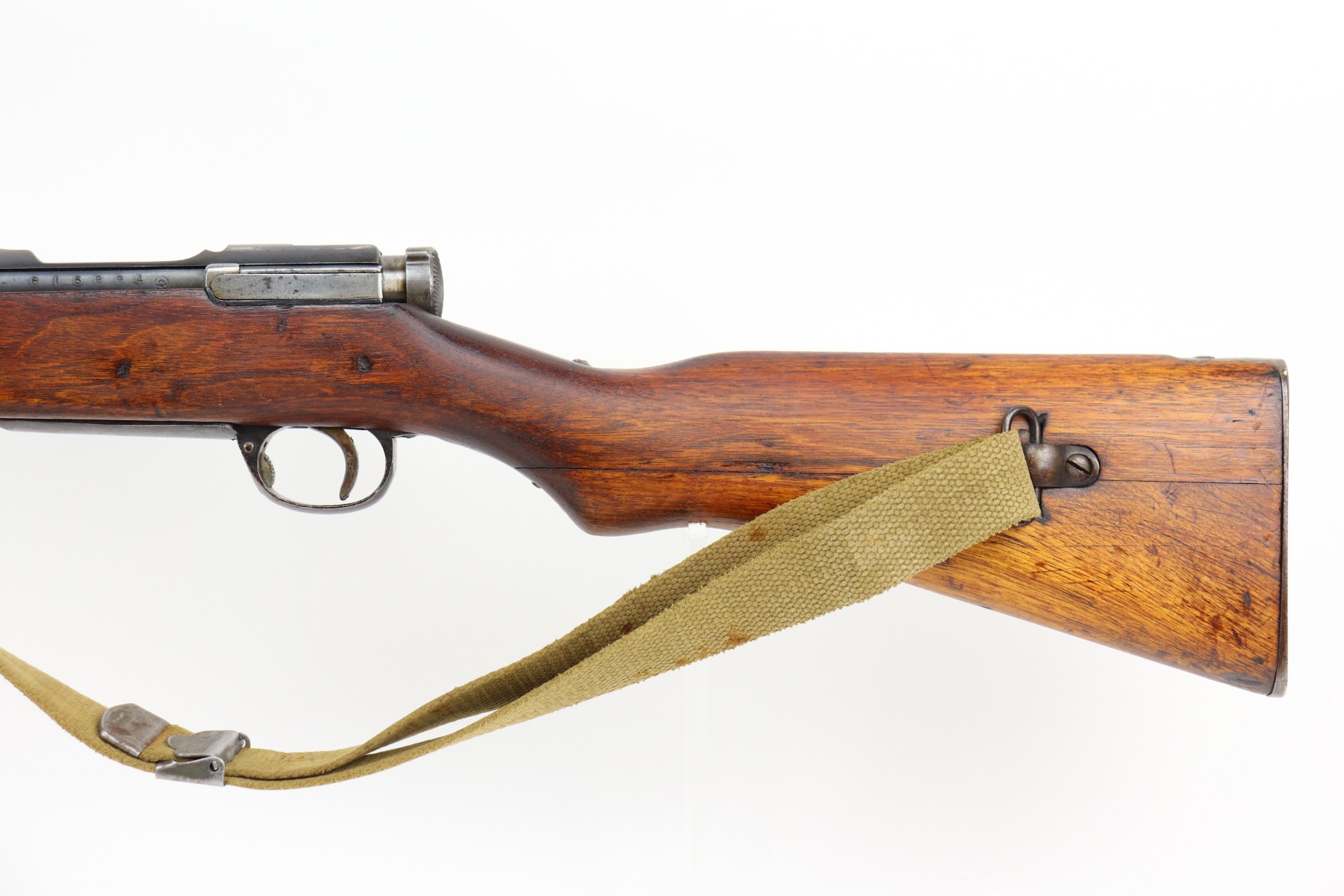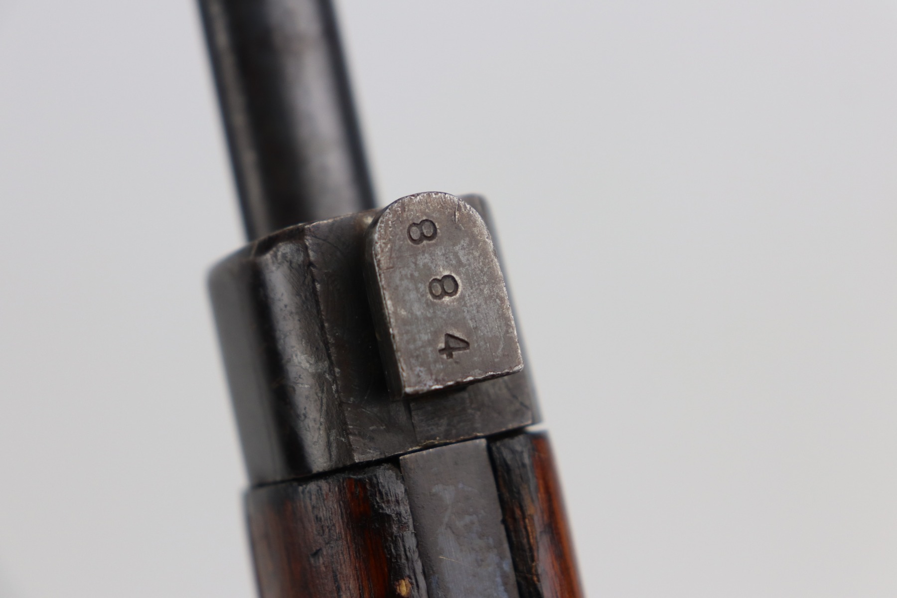 4/12/21 – This is an excellent example of an Arisaka Type 38 Carbine issued to the Japanese military during WW2. The mum stamp on the receiver is almost entirely in tact, but there is a faint “X” through it. The gun is all matching except for the firing pin and cocking knob. Comes with an original sling. The gun has retained most of its bluing, but there is splotchy discoloration throughout, most noticeable on the barrel and floor plate. The stock is excellent but has been sanded. Excellent bore – shiny with strong rifling.