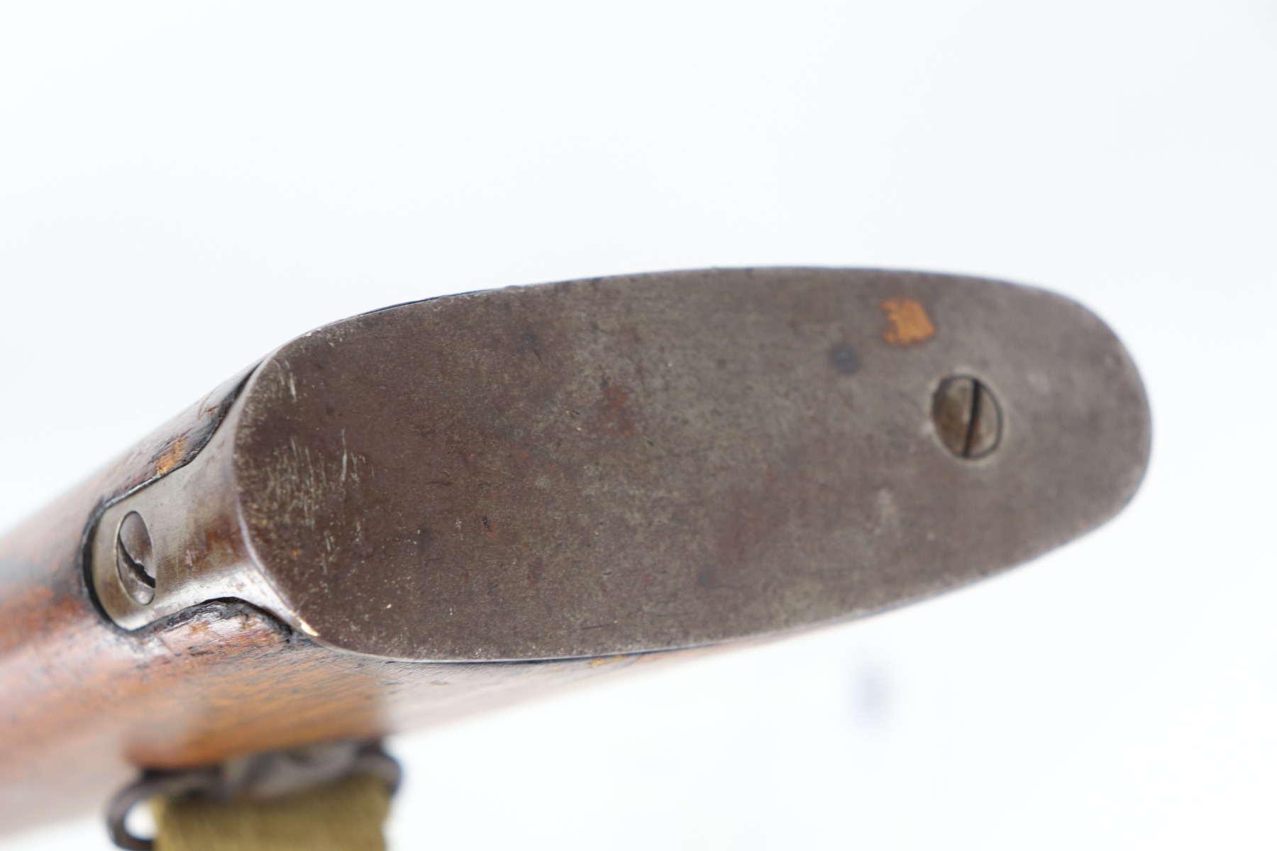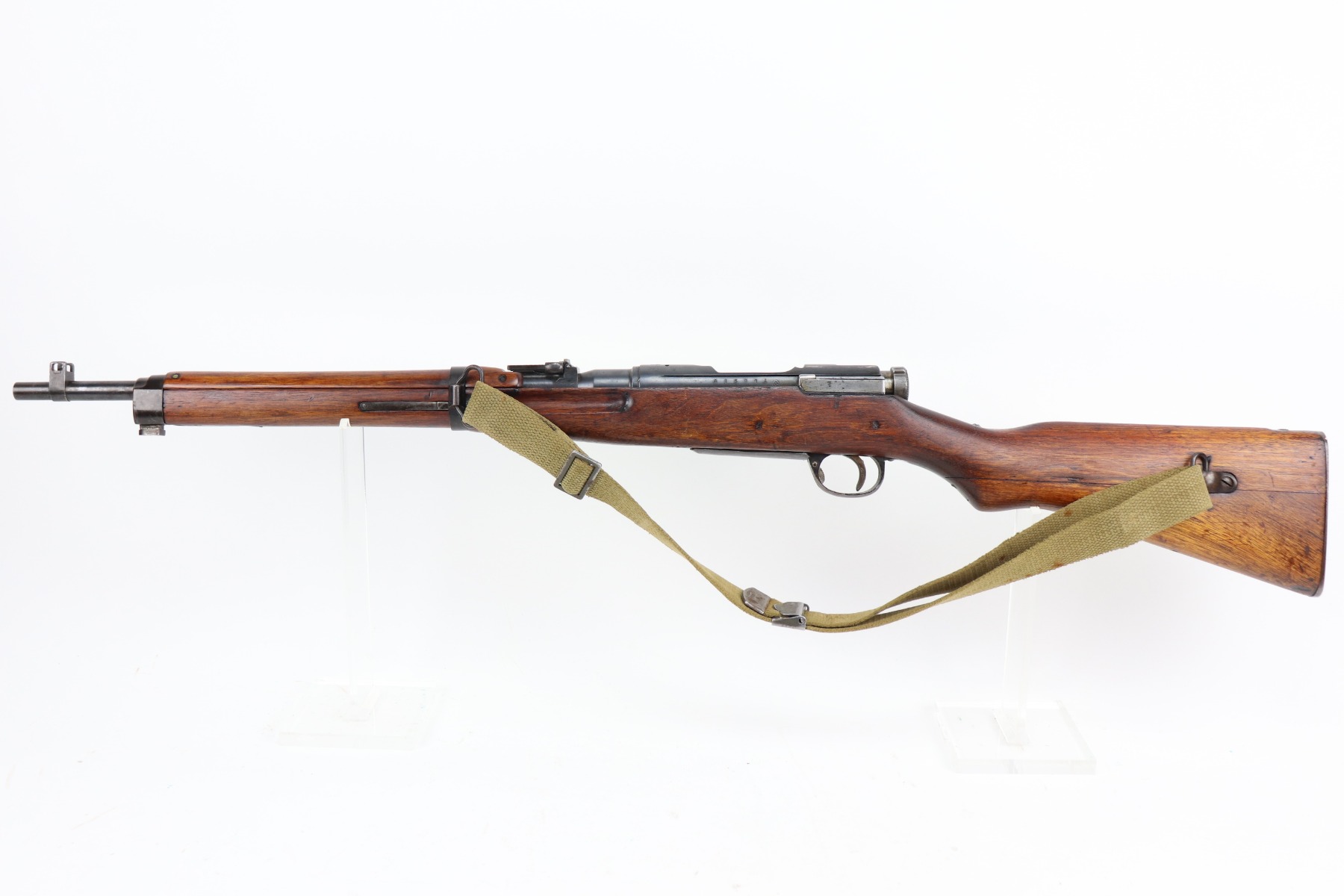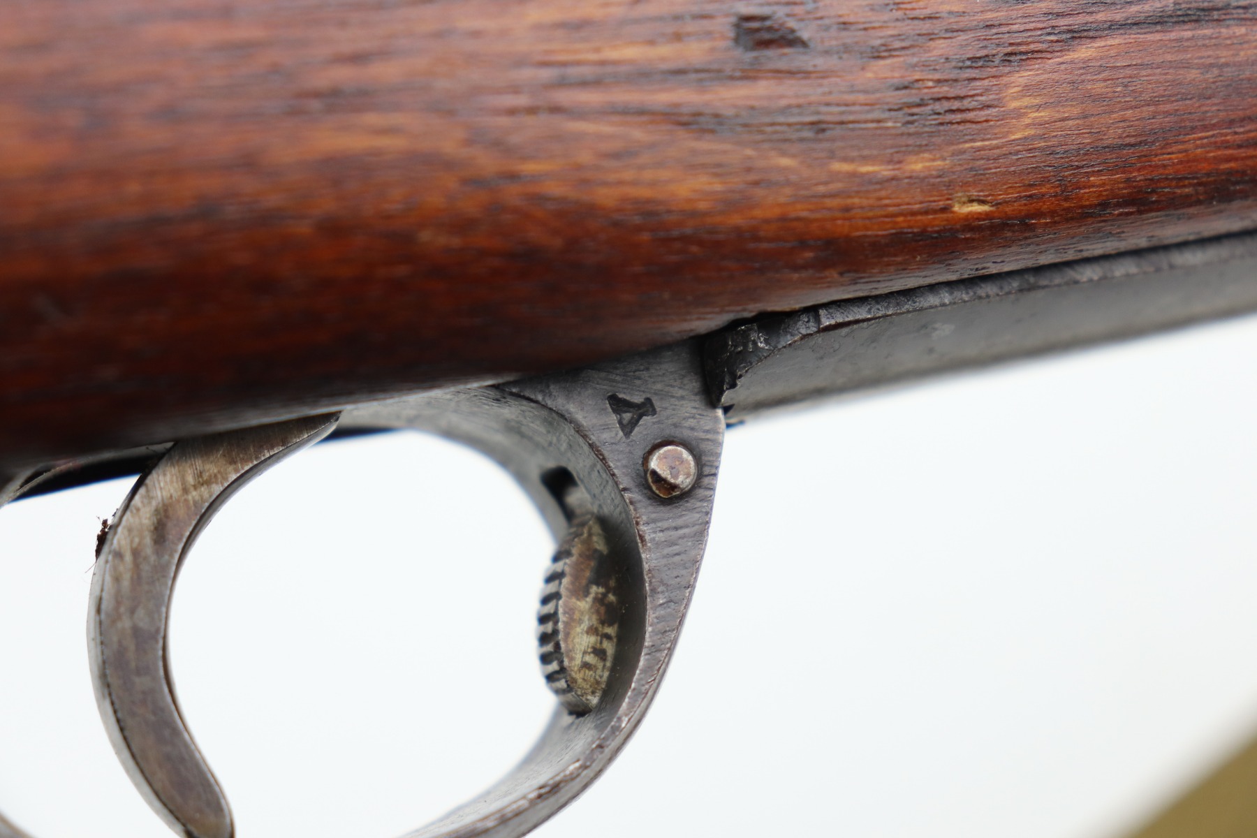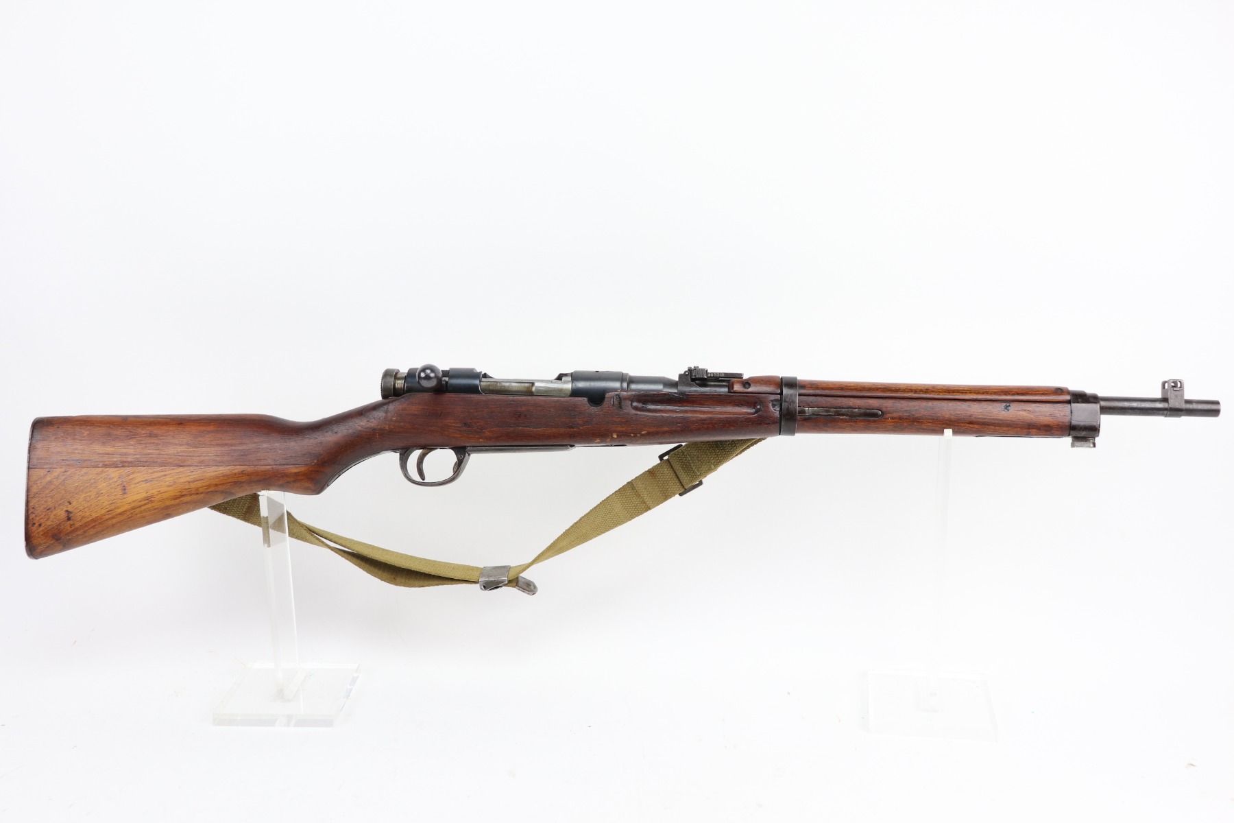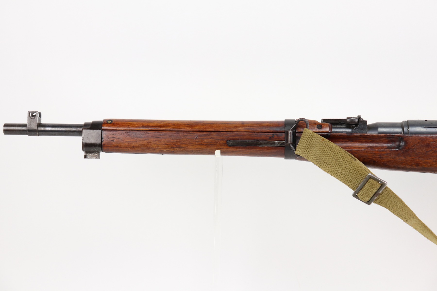4/12/21 – This is an excellent example of an Arisaka Type 38 Carbine issued to the Japanese military during WW2. The mum stamp on the receiver is almost entirely in tact, but there is a faint “X” through it. The gun is all matching except for the firing pin and cocking knob. Comes with an original sling. The gun has retained most of its bluing, but there is splotchy discoloration throughout, most noticeable on the barrel and floor plate. The stock is excellent but has been sanded. Excellent bore – shiny with strong rifling.