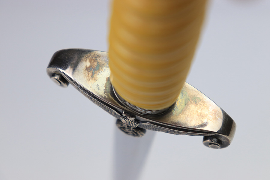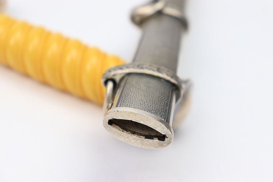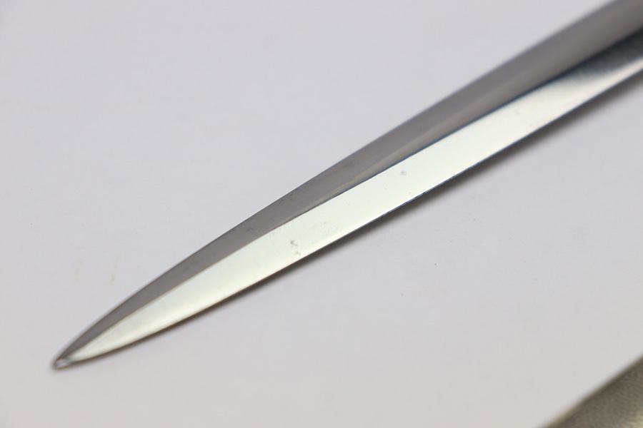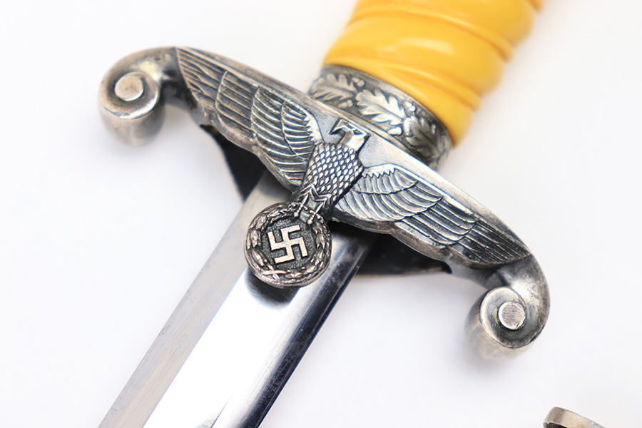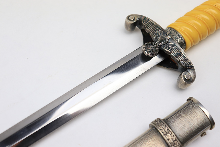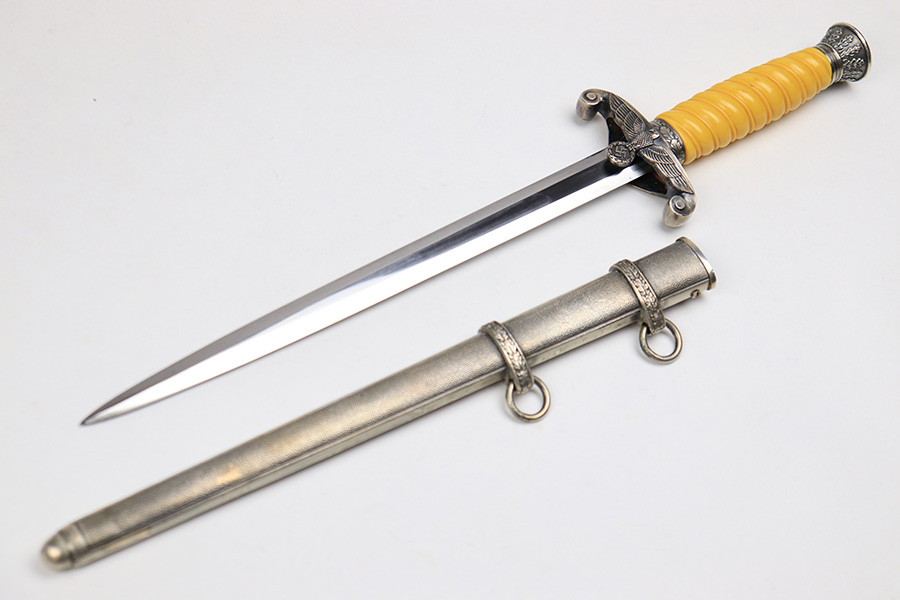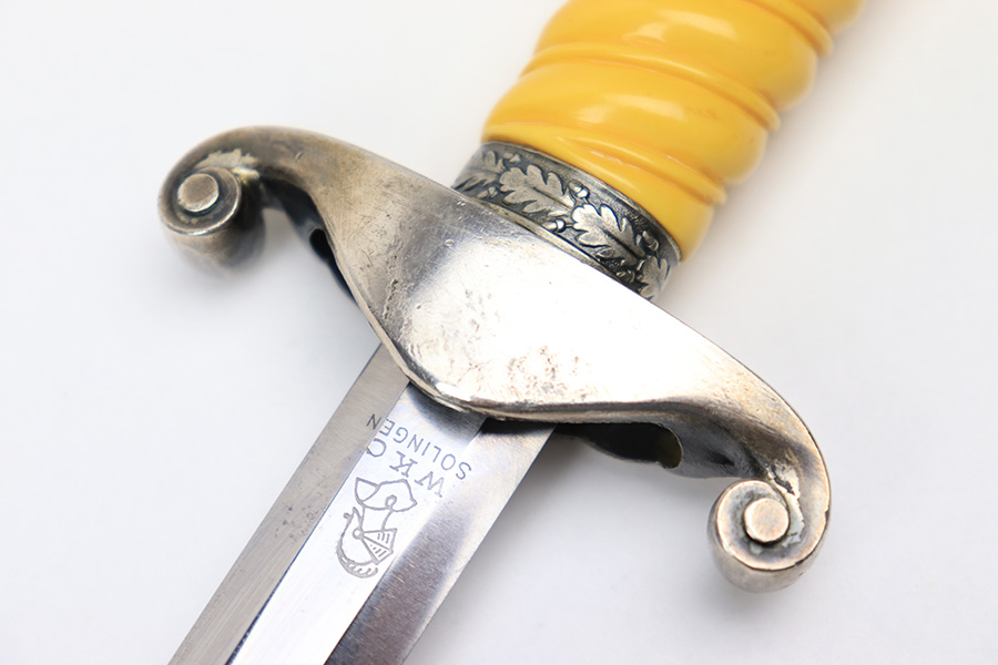 3/27/23 – This is an original WW2 German Army Dagger by WKC. The dagger is in excellent overall condition with a minty blade that displays excellent cross-graining throughout. The reverse is maker stamped by WKC. The original leather stopper is still in tact. The hand guard shows typical patina, as does the pommel / metal fittings. The yellow bakelite handle has no cracks or chips. Comes with an original scabbard also in excellent condition with no dents. Also comes with a COA from Legacy Collectibles.