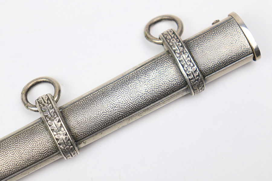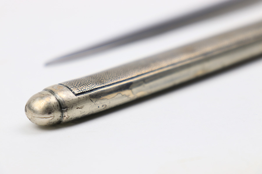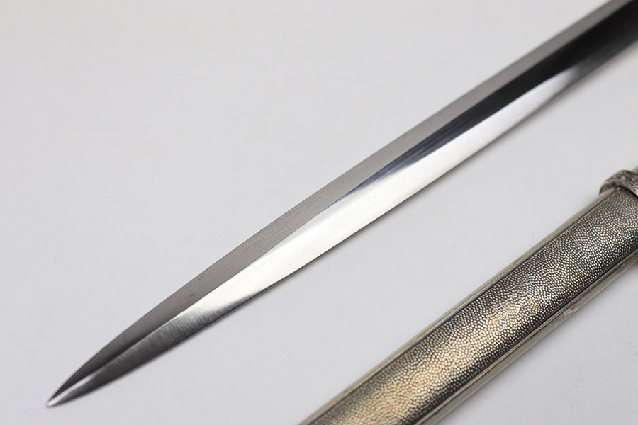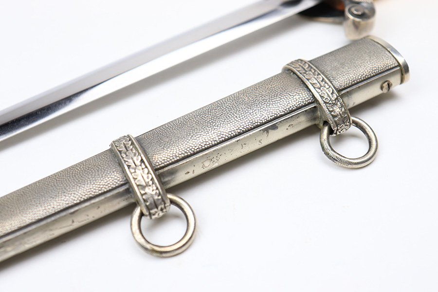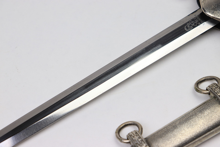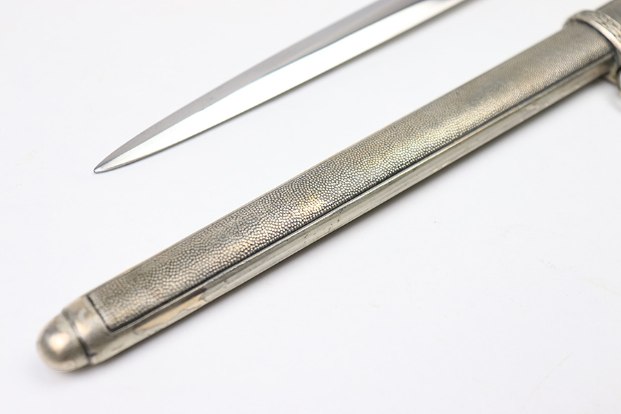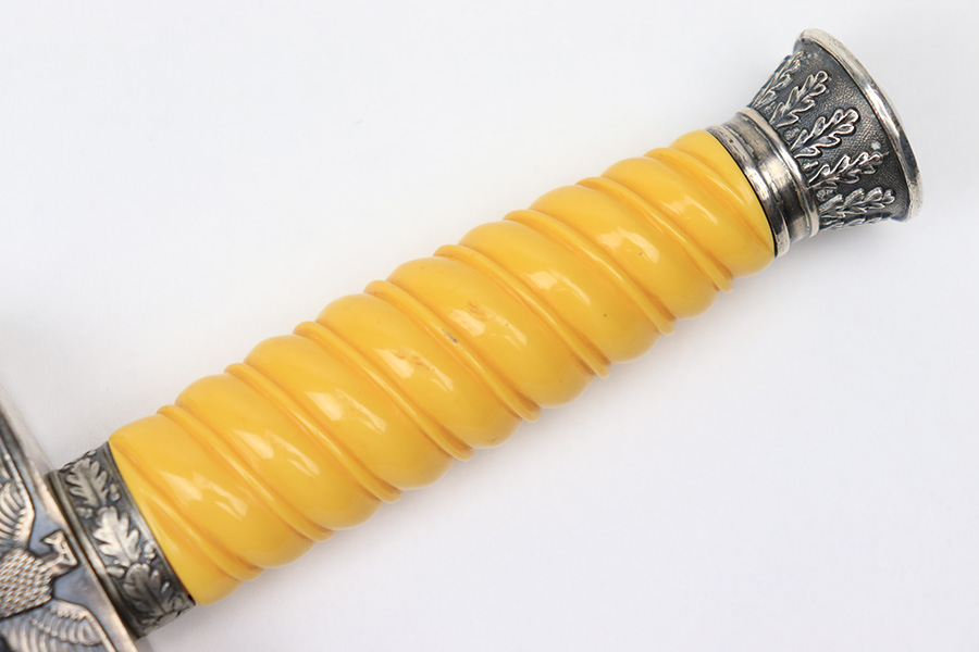 3/27/23 – This is an original WW2 German Army Dagger by WKC. The dagger is in excellent overall condition with a minty blade that displays excellent cross-graining throughout. The reverse is maker stamped by WKC. The original leather stopper is still in tact. The hand guard shows typical patina, as does the pommel / metal fittings. The yellow bakelite handle has no cracks or chips. Comes with an original scabbard also in excellent condition with no dents. Also comes with a COA from Legacy Collectibles.