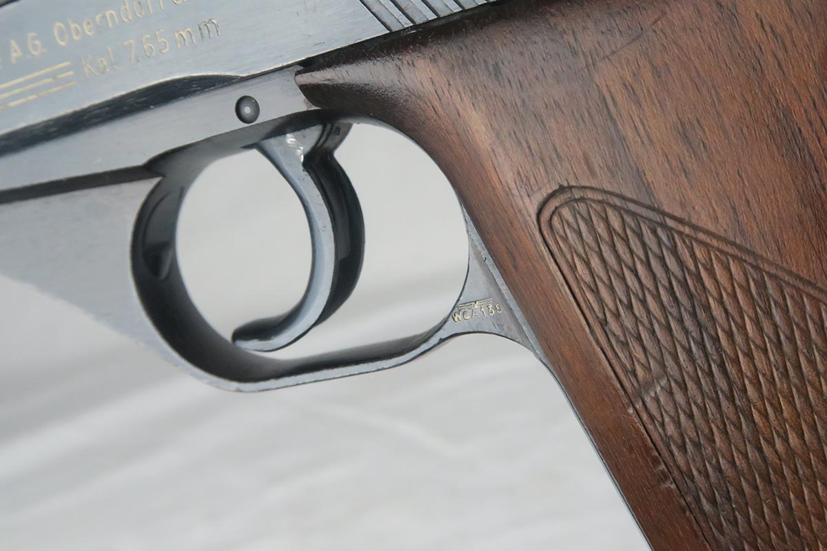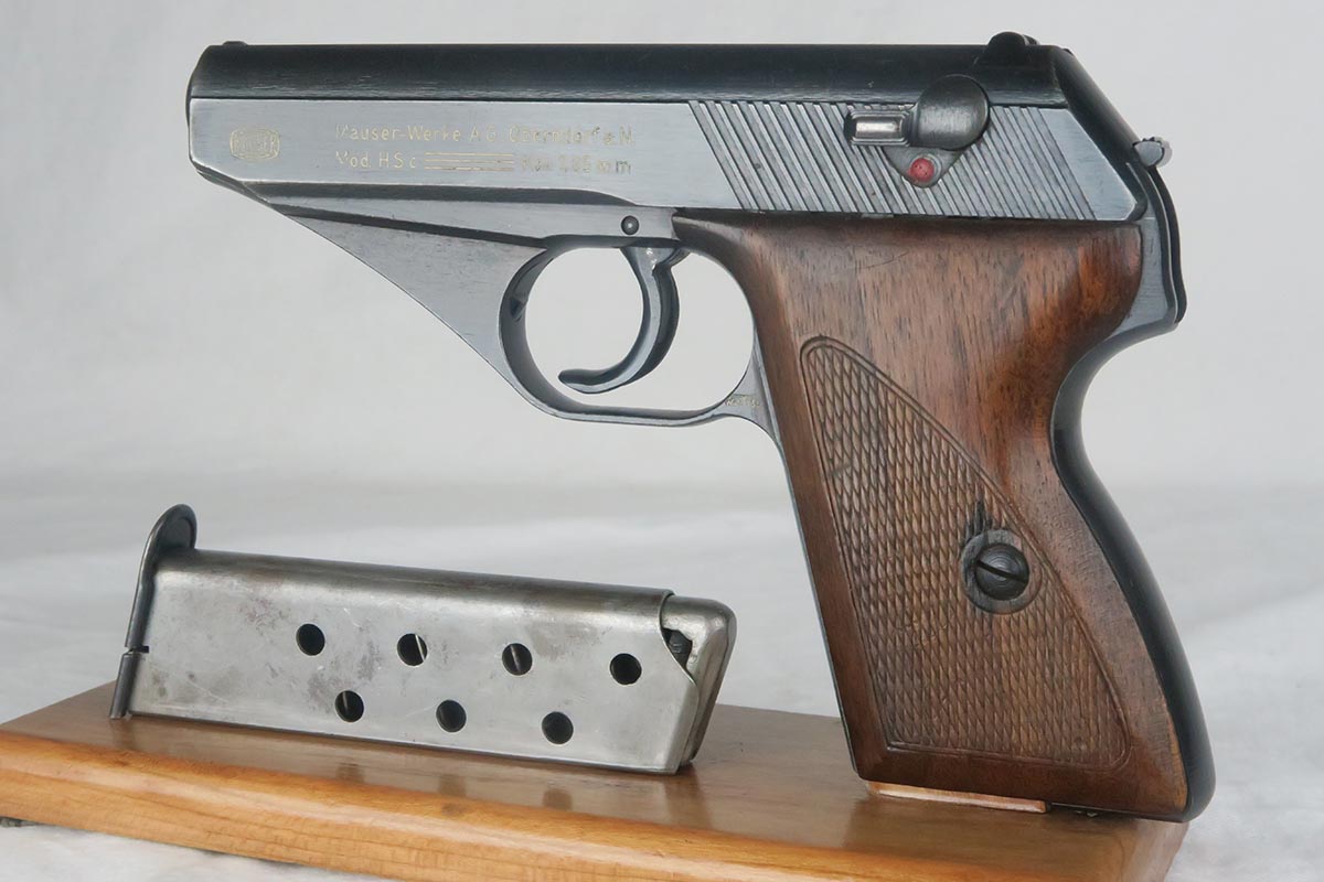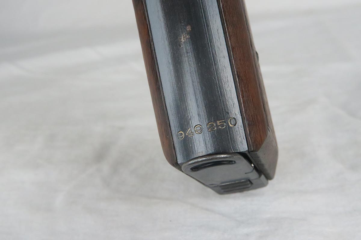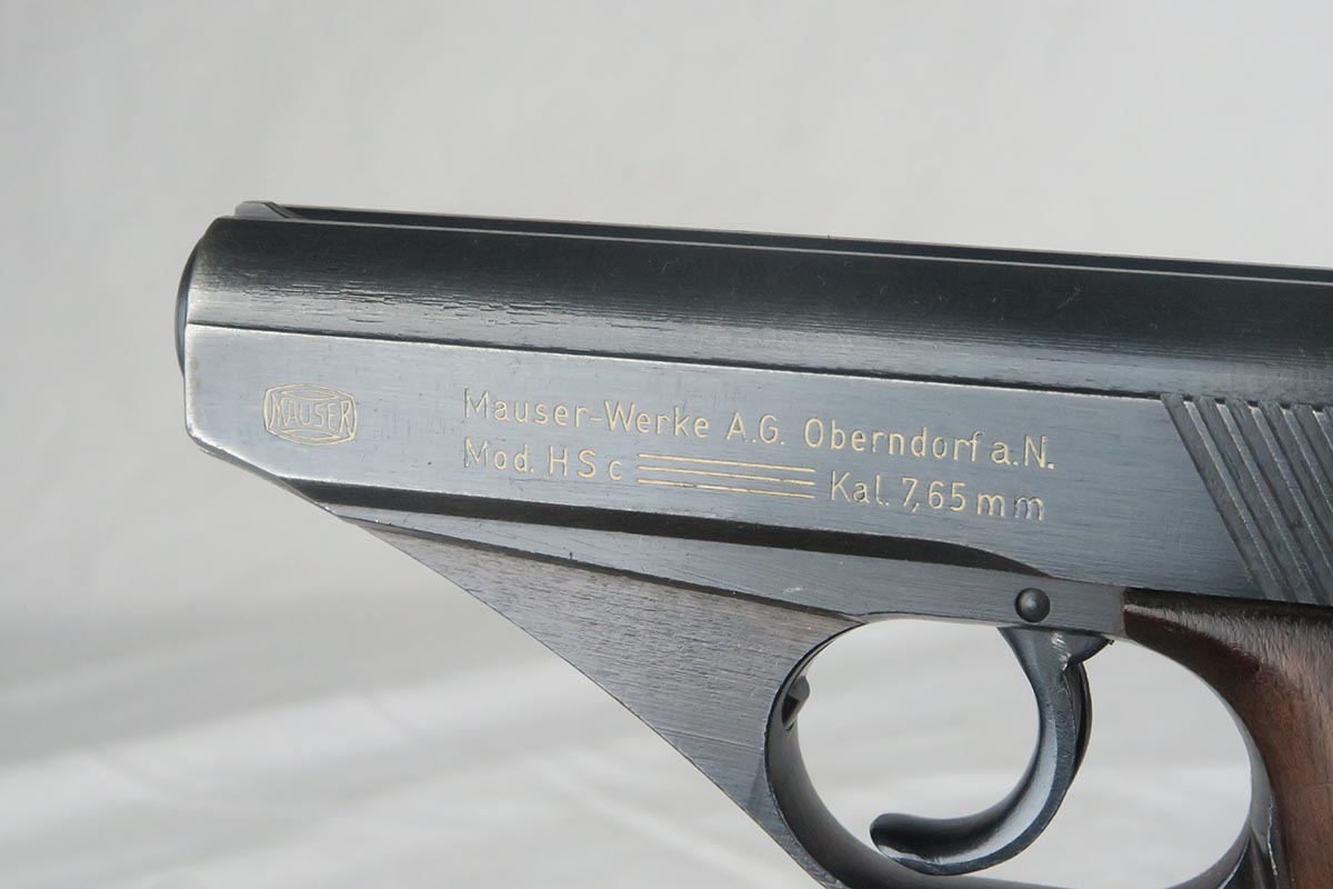 11/20/17 – This is an excellent late-war Army Mauser HSc in all original condition. The military blue rates at about 98% with a little edge wear and a spot of finish loss on the front strap. This pistol is one of the last HSc’s ever made for use in World War II, with the serial range for 1945 ending at 951xxx. This one has very nice grips and a half-moon magazine. Excellent bore.