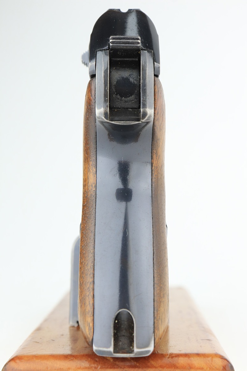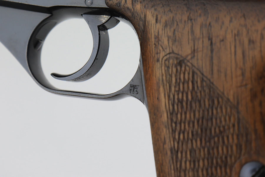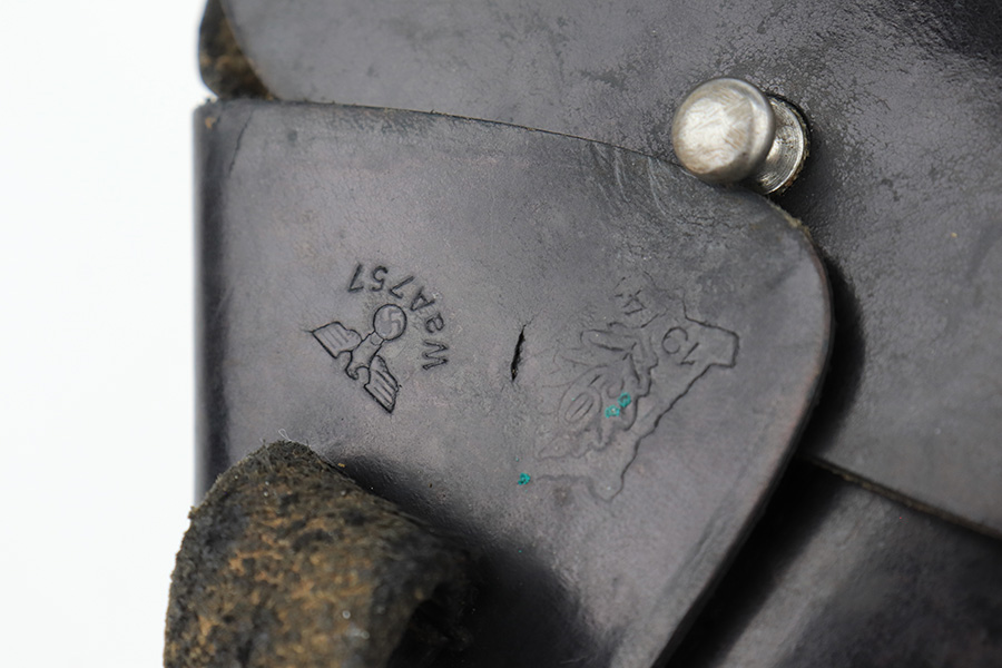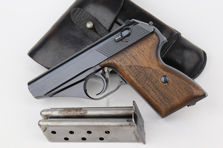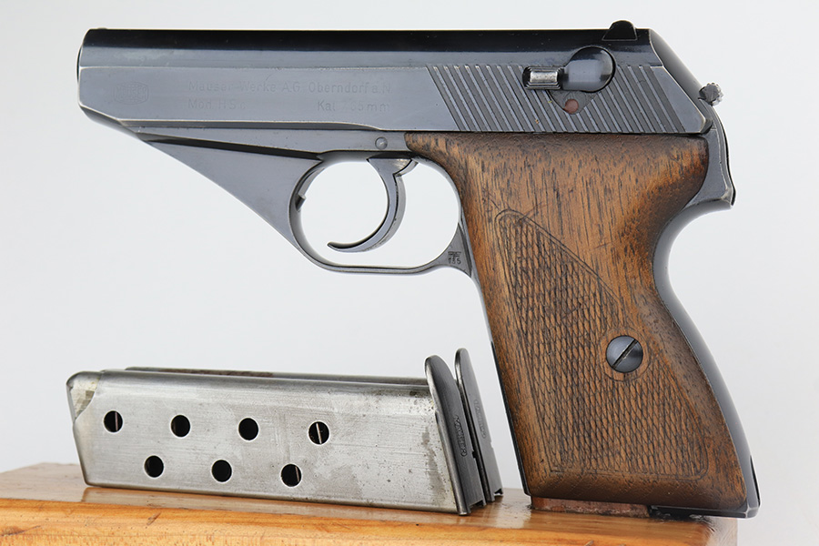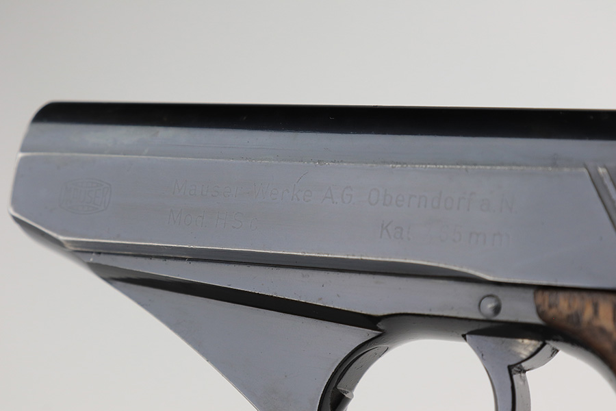 2/17/23 – This is an excellent and complete Mauser HSc rig with holster and spare magazine. Made in 1942 for the German Army with E/135 acceptance mark. It’s all original with 96-97% of the blue remaining. Minor muzzle wear on each side of the slide, but most of the bluing loss is on the tang and bottom of the back strap. Minty bore. The grips show light handling wear but no cracks or chips. Both magazines are Mauser banner marked. The rig is completed by a rare, original holster with 1941 date and crisp waffenamt. The leather shows some softening and age but no major defects.