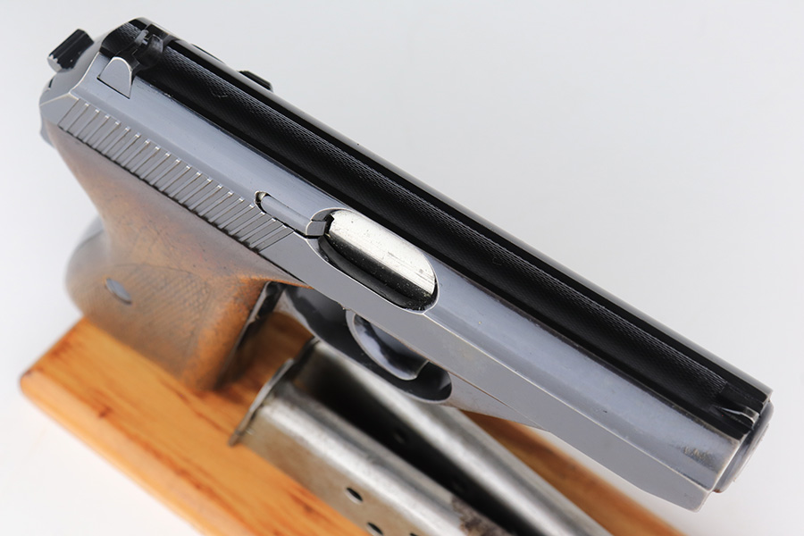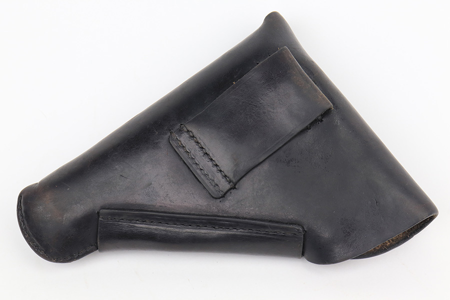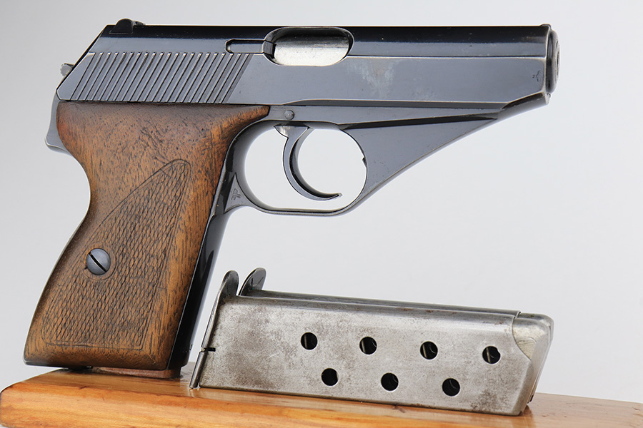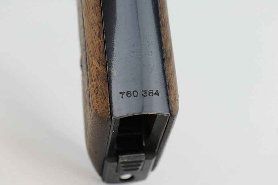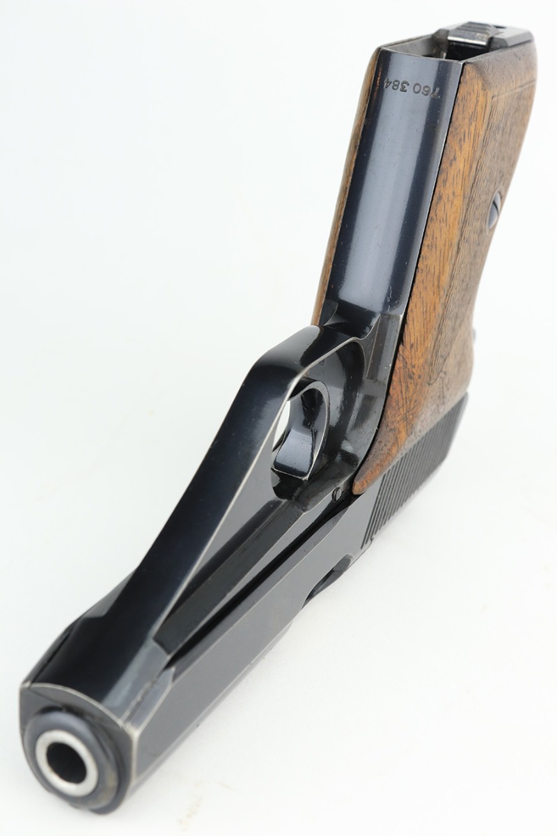 2/17/23 – This is an excellent and complete Mauser HSc rig with holster and spare magazine. Made in 1942 for the German Army with E/135 acceptance mark. It’s all original with 96-97% of the blue remaining. Minor muzzle wear on each side of the slide, but most of the bluing loss is on the tang and bottom of the back strap. Minty bore. The grips show light handling wear but no cracks or chips. Both magazines are Mauser banner marked. The rig is completed by a rare, original holster with 1941 date and crisp waffenamt. The leather shows some softening and age but no major defects.