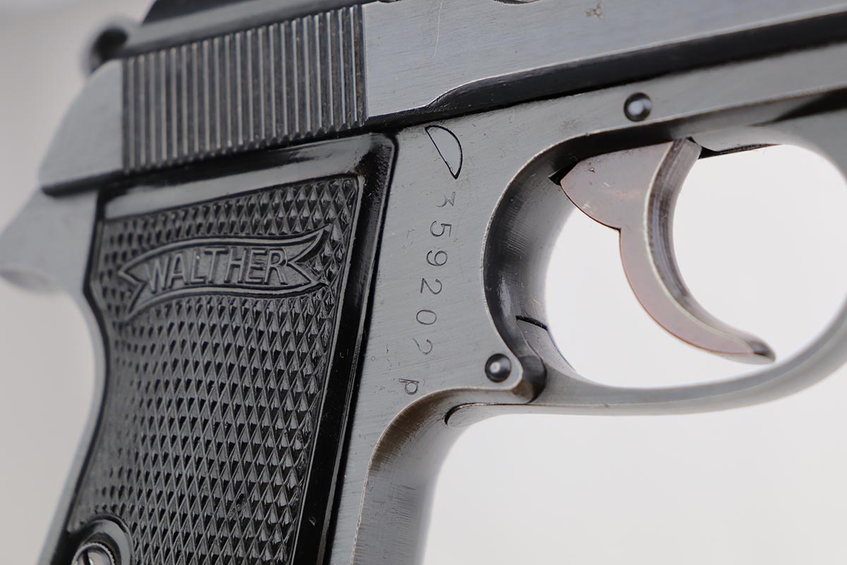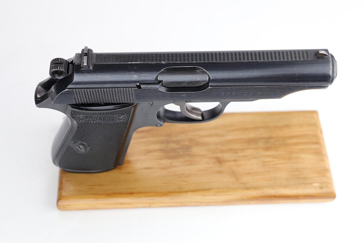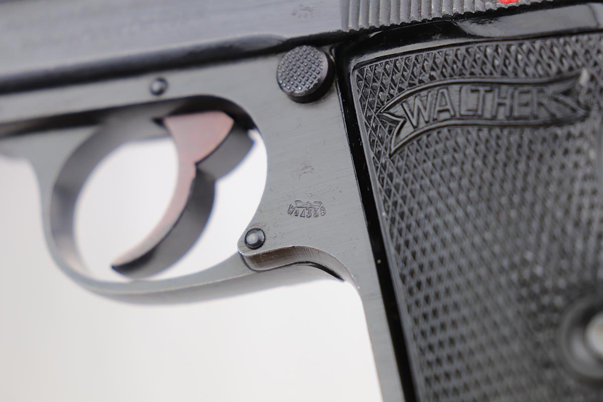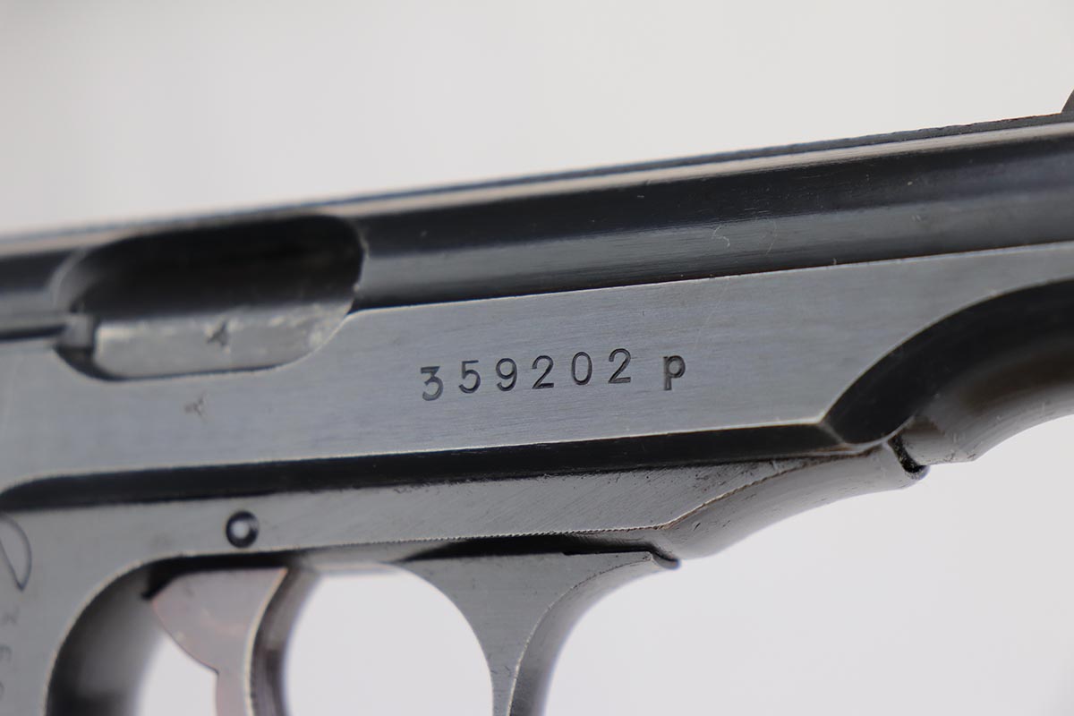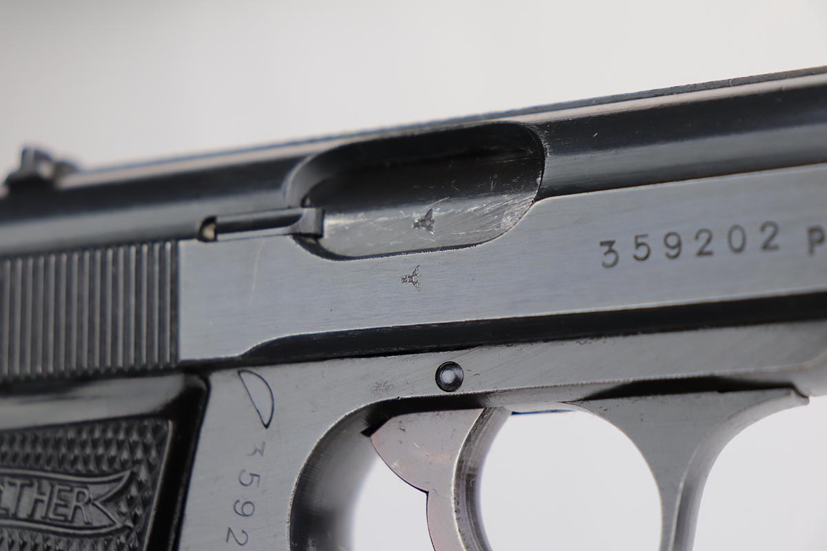 11/5/19 – This is an excellent Walther PP that was issued to the German Army in 1944. The military blue rates at 97-98% with minor high edge wear on slide, and a hint of thinning on the straps. Minty bore. Excellent wartime magazine and grips.
