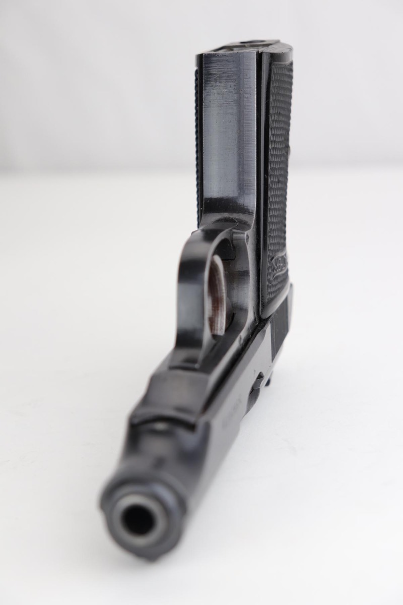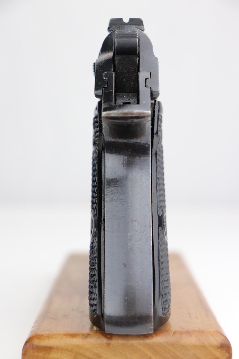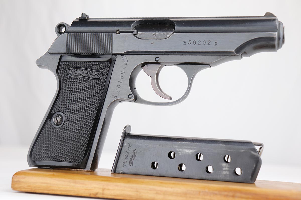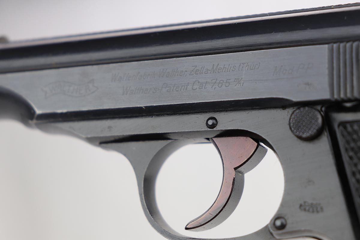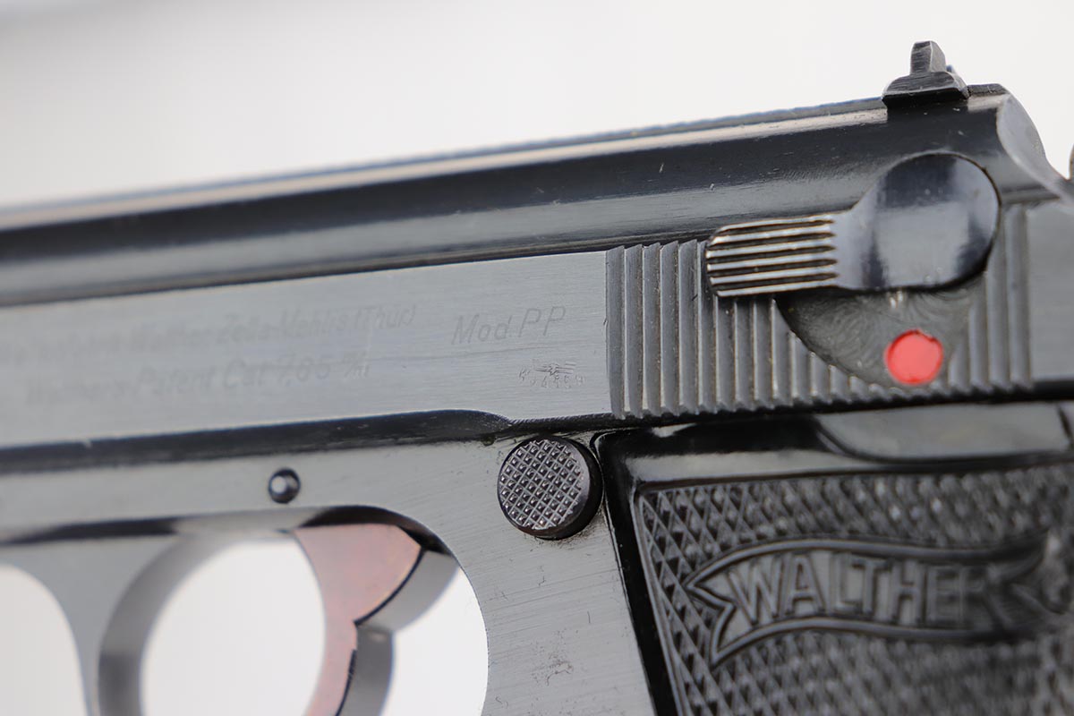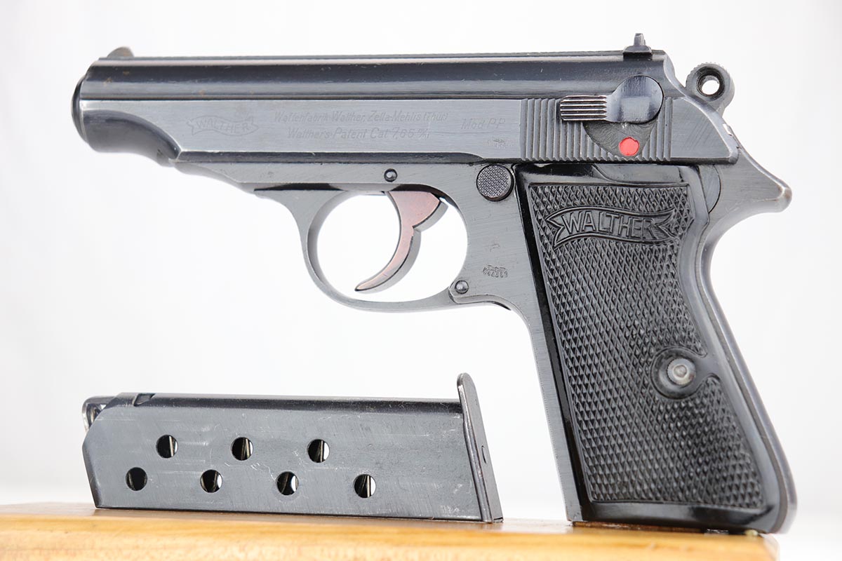 11/5/19 – This is an excellent Walther PP that was issued to the German Army in 1944. The military blue rates at 97-98% with minor high edge wear on slide, and a hint of thinning on the straps. Minty bore. Excellent wartime magazine and grips.
