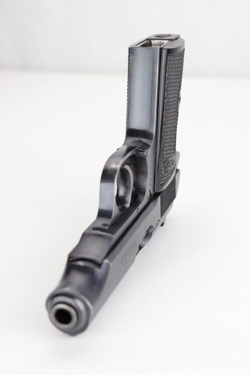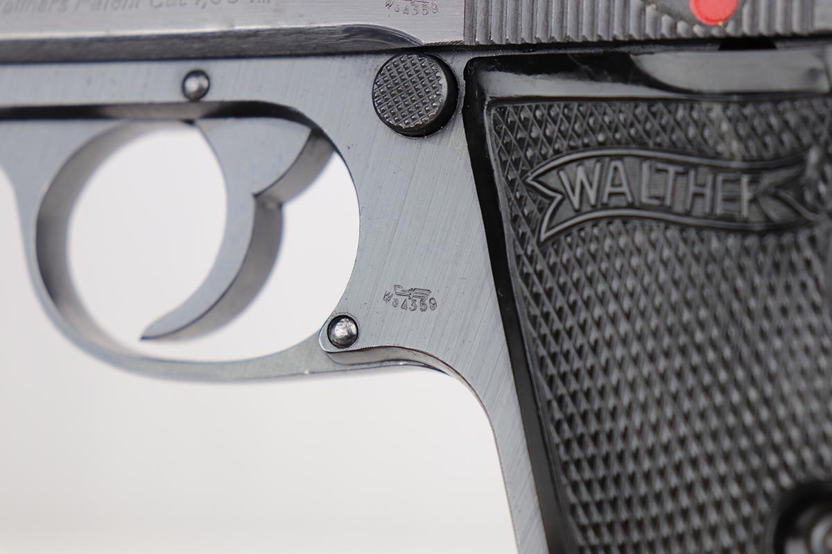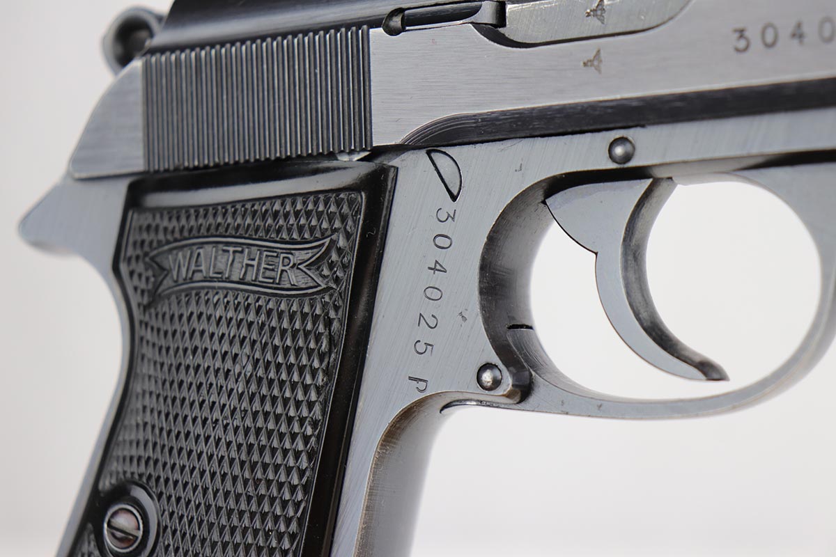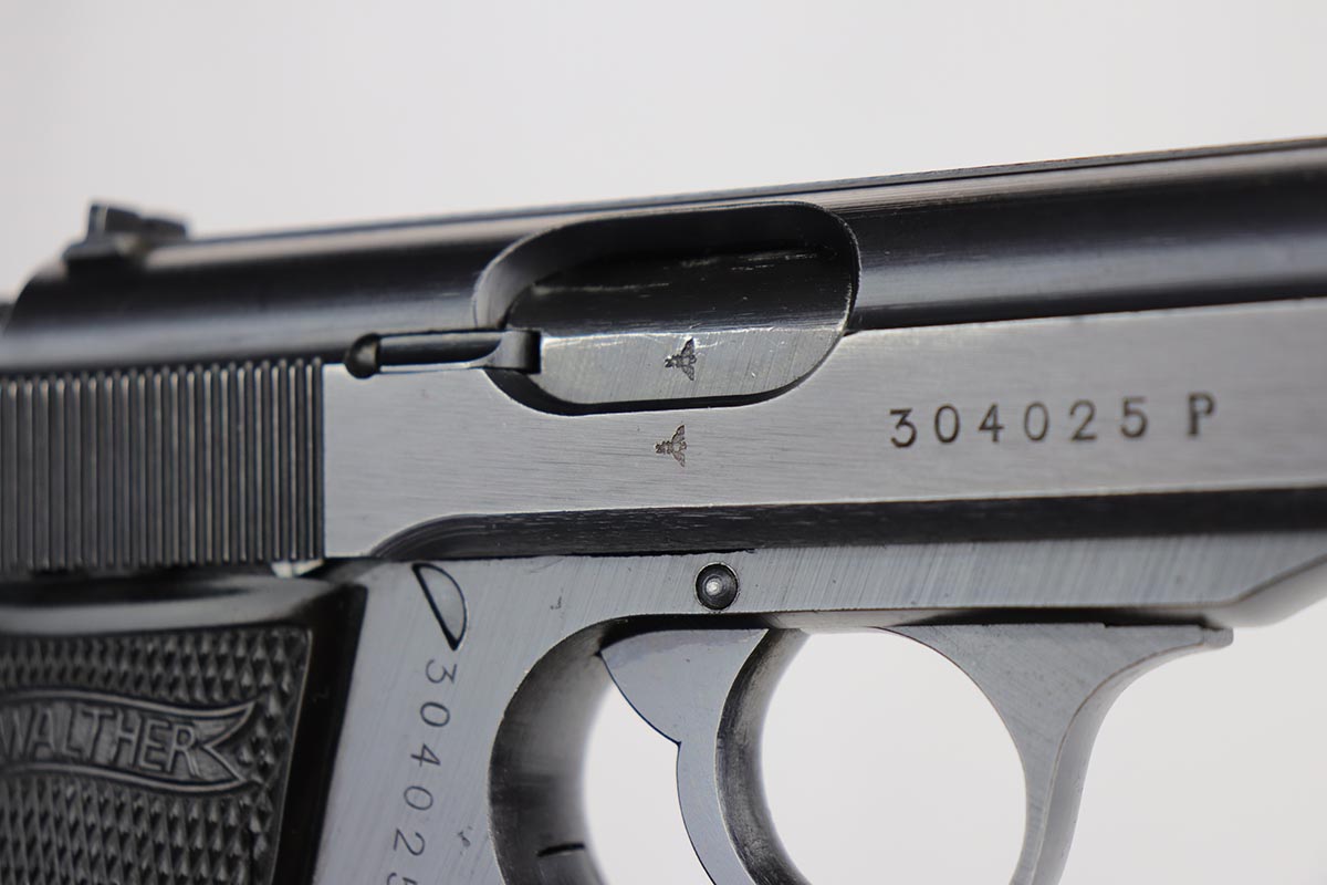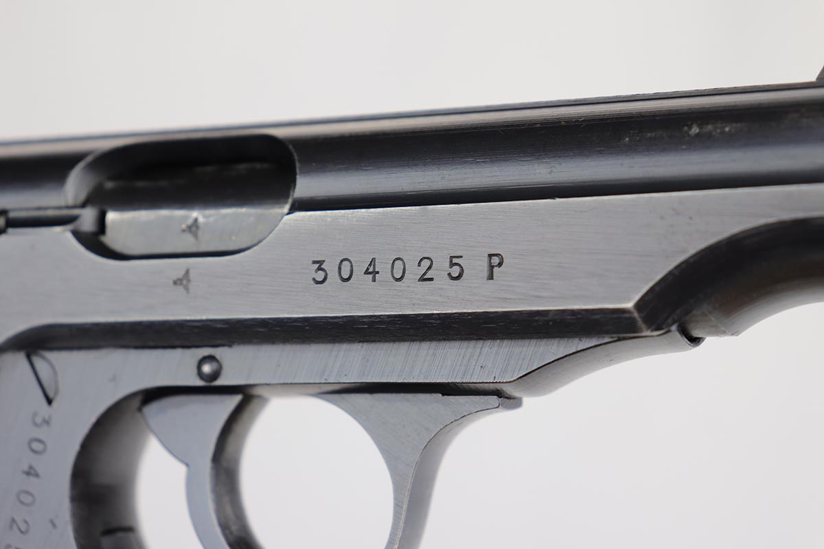 1/6/20 – This is an excellent example of a Walther PP that was produced in 1944 and issued to the German Army. About 95% of the military blue remains, with minor high point wear on the slide, and some thinning on the straps. Excellent grips and magazine. Minty bore.