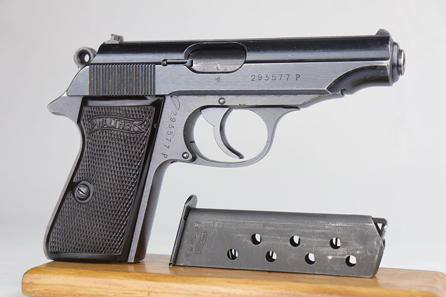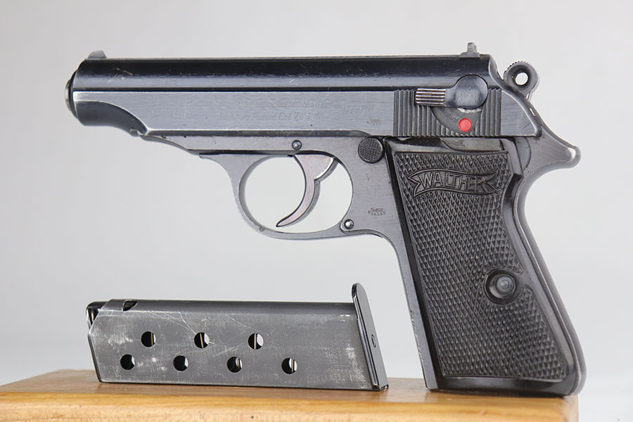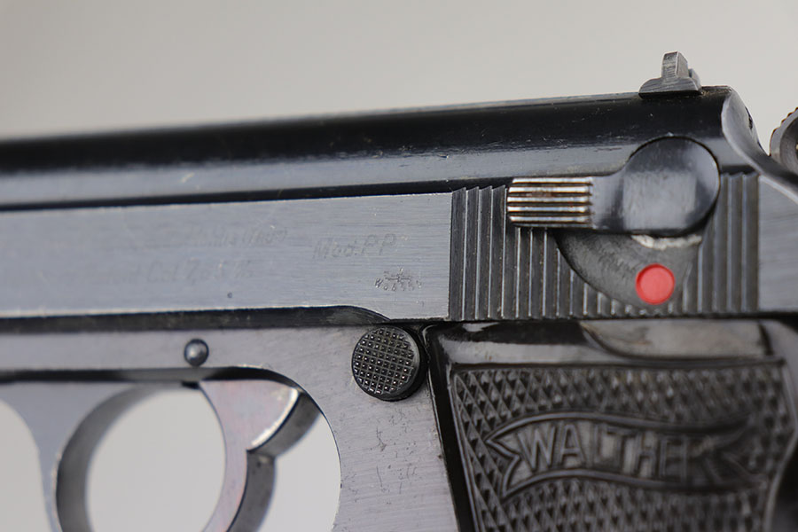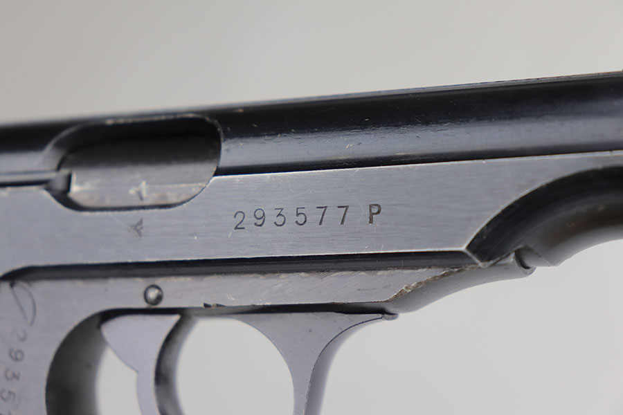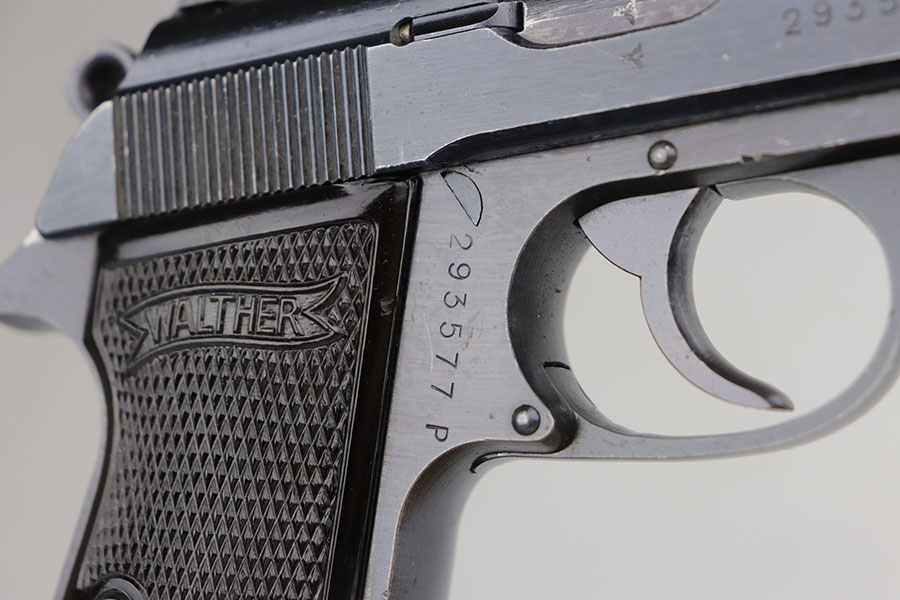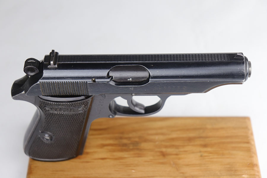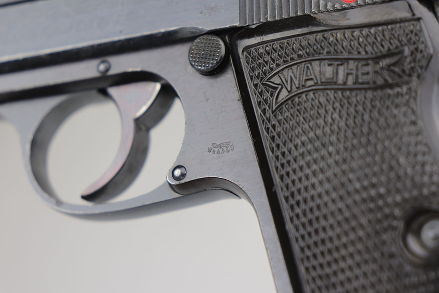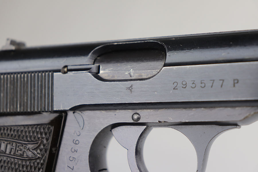 7/24/20 – This is an excellent Walther PP from World War II with Waffen stamps indicating that it was issued to the Geman Army. The original finish is 96-97% with some minor high edge wear on the slide, and a bit of thinning on the straps. It is Eagle/359 proofed on the slide and frame and wartime Eagle N firing proofs. All parts are matching and it has the correct Walther magazine that is banner and 7.65 m/m markings. Military marked guns are hard to find in this condition. The bore is excellent and shiny.