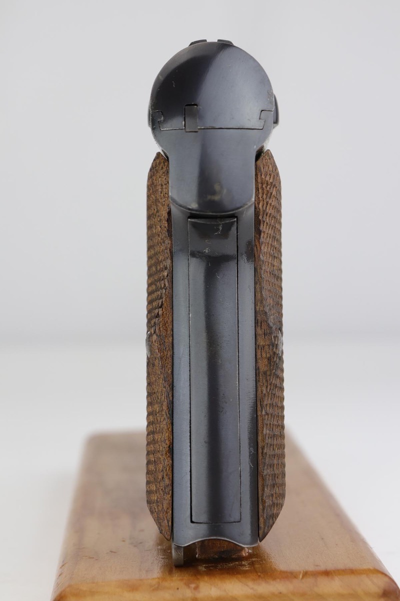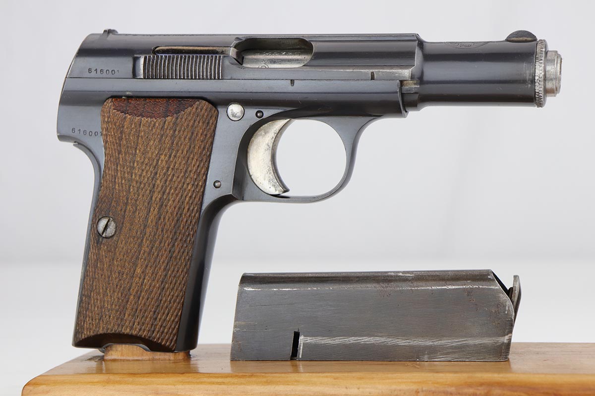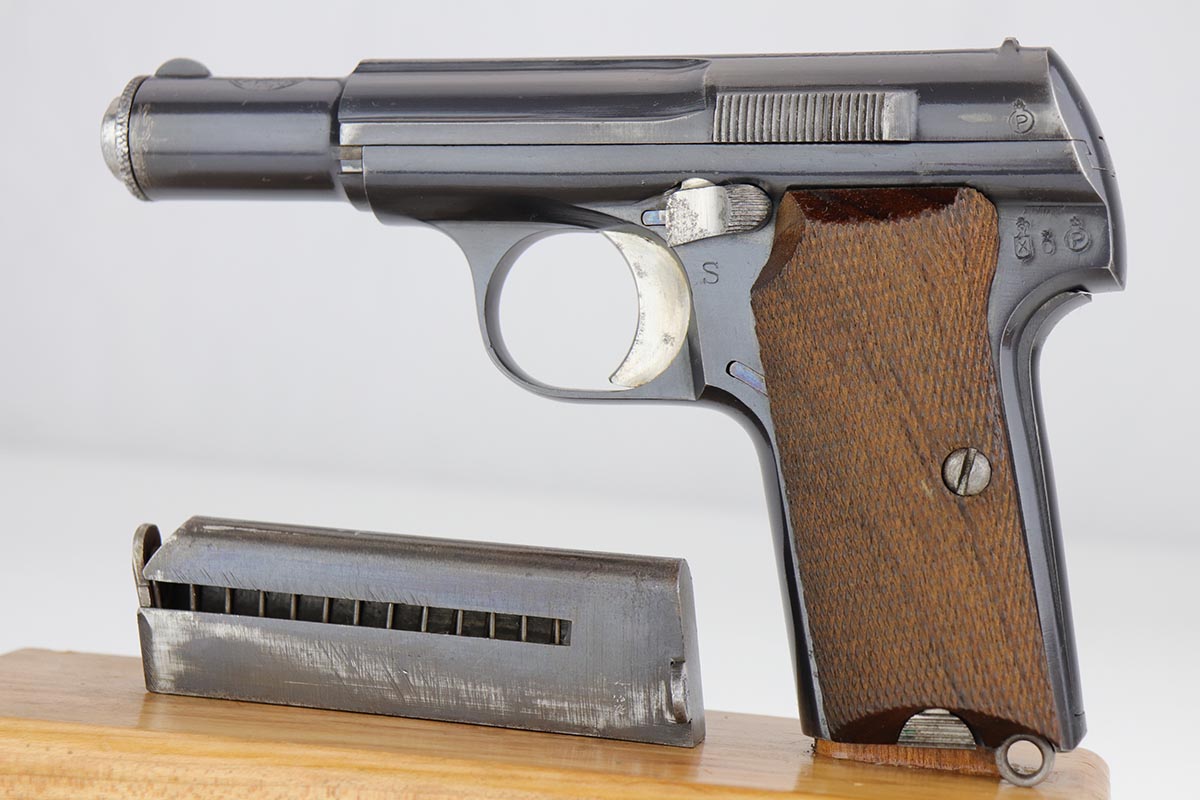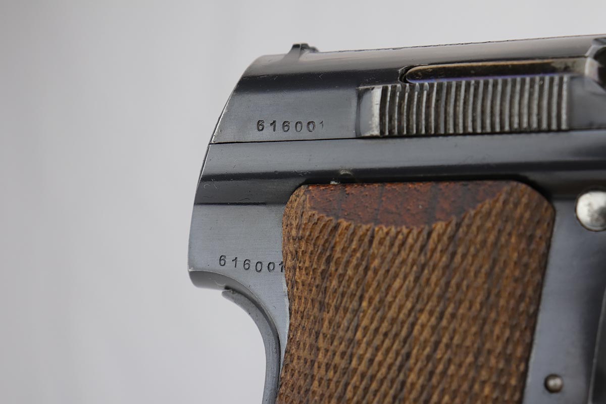 8/19/19 – This is an excellent, original Astra 300 that was part of the second contract order by the Nazi Army. This pistol was part of a batch that was delivered on April 1, 1944. There were only ~22,000 of this variation produced, with no waffenamt on the frame and chambered in 7.65mm. The original finish rates at about 97%, with minor edge wear in a few areas, and a spot of minor finish loss on the trigger guard and back strap. There are also a couple of scratches near the muzzle, likely from an attempt to remove the muzzle cap. Excellent bore and grips.