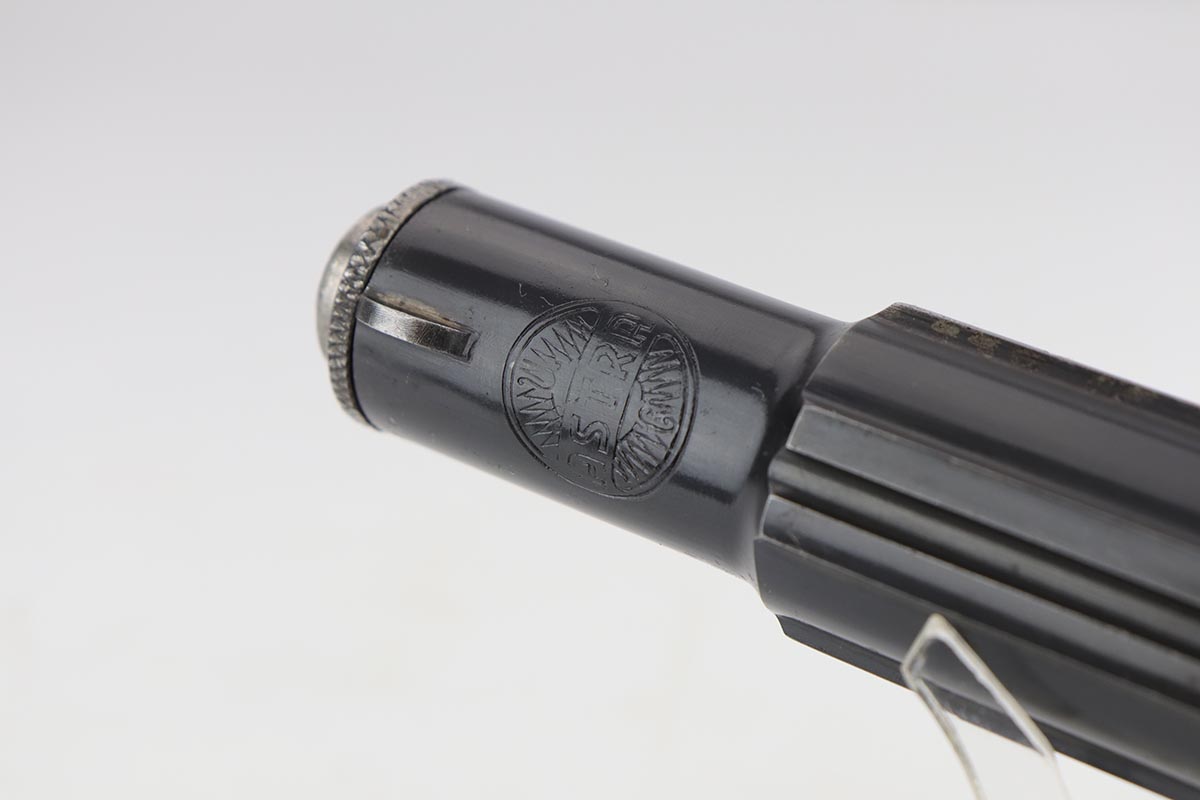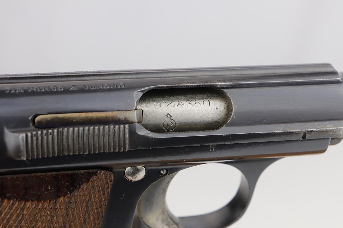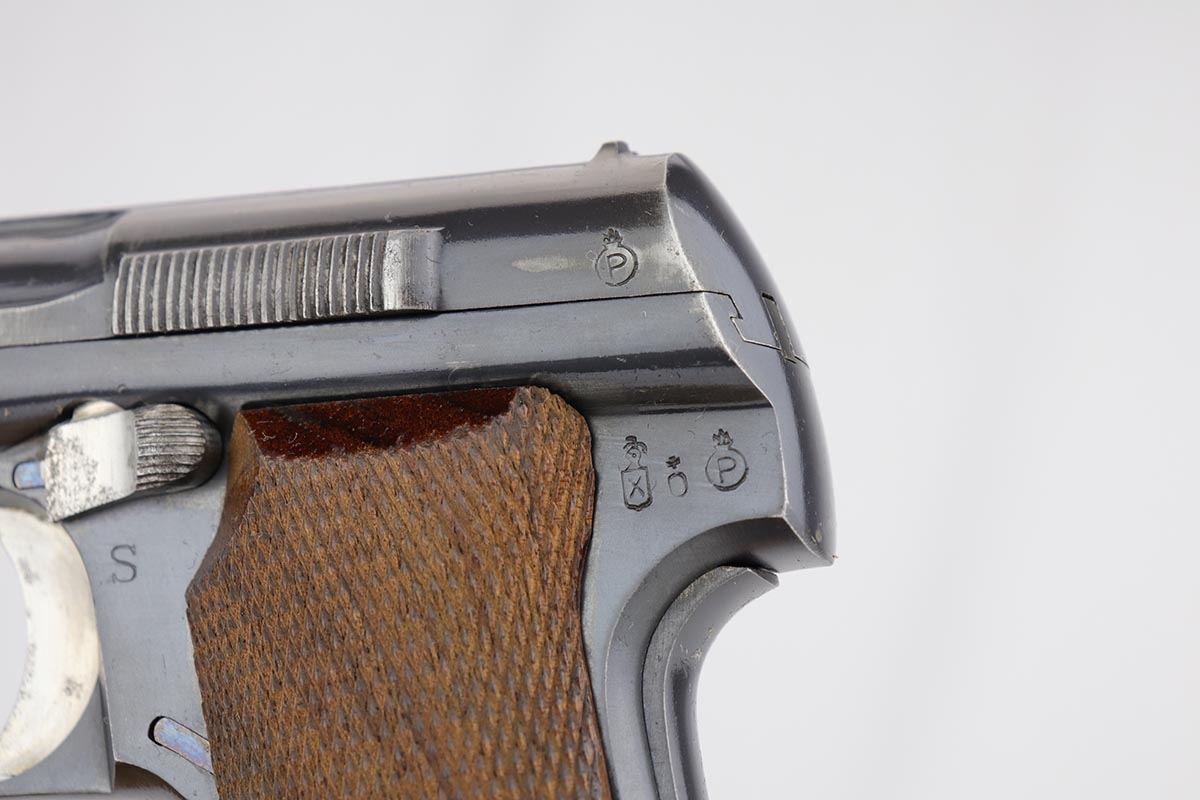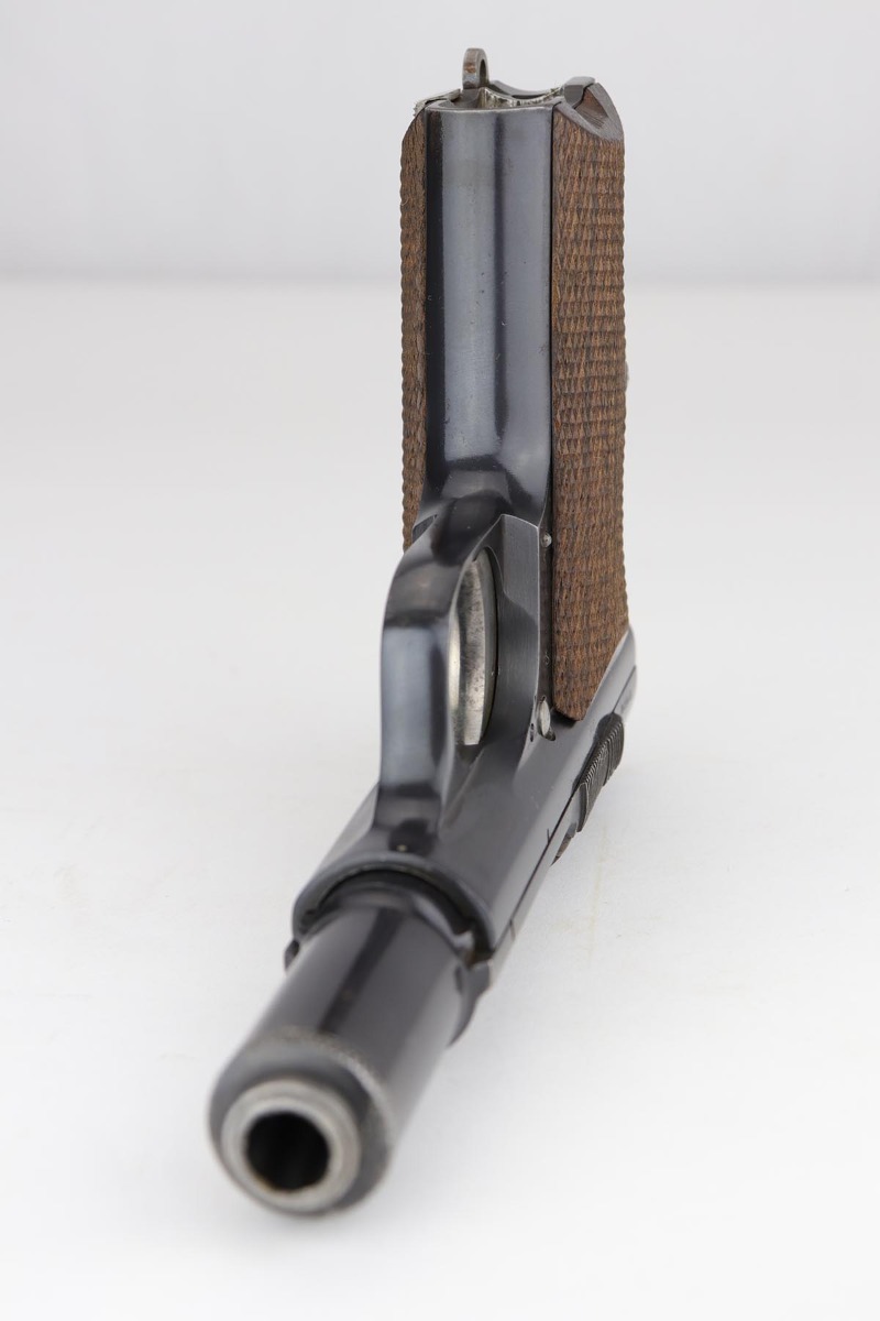 8/19/19 – This is an excellent, original Astra 300 that was part of the second contract order by the Nazi Army. This pistol was part of a batch that was delivered on April 1, 1944. There were only ~22,000 of this variation produced, with no waffenamt on the frame and chambered in 7.65mm. The original finish rates at about 97%, with minor edge wear in a few areas, and a spot of minor finish loss on the trigger guard and back strap. There are also a couple of scratches near the muzzle, likely from an attempt to remove the muzzle cap. Excellent bore and grips.